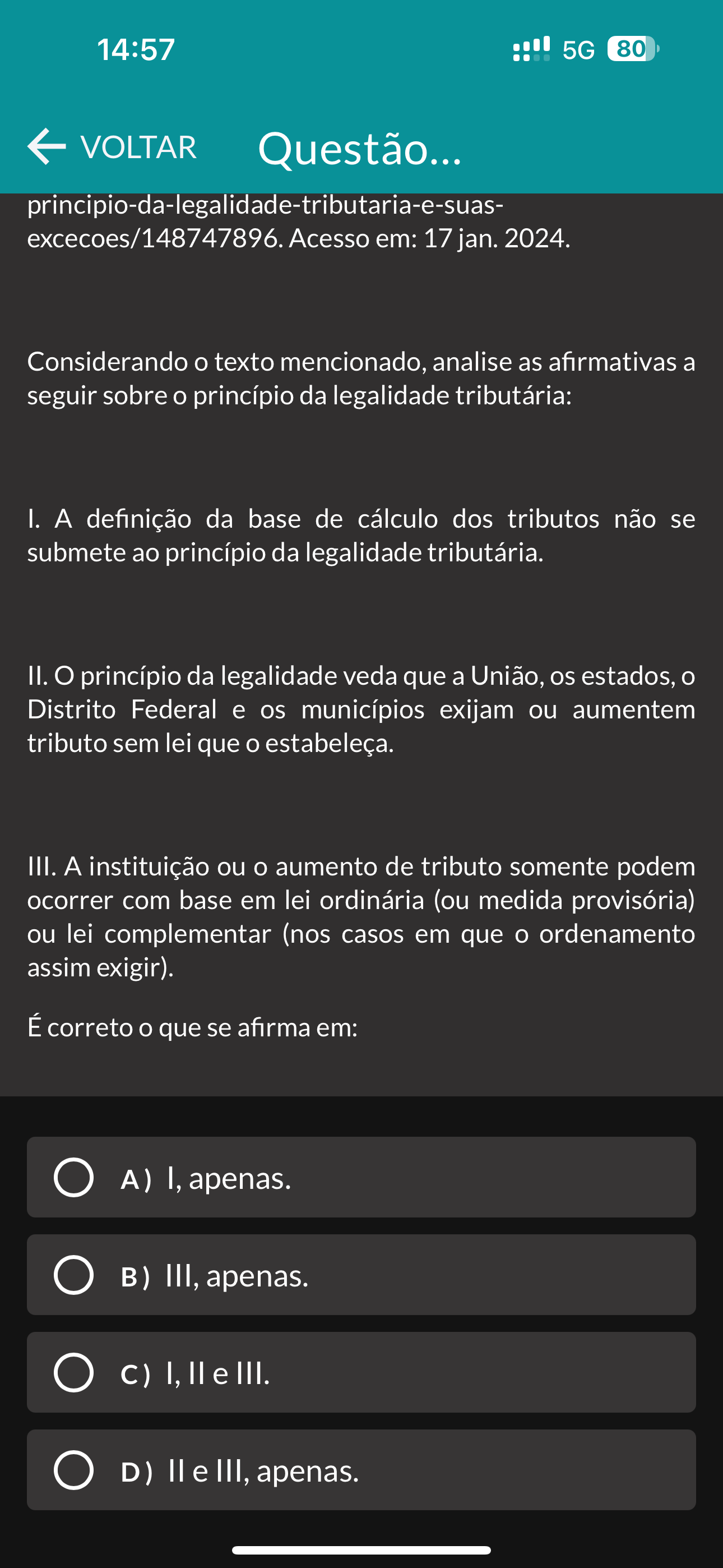 14:57 5G 80 VOLTAR Questão... excecoes/148747896. Acesso em: 17 jan. 2024. Considerando texto mencionado, analise as afirmativas a seguir sobre princípio da legalidade tributária: I. A definição da base de cálculo dos tributos não se submete ao princípio da legalidade tributária. II. princípio da legalidade veda que a União, os estados, Distrito Federal e os municípios exijam ou aumentem tributo sem lei que estabeleça. III. A instituição ou aumento de tributo somente podem ocorrer com base em lei ordinária (ou medida provisória) ou lei complementar (nos casos em que ordenamento assim exigir). É correto que se afirma em: A) I, apenas. B) III, apenas. C) I, e III. D) e III, apenas.