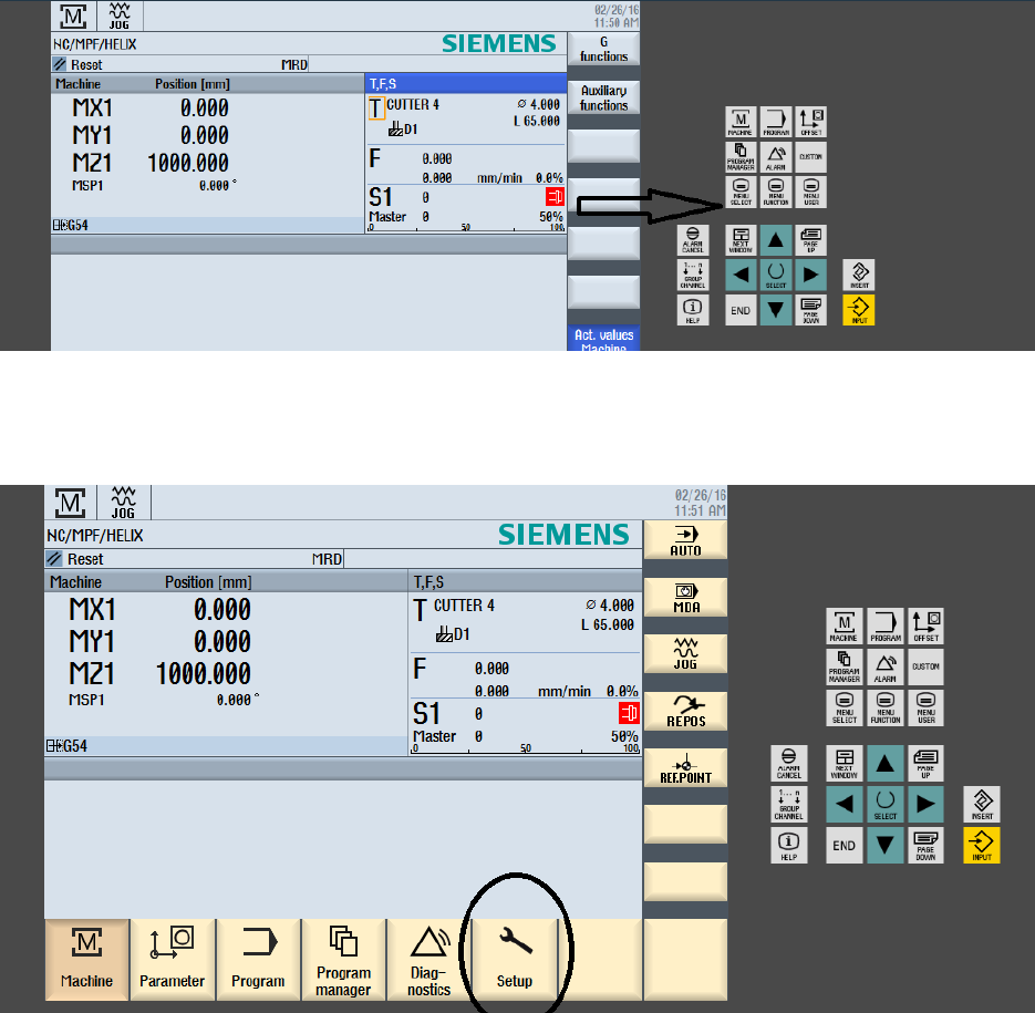 1 – Selecionar tecla MENU SELECT no painel 2 – Selecionar menu Setup 3 – Selecionar System data 4 – Abrir a pasta Definitions e pressionar o menu New ( acima à direita ) 5 – Selecionar a seta para baixo, conforme a figura acima Abrirá uma janela para seleção de variáveis. 6 – Selecionar a variável GUD4 ( em vermelho conforme figura acima ) e depois clicar em OK, conforme figura acima ( em preto ) Irá abrir o editor da GUD4 7 – Digitar o seguinte texto: REDEF $MN_MM_EXTERN_LANGUAGE APR 7 APW 7 M17 ( como na figura acima ) Apagar o M30 8 – Após a edição do texto, voltar a página anterior, conforme a figura acima ( em preto) 9 – Fechar a variável ( tecla close – acima ) 10 - Será questionado sobre salvar a variável GUD4 – clicar OK ( figura acima ) O software confirma que a GUD4 está ativa. 11 - Pressionar OK ( verde ) novamente. 12 - Voltar para a tela de máquina geral através do botão Machine M ( figura acima ) 13 - Ativar MODO MDA Em modo MDA, editar: $MN_MM_EXTERN_LANGUAGE = 1 M30 14 - Pressionar Cycle Start para ativar MDI ( figura acima ) Nesse momento o dado de máquina foi ativado. Isso tudo é feito para que o dado de máquina 18800 fique em 1H ( original 0H ). Você pode , caso queira, conferir o resultado, pressionando novamente no painel a tecla de MENU SELECT / depois o menu SETUP / e enfim o menu GENERAL MD / procurar dado de máquina 18800. 15 - Para que o dado seja gravado, é necessário reiniciar a máquina. Nesse caso, acima em Machine ( seta ) clicar e solicitar o Restart O software irá iniciar novamente. Para um teste, sugerimos um programa que chame G291, como acima. Em automático e pressionando o ciclo start para o teste. Não pode ocorrer nenhum alarme.