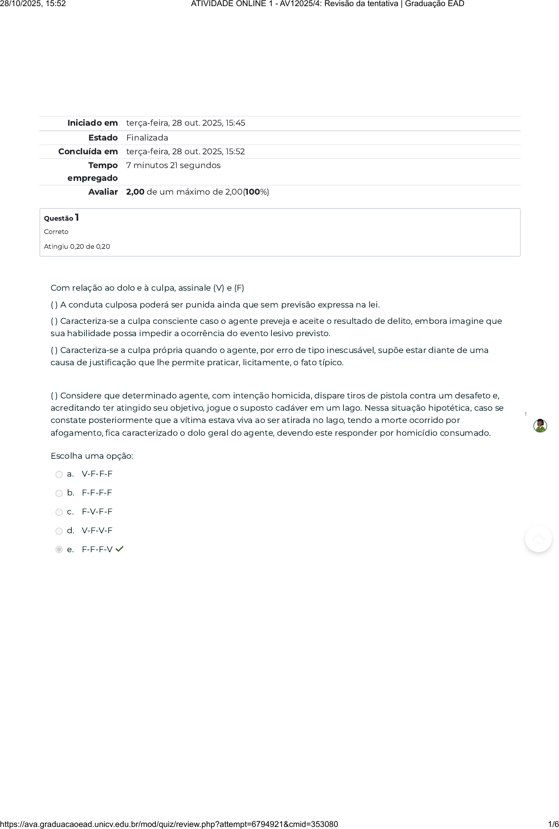 Iniciado em terça-feira, 28 out. 2025, 15:45 Estado Finalizada Concluída em terça-feira, 28 out. 2025, 15:52 Tempo empregado 7 minutos 21 segundos Avaliar 2,00 de um máximo de 2,00(100%) Questão 1 Correto Atingiu 0,20 de 0,20 Com relação ao dolo e à culpa, assinale (V) e (F) ( ) A conduta culposa poderá ser punida ainda que sem previsão expressa na lei. ( ) Caracteriza-se a culpa consciente caso o agente preveja e aceite o resultado de delito, embora imagine que sua habilidade possa impedir a ocorrência do evento lesivo previsto. ( ) Caracteriza-se a culpa própria quando o agente, por erro de tipo inescusável, supõe estar diante de uma causa de justificação que lhe permite praticar, licitamente, o fato típico. ( ) Considere que determinado agente, com intenção homicida, dispare tiros de pistola contra um desafeto e, acreditando ter atingido seu objetivo, jogue o suposto cadáver em um lago. Nessa situação hipotética, caso se constate posteriormente que a vítima estava viva ao ser atirada no lago, tendo a morte ocorrido por afogamento, fica caracterizado o dolo geral do agente, devendo este responder por homicídio consumado. Escolha uma opção: a. V-F-F-F b. F-F-F-F c. F-V-F-F d. V-F-V-F e. F-F-F-V ✓ 1 28/10/2025, 15:52 ATIVIDADE ONLINE 1 - AV12025/4: Revisão da tentativa | Graduação EAD https://ava.graduacaoead.unicv.edu.br/mod/quiz/review.php?attempt=6794921&cmid=353080 1/6 Questão 2 Correto Atingiu 0,20 de 0,20 O Direito Penal é um ramo do Direito público e é chamado do “direito das condutas ilícitas” e se divide em Direito Penal Objetivo e Direito Penal Subjetivo. É a nossa principal fonte, ou seja, é dele que emanam os comandos necessários para que ocorra a repressão aos crimes e se divide em: Escolha uma opção: a. Não possui nenhuma divisão. b. Parte Geral: Não trata de crimes. Aqui estão previstas as regras de como os crimes irão se portar de acordo com a conduta de quem os praticou. Vai do Art. 1º ao Art. 359. c. Parte Geral: Não trata de crimes. Aqui estão previstas as regras de como os crimes irão se portar de acordo com a conduta de quem os praticou. Essa parte vai do Art. 1º ao Art. 120º. Parte Especial: Aqui estão previstos os crimes em espécie e as normas explicativas, bem como outros institutos que iremos trabalhar. A parte especial está prevista no Art. 121 ao Art. 359. Parte especial 2: Aqui estão previstos outros crimes em espécie e vai do Art. 360 ao 400. d. Parte Especial: onde estão previstos os crimes em espécie e as normas explicativas, bem como outros institutos que iremos trabalhar. A parte especial está prevista no Art. 1º ao Art. 359. e. Parte Geral: Não trata de crimes. Aqui estão previstas as regras de como os crimes irão se portar de acordo com a conduta de quem os praticou. Essa parte vai do Art. 1º ao Art. 120º. Parte Especial: Aqui estão previstos os crimes em espécie e as normas explicativas, bem como outros institutos que iremos trabalhar. A parte especial está prevista no Art. 121 ao Art. 359. ✓ 1 28/10/2025, 15:52 ATIVIDADE ONLINE 1 - AV12025/4: Revisão da tentativa | Graduação EAD https://ava.graduacaoead.unicv.edu.br/mod/quiz/review.php?attempt=6794921&cmid=353080 2/6 Questão 3 Correto Atingiu 0,20 de 0,20 Questão 4 Correto Atingiu 0,20 de 0,20 Em relação aos princípios no Direito Penal Brasileiro, considere as seguintes assertivas e marque verdadeiro ou falso: ( ) A) Princípio da Subsidiariedade - A atuação do Direito Penal é cabível unicamente quando os outros ramos do Direito e os demais meios estatais de controle social tiverem se revelado impotentes para o controle da ordem pública. ( ) B) Princípio da Fragmentariedade - não há infração penal quando a conduta não tiver oferecido ao menos perigo de lesão ao bem jurídico (MASSON, 2017, p. 53). Trata-se de uma classificação que leva em conta a existência de efetiva lesão ao bem jurídico ou a exposição deste a uma situação de perigo (concreto ou abstrato). ( ) C) Princípio da Ampla Defesa: “As partes podem utilizar, no processo, todos os meios de defesa não proibidos pela lei” (art. 5º, LV, da CF) ( ) D) Princípio do Contraditório: “Todas as partes serão consideradas da mesma forma no processo, tendo as mesmas possibilidades e oportunidades durante o mesmo” (art. 5º, LV, da CF). Escolha uma opção: a. V, F, V, V ✓ b. V, V, V, V c. F, F, F, V d. V, V, F, V e. F, F, V, V O direito penal só deve se preocupar com a proteção dos bens jurídicos mais essenciais à vida em sociedade, constituindo a sua intervenção a ultima ratio, ou seja, tal intervenção somente será exigida quando não se fizer suficiente a proteção proporcionada pelos demais ramos do direito. Tal conceito tem relação com o princípio da: Escolha uma opção: a. Intervenção Mínima ✓ b. Intranscendência, c. Reserva Legal d. Proporcionalidade e. Anterioridade 1 28/10/2025, 15:52 ATIVIDADE ONLINE 1 - AV12025/4: Revisão da tentativa | Graduação EAD https://ava.graduacaoead.unicv.edu.br/mod/quiz/review.php?attempt=6794921&cmid=353080 3/6 Questão 5 Correto Atingiu 0,20 de 0,20 Questão 6 Correto Atingiu 0,20 de 0,20 O princípio da Intransmissibilidade da Pena, elencado no art. 5º, XLV, da CF, dispõe que: “Nenhuma pena passará da pessoa do condenado”, ou seja, a pena não passará da pessoa do condenado. Considere as seguintes situações: I - João matou um homem que ofendeu a honra de seu pai José, a pedido deste. Assim, como o crime foi cometido para defender a honra José, ele quem deverá responder pelo crime de homicídio praticado por João. II - Maria cometeu um delito de roubo e pouco tempo depois de ter sido condenada, veio à óbito. A vítima do delito pediu então que Joana, filha de Maria, fosse presa em seu lugar. Este pedido foi negado pela Autoridade competente, que alegou não ser possível que a pena fosse transmitida para outra pessoa. III - Eduardo foi contratado por Pedro