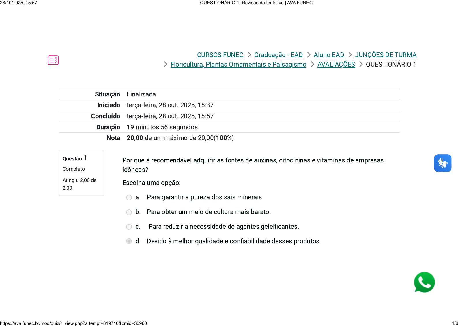CURSOS FUNEC 〉 Graduação - EAD 〉 Aluno EAD 〉 JUNÇÕES DE TURMA 〉 Floricultura, Plantas Ornamentais e Paisagismo 〉 AVALIAÇÕES 〉 QUESTIONÁRIO 1 Questão 1 Completo Atingiu 2,00 de 2,00 Situação Finalizada Iniciado terça-feira, 28 out. 2025, 15:37 Concluído terça-feira, 28 out. 2025, 15:57 Duração 19 minutos 56 segundos Nota 20,00 de um máximo de 20,00(100%) Por que é recomendável adquirir as fontes de auxinas, citocininas e vitaminas de empresas idôneas? Escolha uma opção: a. Para garantir a pureza dos sais minerais. b. Para obter um meio de cultura mais barato. c. Para reduzir a necessidade de agentes geleificantes. d. Devido à melhor qualidade e confiabilidade desses produtos 28/10/2025, 15:57 QUESTIONÁRIO 1: Revisão da tentativa | AVA FUNEC https://ava.funec.br/mod/quiz/review.php?attempt=819710&cmid=30960 1/6 https://ava.funec.br/course/index.php?categoryid=10 https://ava.funec.br/course/index.php?categoryid=17 https://ava.funec.br/course/index.php?categoryid=19 https://ava.funec.br/course/index.php?categoryid=77 https://ava.funec.br/course/view.php?id=2852 https://ava.funec.br/course/section.php?id=12947 Questão 2 Completo Atingiu 2,00 de 2,00 Questão 3 Completo Atingiu 2,00 de 2,00 O que é readaptação no contexto das plantas? Escolha uma opção: a. A transição das plantas para ambientes externos. b. A adaptação das plantas a ambientes internos. c. A preparação das plantas para o transporte. d. A restauração das funções vitais das plantas. Qual é a contribuição do Brasil para a produção mundial de flores? Escolha uma opção: a. Muito alta b. Moderada c. Alta d. Baixa 28/10/2025, 15:57 QUESTIONÁRIO 1: Revisão da tentativa | AVA FUNEC https://ava.funec.br/mod/quiz/review.php?attempt=819710&cmid=30960 2/6 Questão 4 Completo Atingiu 2,00 de 2,00 Questão 5 Completo Atingiu 2,00 de 2,00 Qual é o agente fitoregulador mais utilizado para o enraizamento ex vitro? Escolha uma opção: a. Ágar-ágar. b. Sacarose. c. AIB. d. Citocininas. Qual é a consequência de não alcançar o ponto de compensação luminosa durante a aclimatação de plantas em ambientes internos? Escolha uma opção: a. A planta pode morrer. b. A planta apresenta maior resistência. c. A planta produz mais folhas. d. A planta se adapta mais rapidamente. 28/10/2025, 15:57 QUESTIONÁRIO 1: Revisão da tentativa | AVA FUNEC https://ava.funec.br/mod/quiz/review.php?attempt=819710&cmid=30960 3/6 Questão 6 Completo Atingiu 2,00 de 2,00 Questão 7 Completo Atingiu 2,00 de 2,00 Qual fenômeno tende a se acentuar rapidamente na floricultura brasileira devido ao surgimento de novos polos regionais de produção? Escolha uma opção: a. Aumento da importação de produtos estrangeiros b. Diminuição do consumo per capita c. Maior diversificação do consumo d. Fechamento de floriculturas tradicionais O que é destacado como fator primordial de crescimento, conquista e manutenção das posições comerciais no mercado de flores e plantas ornamentais? Escolha uma opção: a. Preços elevados b. Embalagens simples c. Logística complexa d. Inovação 28/10/2025, 15:57 QUESTIONÁRIO 1: Revisão da tentativa | AVA FUNEC https://ava.funec.br/mod/quiz/review.php?attempt=819710&cmid=30960 4/6 Questão 8 Completo Atingiu 2,00 de 2,00 Questão 9 Completo Atingiu 2,00 de 2,00 Quais são os principais polos de produção de flores no Brasil? Escolha uma opção: a. Região Sul b. Região Sudeste c. Região Centro-Oeste d. Região Nordeste O que é importante considerar ao escolher o solo para plantas como cactos e suculentas? Escolha uma opção: a. Solo compactado. b. Rico em matéria orgânica. c. Pouca drenagem. d. Solo argiloso. 28/10/2025, 15:57 QUESTIONÁRIO 1: Revisão da tentativa | AVA FUNEC https://ava.funec.br/mod/quiz/review.php?attempt=819710&cmid=30960 5/6 Questão 10 Completo Atingiu 2,00 de 2,00 --> Como as plantas como Ficus e Crisântemos geralmente reagem a correntes de ar? Escolha uma opção: a. Toleram correntes de ar moderadas. b. Não gostam de correntes de ar. c. São resistentes a correntes de ar. d. Preferem correntes de ar constantes. Atividade anter ior Cenário da Floricultura e Plantas Ornamentais Seguir para... 28/10/2025, 15:57 QUESTIONÁRIO 1: Revisão da tentativa | AVA FUNEC https://ava.funec.br/mod/quiz/review.php?attempt=819710&cmid=30960 6/6 https://ava.funec.br/mod/page/view.php?id=30943&forceview=1