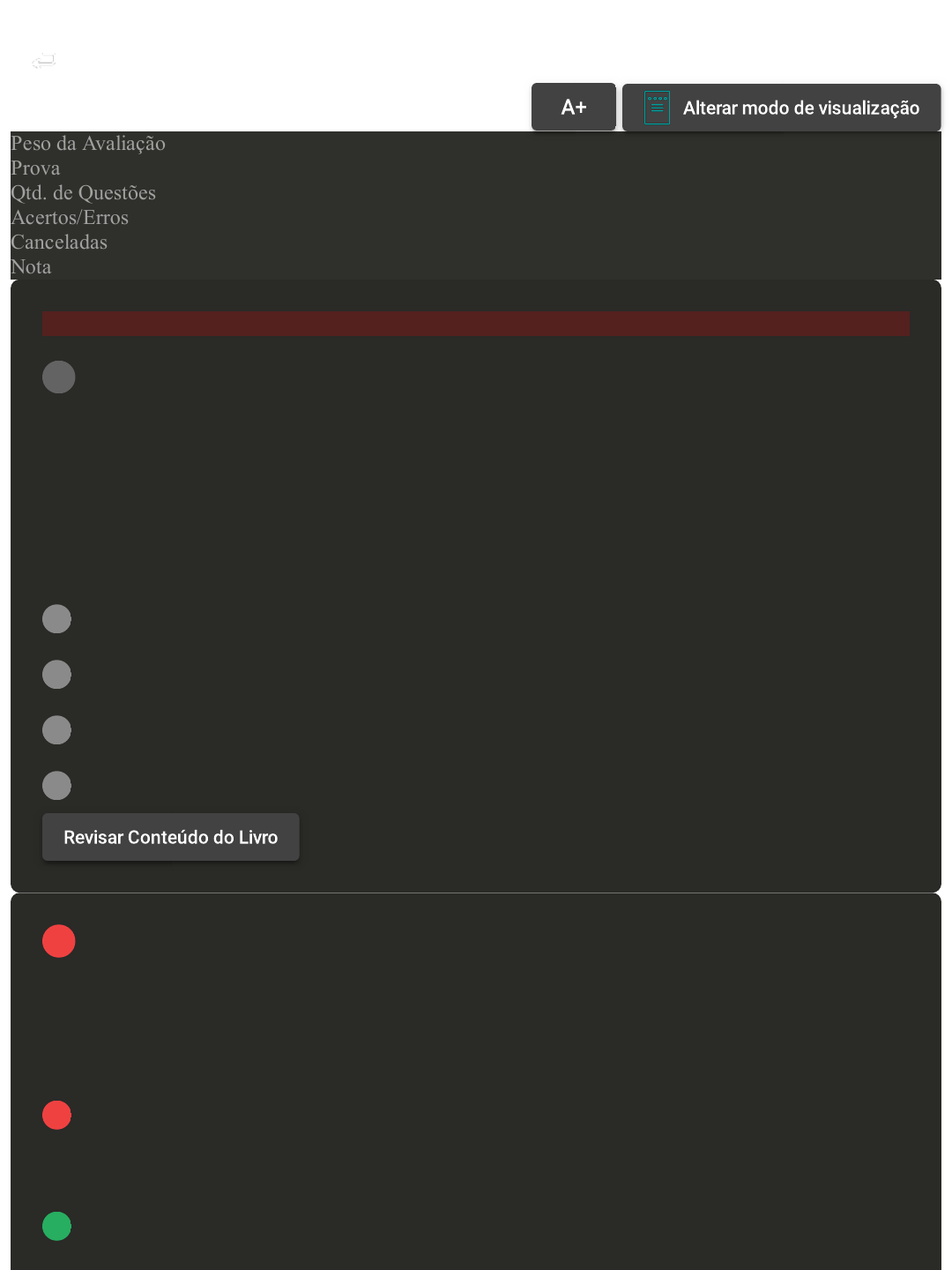 Prova Impressa GABARITO | Avaliação I - Individual (Cod.:690891) Peso da Avaliação 1,50 Prova 39976674 Qtd. de Questões 10 Acertos/Erros 4/3 Canceladas 3 Nota 7,00 Atenção: Esta questão foi cancelada, porém a pontuação foi considerada. “A Saúde Coletiva pode ser considerada como um campo de conhecimento de natureza interdisciplinar cujas disciplinas básicas são a epidemiologia, o planejamento/administração de saúde e as ciências sociais em saúde”. (PAIM; ALMEIDA FILHO, 2000, p. 63). Classifique V para as sentneças verdadeiras e F para as falsas: ( ) Foco na diversidade e especificidade dos grupos populacionais. ( ) É pautado no campo científico/acadêmico. ( ) Atua na prevenção, é multidisciplinar, medicina social. ( ) É assistencial, curativa.Assinale a alternativa que apresenta a sequência CORRETA: A V – F – F – V. B V – V – F – V. C F – F – V – V. D F – F – F – V. “A disciplinaridade, a pluridisciplinaridade, a interdisciplinaridade e a transdisciplinaridade são quatro flechas de um único e mesmo arco: o conhecimento”. No que se refere o termo citado, assinale a alternativa CORRETA: A Equidade. B Universalidade. C Integralidade. D Transdisciplinaridade. 1 2 Avaliação I - Individual https://ava2.uniasselvi.com.br/subject/grades-and-tests/answer-book/ey... 1 of 5 28/10/2025, 17:17 Tipo de Saúde que estabelece o direito do cidadão em ter saúde, disponibiliza meios para a manutenção e sustentação da vida, é mais ampla e está centralizada na figura do médico, é assistencial e curativa. Assinale a alternativa CORRETA: A Coletiva. B Pública. C Emergencial. D Privada. Atenção: Esta questão foi cancelada, porém a pontuação foi considerada. Compreender o conceito de saúde é fundamental para um profissional da área da saúde. Sobre o conceito de saúde, assinale a alternativa INCORRETA: A Os conceitos de saúde vão desde a ausência de doença, harmonia com a realidade e até desenvolvimento humano como um todo. B Saúde é quando um indivíduo apresenta a ausência de doenças. C Saúde é uma disposição de completo bem-estar físico, mental e social, com ausência total de qualquer doença. D O conceito de saúde proposto pelo Art.196 da Constituição da República Federativa do Brasil, de 5 de outubro de 1988 que diz: “A saúde é direito de todos e dever do Estado, garantido mediante políticas sociais e econômicas que visem á redução do risco de doença e de outros agravos e ao acesso universal e igualitário às ações e serviços para sua promoção, proteção e recuperação”. Educar em saúde é compreender os problemas de determinada comunidade e tentar levar consciência desses problemas buscando soluções, baseada no diálogo, na troca de experiências, havendo uma ligação entre o saber científico e o saber popular. Sobre os eixos que compõe a educação em saúde, assinale alternativa INCORRETA: A Desestimular os saberes e as práticas desenvolvidos pelas comunidades para melhoria da qualidade de vida. B Pesquisar as ações da promoção da saúde de modo a construir estratégias com crescente efetividade e eficácia. 3 4 5 Avaliação I - Individual https://ava2.uniasselvi.com.br/subject/grades-and-tests/answer-book/ey... 2 of 5 28/10/2025, 17:17 C Sistematizar, consolidar e divulgar informações e evidências no campo da promoção da saúde. D Estabelecer parceria com os meios de comunicação de modo a veicular conteúdo informativos e educativos em saúde. A recuperação da saúde, que ocorre após a identificação de fatores de risco e busca evitar que o problema se torne crônico, por meio de diagnóstico e intervenção precoces é chamada: Assinale a alternativa CORRETA: A Prevenção quaternária. B Prevenção primária. C Prevenção secundária. D Prevenção terciária. Ditadura militar é o regime político no qual membros das Forças Armadas de um país centralizam política e administrativamente o poder do Estado em suas mãos, negando à maior parte dos cidadãos a participação e a decisão nas instituições estatais. Sobre qual movimento teve como ponto de partida em meio a ditadura militar na década de 60, assinale a alternativa CORRETA: A Reforma Trabalhista. B Formação dos Postos de Saúde Coletiva. C Implantação do SUS. D Reforma Sanitária. Comunicação em saúde diz respeito ao estudo e utilização de estratégias de comunicação para informar e influenciar as decisões dos indivíduos e das comunidades no sentido de promoverem a sua saúde. Sobre os níveis que compõe a comunicação verbal da saúde, assinale a alternativa CORRETA: A Ambiente favorável, comunidade, interpessoal. 6 7 8 Avaliação I - Individual https://ava2.uniasselvi.com.br/subject/grades-and-tests/answer-book/ey... 3 of 5 28/10/2025, 17:17 B Ambiente favorável, comunidade e pessoal. C Ambiente físico, trabalhadores e interpessoal. D Ambiente da saúde, comunidade e intrapessoal. Atenção: Esta questão foi cancelada, porém a pontuação foi considerada. Durante muito tempo, a saúde foi entendida simplesmente como o estado de ausência de doença. Considerada insatisfatória, esta definição de saúde foi substituída por outra, que engloba bem-estar físico, mental e social. De acordo com os eixos de atuação da saúde que compõem a integralidade, assinale a alternativa CORRETA: A Estimular e fortalecer a relação dos serviços de saúde com os territórios em que se localizam. B Estimular e fortalecer o trabalho individual. C Estimular e fortalecer a organização do trabalho em equipes multiprofissionais. D Estimular e fortalecer práticas no campo da atenção à saúde que favoreçam o uso adequado de medicamentos e à desmedicalização sempre que possível. É considerada Saúde Pública todo o conjunto de medidas executadas pelo Estado para garantir o bem- estar físico, mental e social da população. Em nível internacional, a saúde pública é coorde