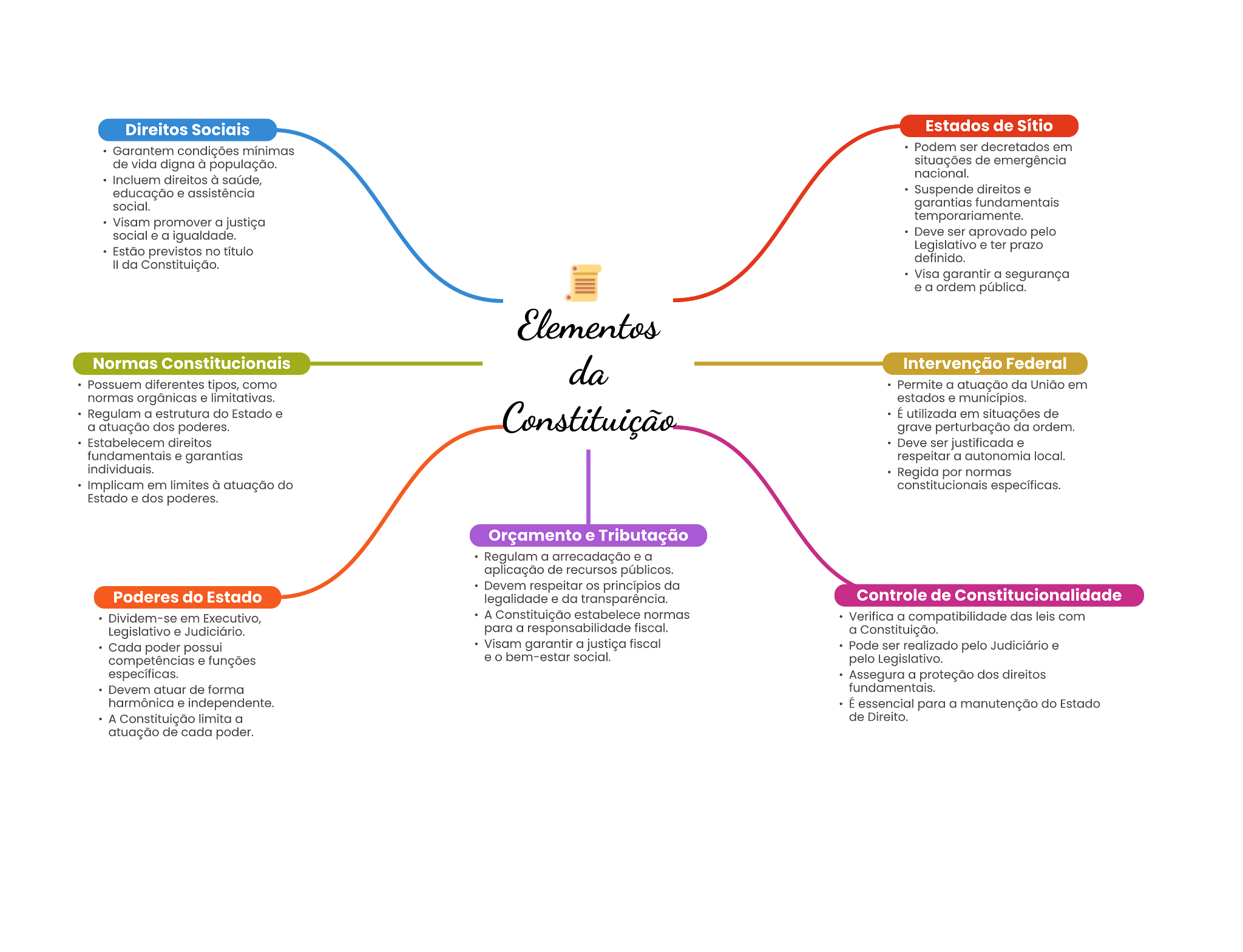 Direitos Sociais Estados de Sítio Garantem condições Podem ser decretados em de vida digna à população. de emergência Incluem à saúde, educação assistência Suspende direitos social. Visam promover a justiça temporariamente. social a igualdade. Dave ser aprovado pelo Estão previstos no título Legislativo ter prazo definido. da Constituição. Visa a segurança a ordem pública. Normas Constitucionais Intervenção Federal Possuem diferentes tipos, como Permite a atuação da União em normas orgânicas estados Regulam a estrutura do Estado . É utilizada em de a atuação dos poderes. grave perturbação da ordem. Estabelecem direitos Dave ser justificada . garantias respeitar a autonomia local. individuals. Regida por normas Implicam em limites atuação do Estado . dos poderse. Orçamento e Tributação Regulam a arrecadação a aplicação de recursos Devem da Poderes do Estado legalidade da Controle de Constitucionalidade Dividern-se em Executivo, A Constituição normas Verifica a compatibilidade das com para a responsabilidade fiscal. a Constituição. Cada poder Visam garantir a justiça Pode ser realizado pelo Judiciário . funções pelo Legislativo. específicas. Assegura a dos direitos Devem atuar de forma fundamentals. harmônica É essencial para a manutenção do Estado A Constituição limita a de Direito. atuação de cada poder.