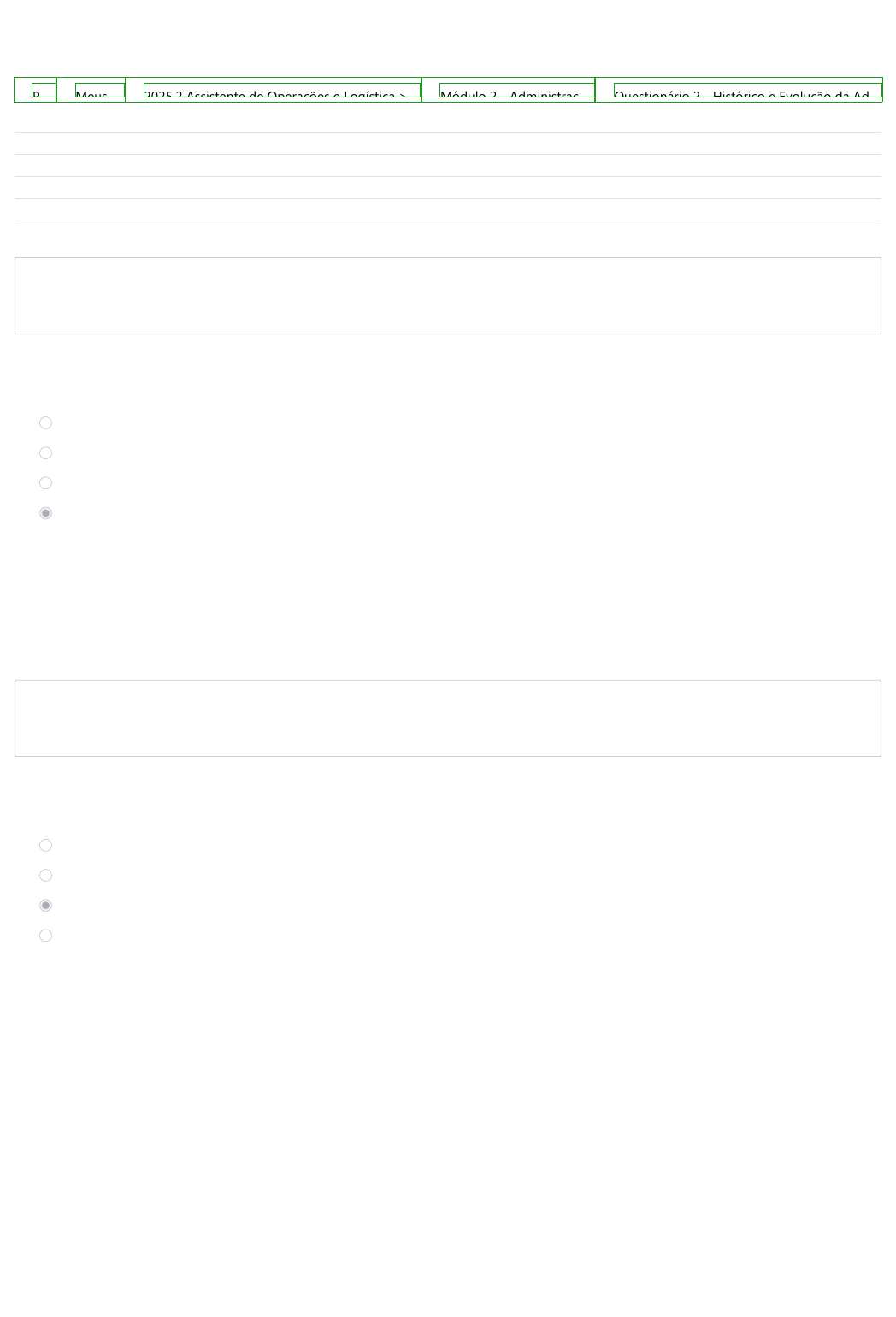 Situação Finalizada Iniciado domingo, 28 set. 2025, 09:28 Concluído domingo, 28 set. 2025, 09:36 Duração 8 minutos 38 segundos Nota 10,00 de um máximo de 10,00(100%) Questão 1 Correto Atingiu 1,00 de 1,00 Questão 2 Correto Atingiu 1,00 de 1,00 P… Meus … 2025.2 Assistente de Operações e Logística >… Módulo 2 - Administraç… Questionário 2 - Histórico e Evolução da Ad… Qual é a definição de "produtividade" conforme abordado na videoaula? a. Fazer menos com mais recursos, mas com melhor qualidade. b. Apenas aumentar o volume de produção, independentemente dos recursos. c. Fazer o mesmo com os mesmos recursos, mantendo a qualidade. d. Fazer mais com menos recursos, buscando constante melhoria da qualidade. Sua resposta está correta. A resposta correta é: Fazer mais com menos recursos, buscando constante melhoria da qualidade. A customização oferecida no modelo de "customização em massa" (exemplo do Spoleto) é: a. Exclusiva para clientes que pagam um valor adicional muito alto. b. Apenas uma ilusão, pois todos os pratos são pré-determinados. c. Limitada ao quantitativo de itens e combinações disponíveis no cardápio da empresa. d. Ilimitada, permitindo ao cliente pedir qualquer ingrediente que desejar. Sua resposta está correta. A resposta correta é: Limitada ao quantitativo de itens e combinações disponíveis no cardápio da empresa. https://ead.cpv.ifsp.edu.br/my/ https://ead.cpv.ifsp.edu.br/my/ https://ead.cpv.ifsp.edu.br/my/courses.php https://ead.cpv.ifsp.edu.br/my/courses.php https://ead.cpv.ifsp.edu.br/course/view.php?id=1391§ion=0 https://ead.cpv.ifsp.edu.br/course/view.php?id=1391§ion=0 https://ead.cpv.ifsp.edu.br/course/view.php?id=1391§ion=3 https://ead.cpv.ifsp.edu.br/course/view.php?id=1391§ion=3 https://ead.cpv.ifsp.edu.br/mod/quiz/view.php?id=33703 https://ead.cpv.ifsp.edu.br/mod/quiz/view.php?id=33703 Questão 3 Correto Atingiu 1,00 de 1,00 Questão 4 Correto Atingiu 1,00 de 1,00 Questão 5 Correto Atingiu 1,00 de 1,00 O que a Administração da Produção entende por "produção"? a. A transformação de um bem tangível ou intangível em outro bem tangível ou intangível de maior valor e/ou utilidade para o consumidor. b. O processo de descarte de resíduos industriais. c. A transformação de um bem tangível em outro, sem considerar intangíveis. d. Apenas a fabricação de bens tangíveis para estoque. Sua resposta está correta. A resposta correta é: A transformação de um bem tangível ou intangível em outro bem tangível ou intangível de maior valor e/ou utilidade para o consumidor. Quais são os três elementos principais que compõem o processo de produção, incluindo as adições mais recentes, conforme a aula? a. Mão de obra, máquinas e dinheiro. b. Inputs, processo de transformação (agregação de valor) e outputs (produtos, serviços, resíduos/lixo). c. Inputs, transformação e outputs (bens tangíveis ou intangíveis). d. Matérias-primas, produtos e vendas. Sua resposta está correta. A resposta correta é: Inputs, processo de transformação (agregação de valor) e outputs (produtos, serviços, resíduos/lixo). Qual é a principal característica do modelo de "produção artesanal"? a. Forte presença da figura do artesão, que domina todo o processo de produção do início ao fim. b. Foco na customização em massa de produtos. c. Divisão do trabalho e especialização da mão de obra. d. Produtos altamente padronizados em larga escala. Sua resposta está correta. A resposta correta é: Forte presença da figura do artesão, que domina todo o processo de produção do início ao fim. Questão 6 Correto Atingiu 1,00 de 1,00 Questão 7 Correto Atingiu 1,00 de 1,00 Questão 8 Correto Atingiu 1,00 de 1,00 O que caracteriza o modelo da "produção em massa", popularizado por Henry Ford? a. Produção em baixas quantidades com foco na mão de obra especializada em diversas tarefas. b. Aumento da produção de produtos padrões, padronização de processos e divisão do trabalho (figura do especialista). c. Priorização da flexibilidade na linha de produção e gestão da qualidade total. d. Alta diversificação de produtos para diferentes gostos. Sua resposta está correta. A resposta correta é: Aumento da produção de produtos padrões, padronização de processos e divisão do trabalho (figura do especialista). O modelo da "produção diversificada" da General Motors, sob Alfred Sloan, revolucionou a indústria ao: a. Reduzir drasticamente os custos de produção em comparação com a produção em massa. b. Focar exclusivamente na produção de um único modelo de carro em grande escala. c. Perceber que as pessoas tinham gostos e necessidades diferentes e propor mais de uma linha de produção com modelos e características variadas. d. Eliminar completamente a necessidade de estoques de materiais. Sua resposta está correta. A resposta correta é: Perceber que as pessoas tinham gostos e necessidades diferentes e propor mais de uma linha de produção com modelos e características variadas. Qual é o principal foco do "modelo japonês" ou "produção enxuta", associado à Toyota? a. Melhoria contínua, gestão da qualidade e flexibilidade na linha de produção, com foco na eficiência. b. Produção em grande volume de produtos padronizados para reduzir custos. c. Aumento da complexidade do negócio com múltiplas linhas de produção. d. A customização individualizada de cada produto desde o início do processo. Sua resposta está correta. A resposta correta é: Melhoria contínua, gestão da qualidade e flexibilidade na linha de produção, com foco na eficiência. Questão 9 Correto Atingiu 1,00 de 1,00 Questão 10 Correto Atingiu 1,00 de 1,00 O modelo da "customização ou diversificação em massa", que ganhou força a partir dos anos 2000, busca: a. Retornar aos modelos de produção com alta incerteza de venda para o produtor. b. Tentar utilizar o melhor dos sistemas de produção 