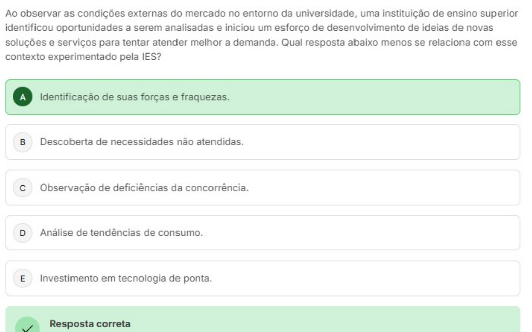 Ao observar as condições externas do mercado no entorno da universidade, uma instituição de ensino superior identificou oportunidades a serem analisadas e iniciou um esforço de desenvolvimento de ideias de novas soluções e serviços para tentar atender melhor a demanda. Qual resposta abaixo menos se relaciona com esse contexto experimentado pela IES? A Identificação de suas forças e fraquezas. Descoberta de necessidades não atendidas. C Observação de deficiências da concorrência. D Análise de tendências de consumo. E Investimento em tecnologia de ponta. Resposta correta