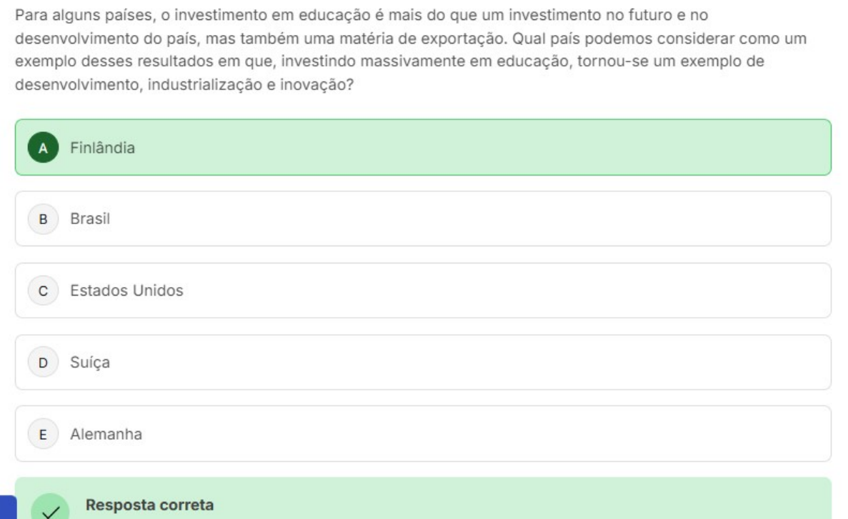Para alguns países, investimento em educação é mais do que um investimento no futuro e no desenvolvimento do país, mas também uma matéria de exportação. Qual país podemos considerar como um exemplo desses resultados em que, investindo massivamente em educação, tornou-se um exemplo de desenvolvimento, industrialização e inovação? A Finlândia Brasil C Estados Unidos D Suíça Alemanha Resposta correta