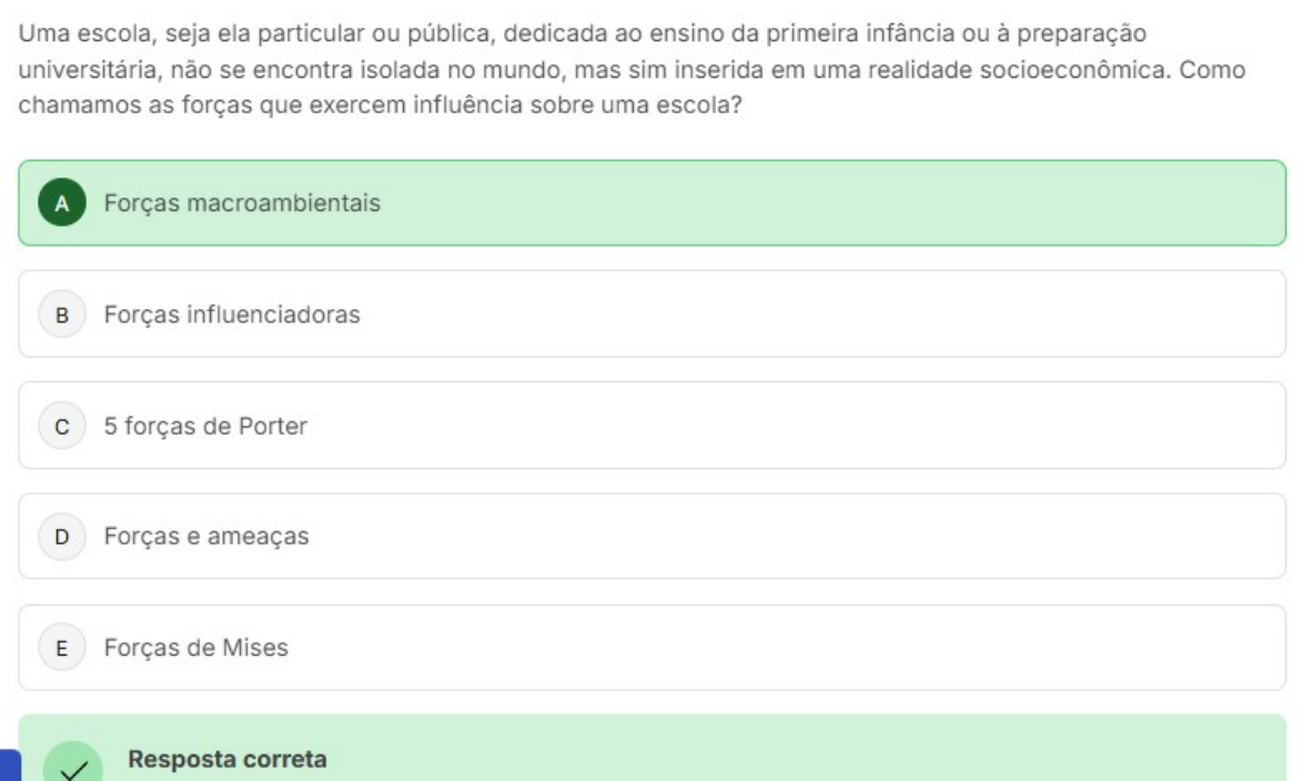 Uma escola, seja ela particular ou pública, dedicada ao ensino da primeira infância ou à preparação universitária, não se encontra isolada no mundo, mas sim inserida em uma realidade socioeconômica. Como chamamos as forças que exercem influência sobre uma escola? A Forças macroambientais B Forças influenciadoras C 5 forças de Porter D Forças e ameaças E Forças de Mises Resposta correta