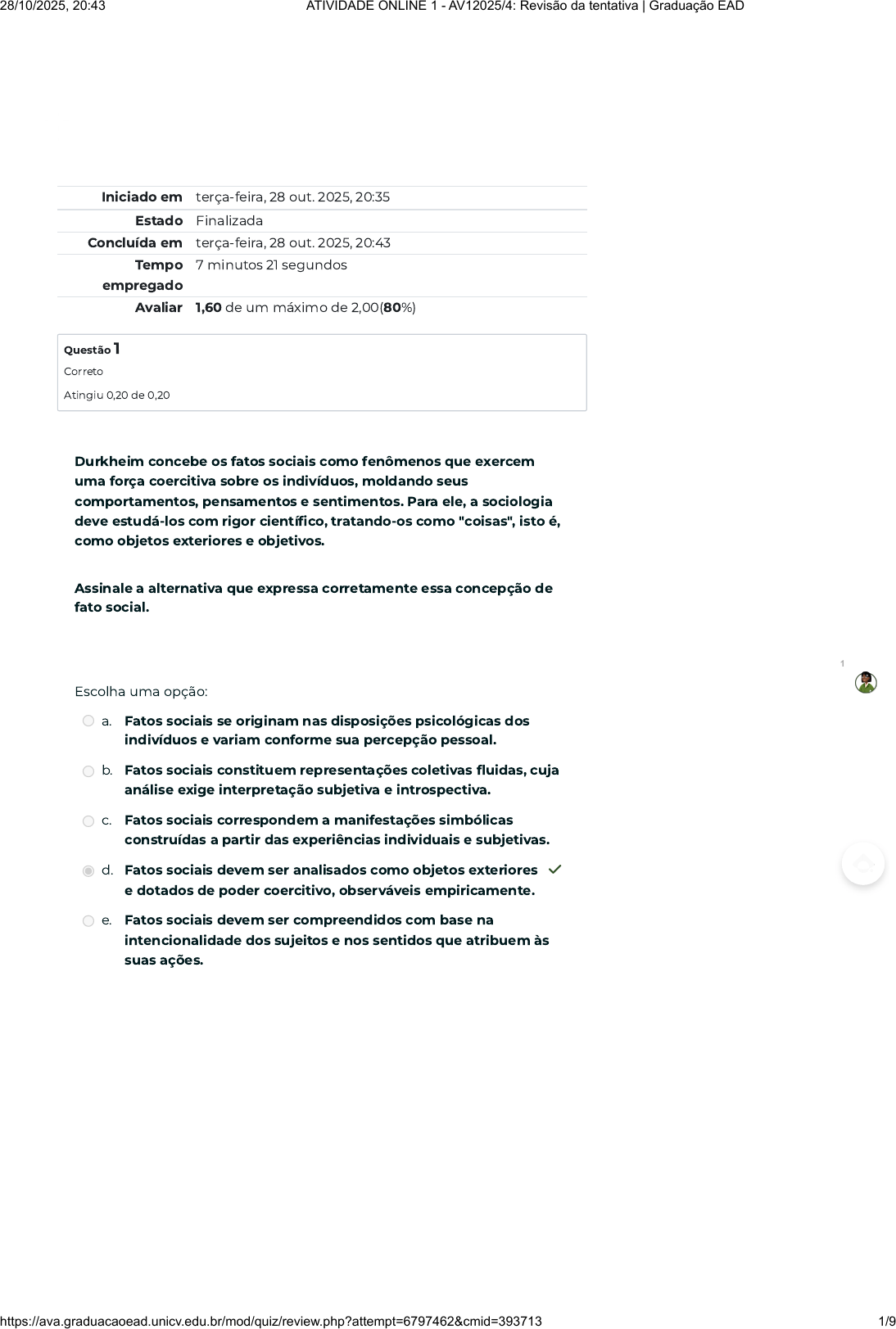 Iniciado em terça-feira, 28 out. 2025, 20:35 Estado Finalizada Concluída em terça-feira, 28 out. 2025, 20:43 Tempo empregado 7 minutos 21 segundos Avaliar 1,60 de um máximo de 2,00(80%) Questão 1 Correto Atingiu 0,20 de 0,20 Durkheim concebe os fatos sociais como fenômenos que exercem uma força coercitiva sobre os indivíduos, moldando seus comportamentos, pensamentos e sentimentos. Para ele, a sociologia deve estudá-los com rigor científico, tratando-os como "coisas", isto é, como objetos exteriores e objetivos. Assinale a alternativa que expressa corretamente essa concepção de fato social. Escolha uma opção: a. Fatos sociais se originam nas disposições psicológicas dos indivíduos e variam conforme sua percepção pessoal. b. Fatos sociais constituem representações coletivas fluidas, cuja análise exige interpretação subjetiva e introspectiva. c. Fatos sociais correspondem a manifestações simbólicas construídas a partir das experiências individuais e subjetivas. d. Fatos sociais devem ser analisados como objetos exteriores e dotados de poder coercitivo, observáveis empiricamente. ✓ e. Fatos sociais devem ser compreendidos com base na intencionalidade dos sujeitos e nos sentidos que atribuem às suas ações. 1 28/10/2025, 20:43 ATIVIDADE ONLINE 1 - AV12025/4: Revisão da tentativa | Graduação EAD https://ava.graduacaoead.unicv.edu.br/mod/quiz/review.php?attempt=6797462&cmid=393713 1/9 Questão 2 Incorreto Atingiu 0,00 de 0,20 Em sua obra O Suicídio (1897), Émile Durkheim classificou o suicídio em diferentes tipos, de acordo com o grau de integração e regulação social a que os indivíduos estão submetidos. Um desses tipos é o suicídio anômico, que ocorre em situações em que há uma ruptura ou enfraquecimento das normas sociais — como em crises econômicas, mudanças abruptas de status social ou períodos de instabilidade. Com base no conceito de Durkheim, assinale a alterativa realcionada ao suicídio anômico. Escolha uma opção: a. À solidão provocada pela vida urbana. b. À ausência de normas sociais claras em períodos de crise. c. Ao excesso de religiosidade em sociedades modernas. d. À integração excessiva do indivíduo ao grupo. e. À falta de objetivos pessoais. × 1 28/10/2025, 20:43 ATIVIDADE ONLINE 1 - AV12025/4: Revisão da tentativa | Graduação EAD https://ava.graduacaoead.unicv.edu.br/mod/quiz/review.php?attempt=6797462&cmid=393713 2/9 Questão 3 Correto Atingiu 0,20 de 0,20 Durkheim, ao estudar o suicídio como um fato social, identificou a anomia como uma das condições sociais que podem levar o indivíduo ao suicídio. Esse conceito descreve momentos em que as normas sociais perdem força ou se tornam insuficientes para orientar o comportamento, especialmente em contextos de mudança abrupta. Com base nessa concepção, assinale a alternativa que expressa corretamente a noção de anomia segundo Durkheim. Escolha uma opção: a. A anomia está associada à rigidez normativa em sociedades tradicionais, onde as regras morais impedem a livre expressão individual. b. A anomia surge da completa ausência de vínculos sociais, sendo característica exclusiva de sociedades individualistas modernas. c. Trata-se de um estado de equilíbrio social, marcado pela adaptação gradual dos indivíduos às transformações econômicas e culturais. d. A anomia reflete a ausência de padrões reguladores claros, gerando desorientação nos indivíduos diante de mudanças bruscas na estrutura social. ✓ e. O conceito de anomia diz respeito à tendência natural do ser humano de se rebelar contra normas sociais impostas externamente. 1 28/10/2025, 20:43 ATIVIDADE ONLINE 1 - AV12025/4: Revisão da tentativa | Graduação EAD https://ava.graduacaoead.unicv.edu.br/mod/quiz/review.php?attempt=6797462&cmid=393713 3/9 Questão 4 Incorreto Atingiu 0,00 de 0,20 Ao estabelecer as bases da sociologia como ciência, Émile Durkheim propôs uma metodologia específica para o estudo dos fenômenos sociais. Em sua obra As Regras do Método Sociológico (1895), ele defende que os fatos sociais — como normas, valores, instituições e regras coletivas — devem ser observados com o mesmo rigor com que se estudam os objetos das ciências naturais. Nesse sentido, sua famosa orientação metodológica ficou conhecida pela máxima de que, “os fatos sociais devem ser tratados como coisas” (Durkheim, 1895). Assinale a alternativa que apresenta o objetivo da afirmação de Durkheim. Escolha uma opção: a. Propor que as crenças individuais do pesquisador sejam fundamentais para a explicação dos fatos sociais, orientando toda a pesquisa. b. Sugerir que o sociólogo mantenha distanciamento e neutralidade, utilizando procedimentos científicos na observação dos fenômenos sociais. c. Valorizar interpretações subjetivas e experiências individuais, destacando o papel das percepções pessoais na análise dos fatos sociais. d. Incentivar o estudo dos fatos sociais com objetividade e métodos científicos, buscando afastar opiniões pessoais e manter o rigor nas análises. × 1 28/10/2025, 20:43 ATIVIDADE ONLINE 1 - AV12025/4: Revisão da tentativa | Graduação EAD https://ava.graduacaoead.unicv.edu.br/mod/quiz/review.php?attempt=6797462&cmid=393713 4/9 Questão 5 Correto Atingiu 0,20 de 0,20 Durkheim buscou consolidar a Sociologia como uma ciência autônoma, com método próprio e rigor comparável ao das ciências naturais. Para isso, propôs que os fatos sociais — como normas, crenças, costumes e instituições — fossem tratados como realidades objetivas, exteriores ao indivíduo e dotadas de poder coercitivo. Essa abordagem visava garantir a objetividade da análise sociológica, evitando explicações baseadas apenas em percepções subjetivas ou individuais. Com base nessa concepção, assinale a alternativa que expressa corretamente o princípio metodológico adotado por Durkheim. Escolha uma opção: a. O pesquisador deve tratar os f