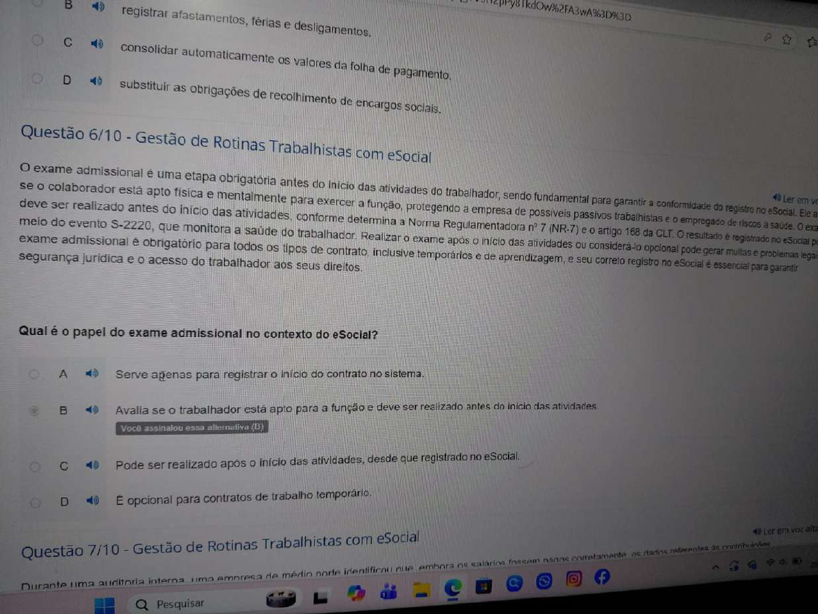 B registrar férias e desligamentos. C consolidar automaticamente os valores da folha de D substituir as obrigações de recolhimento de encargos sociais. Questão 6/10 Gestão de Rotinas Trabalhistas com eSocial se exame o colaborador admissional está apto é uma física etapa e mentalmente obrigatória antes para do exercer das a função, atividades do trabalhador, sendo fundamental para garantir a conformidade do registro no Ler em Ele exame meio deve do ser admissional evento realizado S-2220, antes obrigatório que do início monitora das a atividades, saúde do conforme trabalhador. determina Realizar a protegendo Norma exame Regulamentadora após a empresa das de atividades possíveis 7 (NR-7) passivos e considerá-lo artigo trabalhistas 168 da CLT. e 0 empregado resultado é de registrado riscos à saúde. no eSocial legais exa segurança e é acesso do para trabalhador todos os aos tipos seus de direitos. contrato, inclusive temporários e de aprendizagem, e ou seu correto registro opcional no eSocial pode gerar é essencial multas para e problemas garantir Qual é papel do exame admissional no contexto do eSocial? A Serve agenas para registrar do contrato no sistema. B Avalia se trabalhador está apto para a função e deve ser realizado antes do das atividades. Você assinalou essa alternativa (B) C Pode ser realizado após das atividades, desde que registrado no D É opcional para contratos de trabalho Questão 7/10 Gestão de Rotinas Trabalhistas com eSocial Ler em alta Durante uma auditoria interna uma empresa de médio norte salários dados referentes Pesquisar(5) WhatsApp C aguardar a reabertura do eSocial para envio em lote das D repassar a responsabilidade do erro para fornecedor do sistema de folha. Questão 8/10 Gestão de Rotinas Trabalhistas com eSocial Ler em envio correto do evento de admissão (S-2200) no eSocial fundamental para garantir a legalidade do vínculo empregaticio e evitar inconsistências futuras. 0 registro prévi da admissão, antes do início das atividades do trabalhador, traz segurança jurídica tanto para a empresa quanto para 0 empregado. Caso 0 colaborador não inicie as atividades, o evento pode ser mas se já houver necessário formalizar a rescisão eSocial exige que todas as informações estejam completas e corretas, incluindo dados pessoais, tipo de contrato, função e documentos obrigatórios. envio tardio ou incompleto pode gerar multas e dificultar 0 acesso do trabalhador a como FGTS e INSS. evento de admissão è obrigatório para todos inclusive contratos de experiência, temporários e de aprendizagem, e seu correto preenchimento é essencial para a conformidade legal da empresa. que deve ser observado ao enviar o evento de admissão (S-2200) no eSocial? A evento pode ser a qualquer momento, mesmo após 0 inicio das atividades. B evento deve ser enviado antes do das atividades do trabalhador. Você essa alternative (B) C evento só pode ser enviado após o trabalhador completar 30 dias de trabalho. D evento deve ser enviado apenas se trabalhador for efetivado após 0 de experiência. Questão 9/10 Gestão de Rotinas Trabalhistas com eSocial em alta Uma de manufatura alterou cargo e salário de um colaborador, mas deixou de registrar a mudança no modificação sistema digital contratual dentro ou do Quando mantendo tentou 0 processar histórico do folha empresa de evento foi rejeitado. A falha ocorreu porque sistema exige atualização formal de qualquer enquanto alterações de função, jornada remuneração são pagamento, estado civil ou número de documentos devem ser informadas em um evento,B CTPS física C CPF Você assinalou essa alternativa (C) D de eleitor Questão 4/10 Gestão de Rotinas Trabalhistas com eSocial Uma funcionária foi admitida em uma rede de farmácias e, logo após completar um ano de contrato, verificou no aplicativo "Meu INSS" que não constava seus ou contribuições. Ao procurar o setor de RH, foi informada de que envio dos dados ao eSocial havia sofrido atrasos por falhas técnicas no siste Como consequência, a trabalhadora não pôde solicitar salário-maternidade, mesmo estando em condição de gestação de A conduta legal e ética da empresa, nesse cenário, seria... A atraso no envio ao eSocial com base em dificuldades operacionais. B realizar envio das informações quando solicitado pela funcionária. C manter registros nos arquivos internos para posterior envio. D cumprir rigorosamente prazos de envio ao eSocial para garantir acesso a beneficios. Você assinalou essa alternativa (D) Questão 5/10 Gestão de Rotinas Trabalhistas com eSocial Le PesquisarQuestão 10/10 Gestão de Rotinas Trabalhistas com eSocial processo de desligamento de um empregado envolve etapas que devem ser rigorosamente cumpridas para garantir conformidade legal e evitar término do contrato, o empregador deve calcular e pagar as verbas rescisórias, além de registrar o desligamento no eSocial por meio do evento S-2299. passivos essas obrigações è de 10 dias corridos após o desligamento, conforme determina artigo 477 da CLT e 0 Manual do eSocial. descumprimento desse pra multas e dificultar o acesso do trabalhador a beneficios como FGTS e seguro-desemprego. envio correto e tempestivo do evento S-2299 essencial para as informações estejam disponíveis para órgãos fiscalizadores e para próprio empregado. RH deve estar atento para que todos os procedimentos sejam do prazo, evitando riscos financeiros e jurídicos para a empresa. Após o desligamento de um empregado, qual é o prazo máximo para pagamento das verbas rescisórias e envio do evento S-2299 no eSocial? A Até 5 dias úteis após desligamento. B Até 10 dias corridos após Você assinalou essa alternativa (B) C Até fechamento da folha do mês seguinte. D Até 30 dias corridos após desligamento. PesquisarB S-2200 Você assinalou essa alternativa (B) C S-2299 D S-2399 Questão 3/10 Gestão de Rotinas Trabalhistas com eSocial processo de admissão 