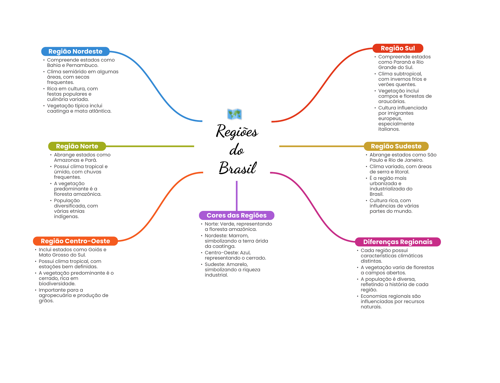 Região Nordeste Região Sul Compresnde estados Compreende estados como Paraná . Rio . Pernambuco, Grande do Clima semiárido em algumas Clima com com frice frequentes. verões quentes. Rica em cultura, com populares Vegetação variada. campos florestas de Cultura influenciada por europeus, especialmente Região Norte Região Sudeste Abrange estados como Abrange estados como São Amazonas Paulo Rio de Janeiro. clima tropical Clima variado, com áreas úmido, com chuvas de serra litoral. frequentes. a região male A vegetação urbanizada predominante a do floresta População Cultura rica, com com influências de várias várias partes do mundo. Cores das Regiões Norte: representando a floresta Marrom, Região Centro-Oeste a terra árida Diferenças Regionais Incluí estados da Mato Grosso do Azul, região possul clima tropical, com representando D cerrado. estações a A vegetação de florestas A vegetação predominante é a campos abertos. cerrado, rica em A população diversa, refletindo a história de cada para a região. agropecuária . produção de regionale são por recursos