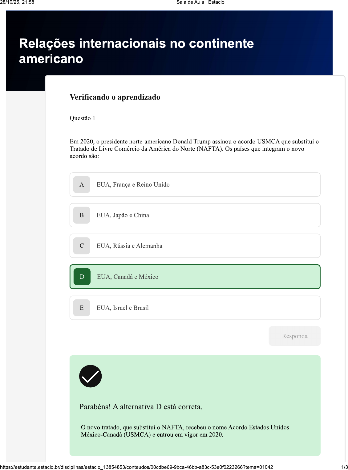 28/10/25, 21:58 Sala de Aula Estacio Relações internacionais no continente americano Verificando aprendizado Questão 1 Em 2020, o presidente norte-americano Donald Trump assinou o acordo USMCA que substitui o Tratado de Livre Comércio da América do Norte (NAFTA). Os países que integram o novo acordo são: A EUA, França e Reino Unido EUA, Japão e China C EUA, Rússia e Alemanha D EUA, Canadá e México E EUA, Israel e Brasil Responda Parabéns! A alternativa D está correta. novo tratado, que substitui o NAFTA, recebeu o nome Acordo Estados Unidos- México-Canadá (USMCA) e entrou em vigor em 2020. 1/328/10/25, 21:58 Sala de Aula Estacio Questão 2 O MERCOSUL é integrado por Argentina, Brasil, Paraguai, Uruguai e Venezuela. Em 2017, por decisão unânime dos membros, a Venezuela foi suspensa. Tal suspensão, no bloco, ocorreu por: A Associação do governo venezuelano com o Estado Islâmico. Promoção de práticas comerciais injustas. C Realização de testes nucleares. D Ruptura da ordem democrática. E Descumprimento do Acordo de Paris. Responda Parabéns! A alternativa D está correta. Em 2017, a Venezuela foi suspensa do Mercosul por "ruptura da ordem democrática". 2/3