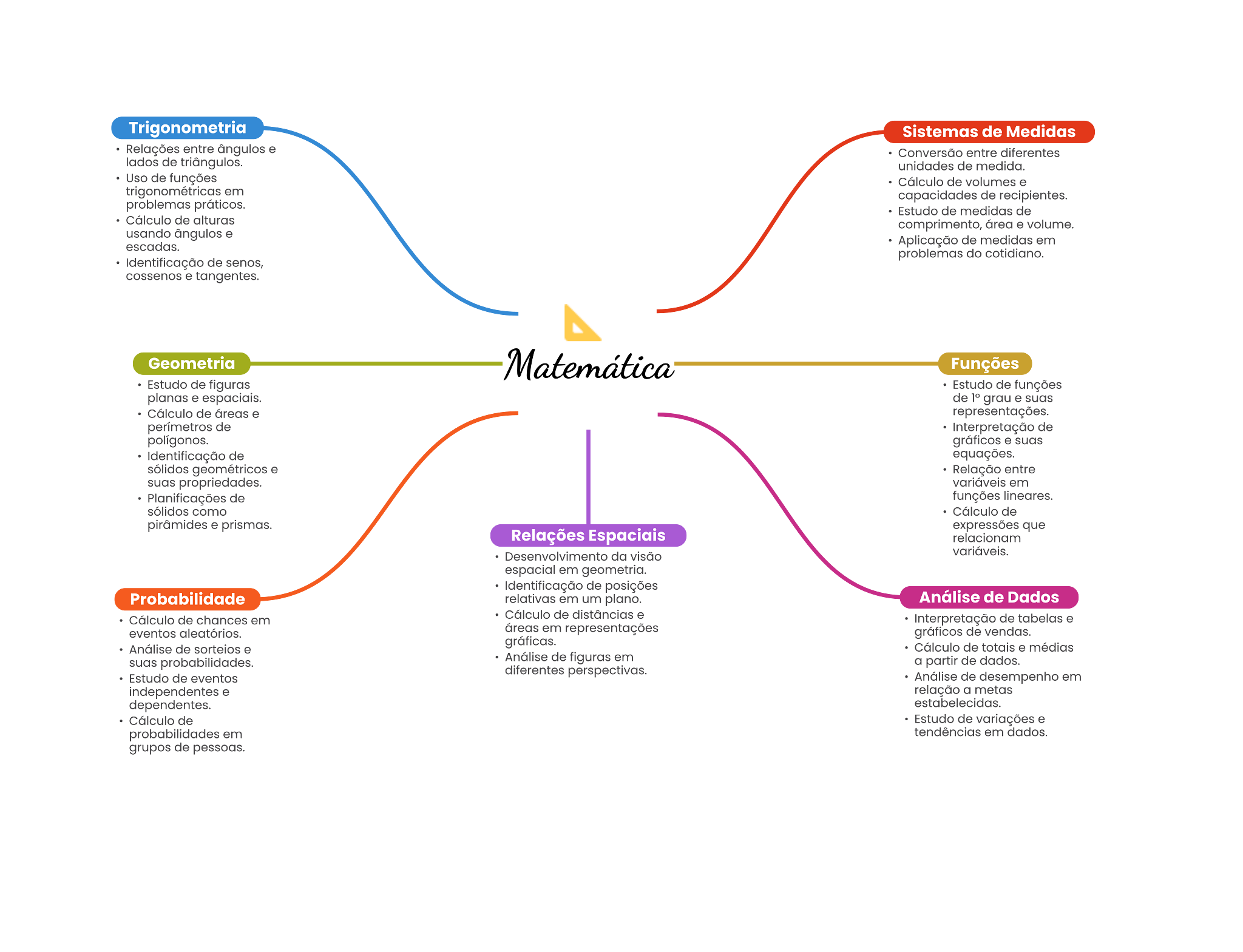 Trigonometria Sistemas de Medidas Relações entre ângulos entre diferentes lados de unidades de medida. Uso de funções Cálculo de volumes e trigonométricas em capacidades de recipientes. Estudo de medidas de de alturas comprimento, área volume. usando escadas. Aplicação de medidas em problemas do de senos, . tangentee. Geometria Funções Estudo de figuras Estudo de funções de Cálculo de representações. de interpretação de poligonos. de equações. sólidos geométricos . Relação entre propriedades. em de funções sólidos como de e prismas. expressões que Relações Espaciais relacionam da visão variáveis. espacial em de posições Probabilidade relativas em um plano. Análise de Dados de chances em de e de eventos em representações de vendas. Análise de e Cálculo de totals e probabilidades. de figuras em a partir de dados. Estudo de eventos diferentes perspectivas. de desempenho em independentes a metos Cálculo de Estudo de variações probabilidades em tendências em dados. grupos de pessoas.