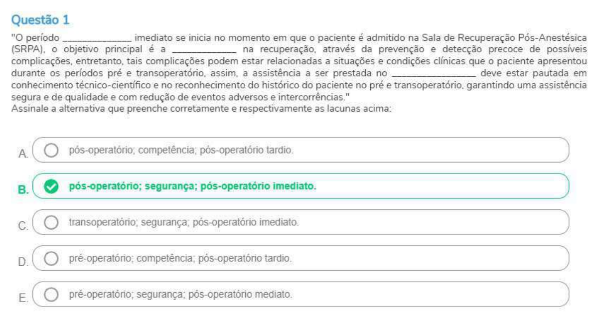 Questão 1 "O período imediato se inicia no momento em que o paciente é admitido na Sala de Recuperação Pós-Anestésica o objetivo principal é a na recuperação, através da prevenção e detecção precoce de possíveis complicações, entretanto, tais complicações podem estar relacionadas a situações e condições clínicas que paciente apresentou durante os períodos pré e transoperatório, assim, a assistência a ser prestada no deve estar pautada em conhecimento técnico-científico e no reconhecimento do histórico do paciente no pré e transoperatório, garantindo uma assistência segura e de qualidade e com redução de eventos adversos e intercorrências." Assinale a alternativa que preenche corretamente e respectivamente as lacunas acima: A. pós-operatório; competência; pós-operatório tardio. pós-operatório; segurança; pós-operatório imediato. C. segurança; pós-operatório imediato. D. pré-operatório; competência; pós-operatório tardio. E. pré-operatório; segurança; pós-operatório mediato.Questão 2 "É responsável pelo planejamento e execução do ato cirúrgico, devendo compor a equipe cirúrgica e conduzir a cirurgia, procurando manter a organização, a ordem e a harmonia durante todo o ato operatório." Sobre qual profissional o texto acima está se referindo? Assinale a alternativa correta: A. B. Instrumentador cirúrgico. C. Cirurgião assistente. D. Enfermeiro coordenador. Cirurgião titular.Questão 3 A Sala de Recuperação Pós-anestésica (SRPA) é considerada uma unidade de assistência intensiva e, assim, é importante que tal assistência seja sistematizada, o que possibilita a verificação das ações realizadas e se estas acontecem com a finalidade de prevenção às complicações que podem ocorrer no período de permanência do paciente, devendo também ser considerados as particularidades do paciente e os procedimentos anestésicos e cirúrgicos realizados, tudo isto pela interação e pelo trabalho em equipe. Sobre a dinâmica da SRPA, analise as afirmativas a seguir e identifique dentre elas as verdadeiras (V) e/ou as falsas (F): A dinâmica de assistência nesta unidade requer, dos profissionais que atuam nela, agilidade, habilidade, raciocínio crítico para realização de intervenções imediatas. A equipe da SRPA não necessita ser treinada para atendimento de situações de emergência e o enfermeiro responsável deve estar atendo ao desempenho da equipe para realizar uma escala diária de atividades que favoreça a dinâmica de atuação de todos. A assistência prestada na SRPA não é específica, e nem requer conhecimentos devido à complexidade do paciente no pós-operatório imediato. Selecione a alternativa que representa a sequência correta: A. V-V-V. B. C. F-F-F D.Questão 4 Uma das preocupações que a equipe de enfermagem precisa ter no pós-operatório imediato é com relação a ferida operatória. Elas em geral são consideradas limpas, no entanto, quando apresenta sinais de processo infeccioso são denominadas infectadas. Sobre as feridas operatórias, analise as assertivas abaixo: I.Uma ferida operatória infectada apresenta suas bordas são enrijecidas, ocorrendo dor, febre local e presença de secreção, esses sinais e sintomas representam um quadro clínico que requer intervenção de urgência. II.As feridas operatórias podem apresentar sangramento e secreção, que também constituem sinais importantes que devem ser evidenciados e tratados assim que diagnosticados. III.A deiscência é a ruptura das bordas da ferida parcial ou totalmente, causando evisceração - exteriorização das vísceras, mais comum em incisões abdominais devido ao volume de líquidos e secreções presentes. Agora, escolha a alternativa correta: A. Apenas as afirmativas I e estão corretas. As afirmativas I, e III estão corretas. C. Apenas a afirmativa III está correta. D. Apenas a afirmativa I está correta. E. Apenas a afirmativa estáQuestão 5 No período perioperatório a assistência de enfermagem não fica restrita somente aos cuidados prestados diretamente ao paciente. Para a realização de uma cirurgia é necessário que a equipe de enfermagem exerça algumas ações necessárias para favorecer a ocorrência do ato cirúrgico em conformidade com as necessidades e especificidades do procedimento cirúrgico. Sobre o preparo da sala operatória, analise as assertivas abaixo: I.A montagem ou preparo da sala operatória consiste em um procedimento realizado com objetivo de organização e provisão adequada dos artigos e equipamentos necessários para assegurar o desenvolvimento do ato anestésico-cirúrgico com qualidade e segurança ao paciente. II.Esse preparo possibilita a à equipe cirúrgica a execução do procedimento com menor risco de falhas e intercorrências. III.O período para a realização da atividade se inicia no momento em que o enfermeiro passa ao responsável pela limpeza da sala operatória as informações referentes ao procedimento a ser realizado, bem como o plano de cuidados para o período transoperatório, e deve estar concluído no momento em que ocorre o início do ato anestésico-cirúrgico. Agora, escolha a alternativa correta: A Apenas a afirmativa III está correta. B. As afirmativas I, e III estão corretas. C. Apenas as afirmativas e estão corretas. D. Apenas a afirmativa está correta. E. Apenas a afirmativa Il está correta.Questão 6 A Unidade de Centro Cirúrgico é a que mais equipamentos utiliza para a realização das atividades diárias, tendo em vista a evolução tecnológica, e a introdução cada vez mais intensa de procedimentos cirúrgicos videolaparoscópicos, cirurgias minimamente invasivas e até cirurgias que utilizam a robótica. Sobre essa temática, assinale abaixo a alternativa que contenha um equipamento fixo: A. Foco central. B. Bisturi elétrico. C. Monitor multiparamétrico. D. Carrinho de anestesia. E. Aspirador de secreção portátil.Questão 7 
