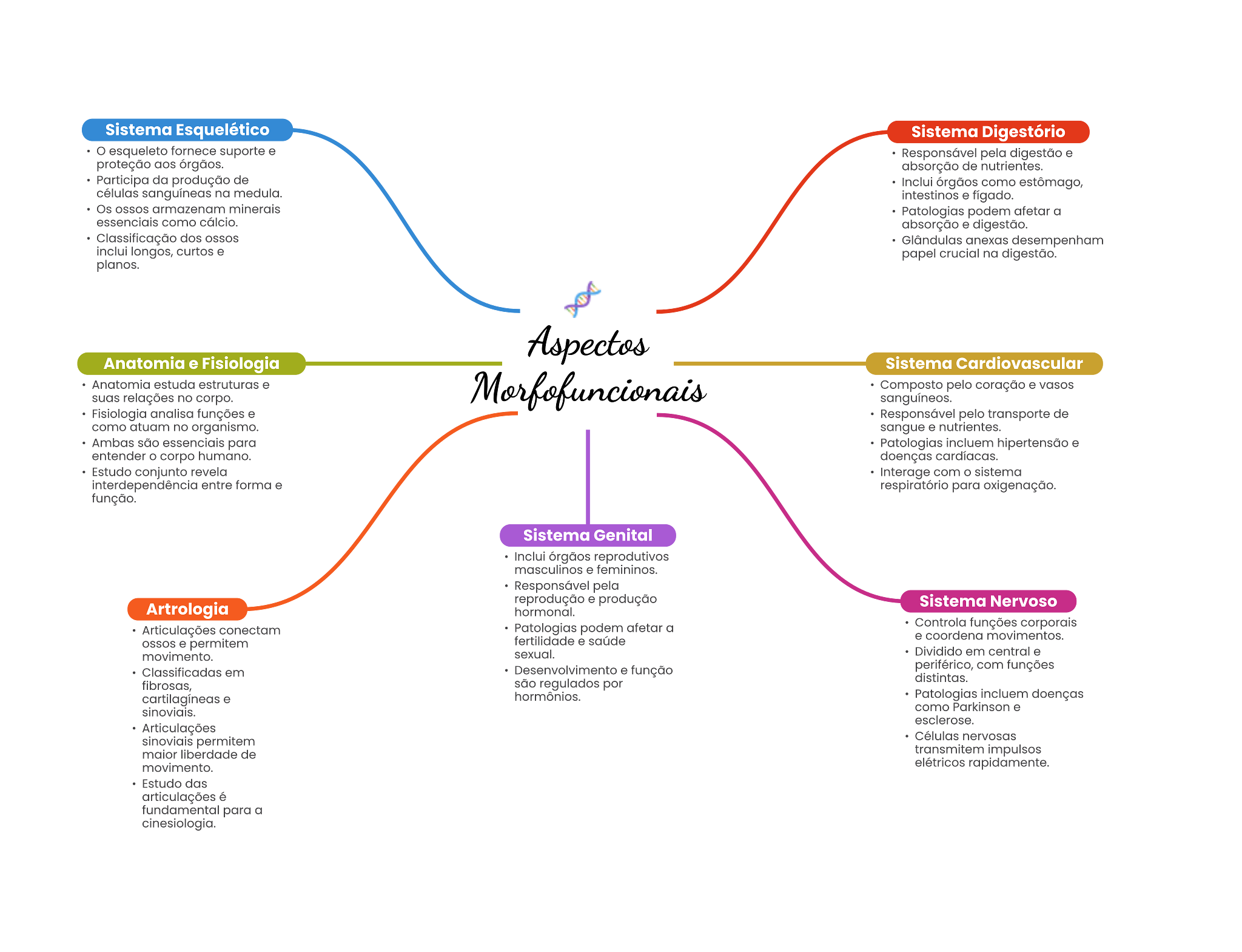 Sistema Esquelético Sistema Digestório fornece suporte Responsável digestão . proteção absorção de nutrientes. Participa da produção de órgãos como estômago, na medula. Patologias podem afetar a essencials como absorção dos Incluí longos, curtos . papel crucial digestão. planos. Anatomia e Fisiologia Sistema Cardiovascular estuda estruturas Composto pelo coração relações no corpo. Fisiologia analisa funções . Responsável pelo transporte de como atuam no organismo. sangue nutrientes. Ambas são para Patologias incluem entender corpo humano. doenças Estudo conjunto revela com entre forma respiratório para oxigenação. função. Sistema Genital reprodutivos Responsável pela reprodução produção Sistema Nervoso Artrologia hormonal. Articulações Patologias podem afetar a Controla funções corporais movimentos. permitem movimento. sexual. Dividido em central em Desenvolvimento função periférico, com funções fibrosas, são regulados por Patologias Incluem doenças como Porkinson . Articulações permitem liberdade de transmitem movimento. elétricos rapidamente. Estudo articulações fundamental para a