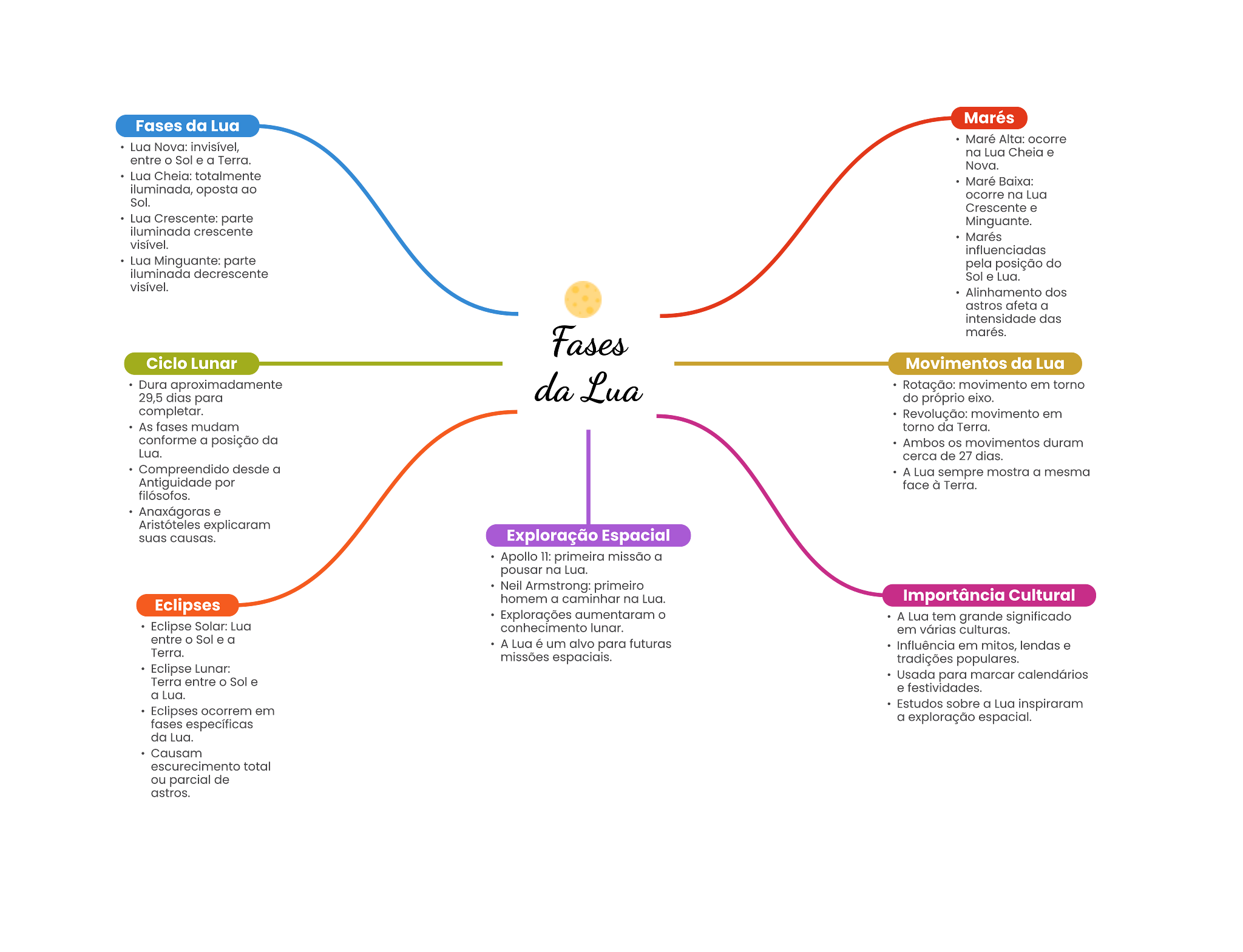 Marés Fases da Lua Maré ocorre Luca Nova: na . entre Sol a Terra. totalmente Maré iluminada, oposta ao na SoL parte visivel. Lua Minguante: parte pela posição do decrescente Sol dos astros afeta a das marés. Ciclo Lunar Movimentos da Lua Dura Rotação: movimento em torno 29,5 dias para do próprio completar. Revolução: movimento em As mudam tomo da Terra. conforme a posição da Ambos movimentos duram de 27 Compreendido desde A Lua sempre mostra a meema Antiguidade por face à Terra. e explicaram causas. Exploração Espacial Apollo primeira missão a pousar na Armstrong: primeiro Eclipses homem a caminhar na Importância Cultural Explorações aumentaram A grande significado Solar: conhecimento lunar. em culturas. entre Sol a A é um alvo para em mitos, lendas Terra. missões tradições populares. Lunar: Terra entre Sol Usada para marcar calendários festividades. a ocorrem em sobre a Lua específicas a exploração espacial. da Causam escuracimento total ou parcial de astros.