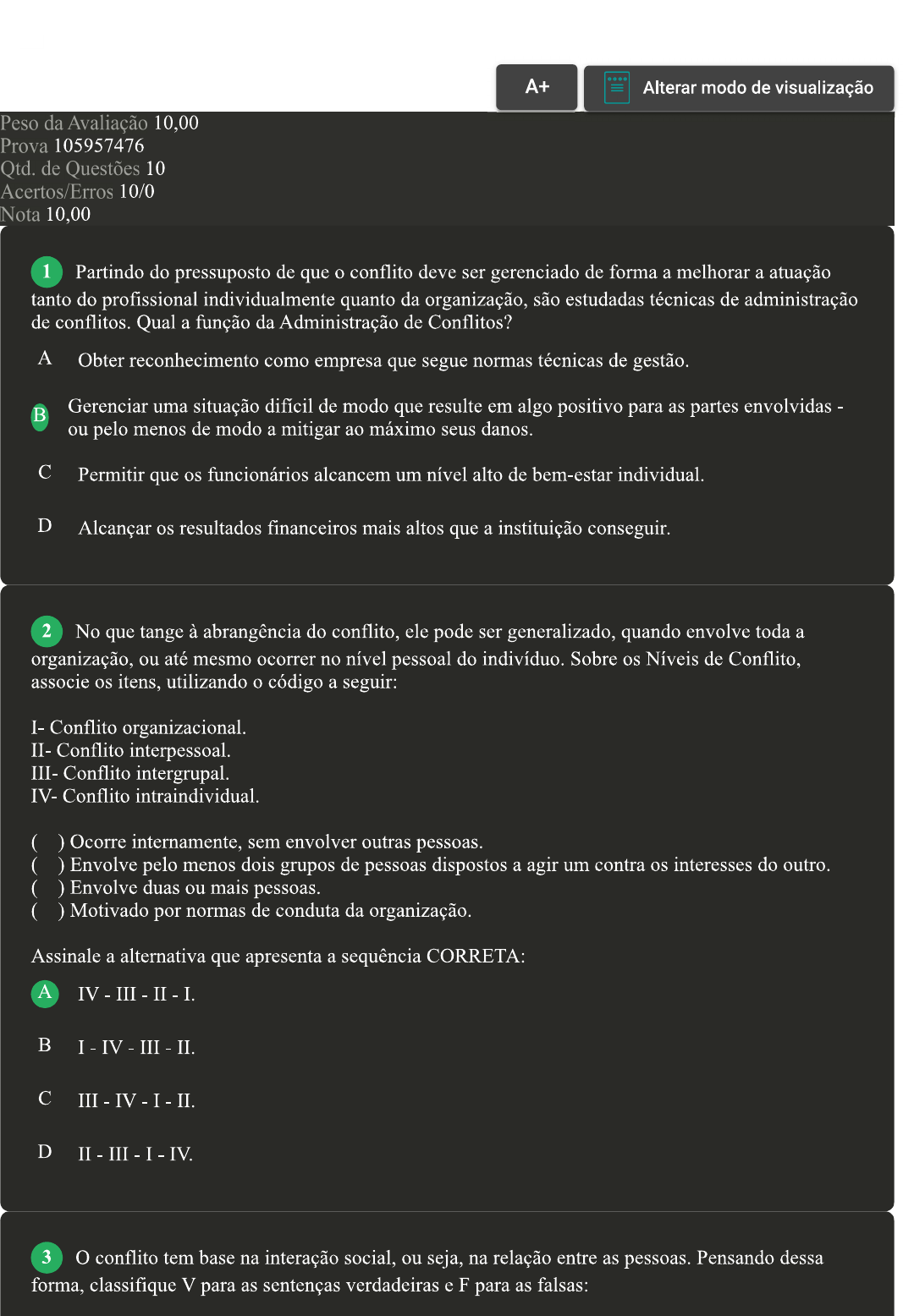 A+ Alterar modo de visualização Peso da Avaliação 10,00 Prova 105957476 Qtd. de Questões 10 Acertos/Erros 10/0 Nota 10,00 1 Partindo do pressuposto de que o conflito deve ser gerenciado de forma a melhorar a atuação tanto do profissional individualmente quanto da organização, são estudadas técnicas de administração de conflitos. Qual a função da Administração de Conflitos? A Obter reconhecimento como empresa que segue normas técnicas de gestão. B Gerenciar uma situação difícil de modo que resulte em algo positivo para as partes envolvidas ou pelo menos de modo a mitigar ao máximo seus danos. C Permitir que os funcionários alcancem um nível alto de bem-estar individual. D Alcançar os resultados financeiros mais altos que a instituição conseguir. 2 No que tange à abrangência do conflito, ele pode ser generalizado, quando envolve toda a organização, ou até mesmo ocorrer no nível pessoal do indivíduo. Sobre os Níveis de Conflito, associe os itens, utilizando o código a seguir: I- Conflito organizacional. II- Conflito interpessoal. III- Conflito intergrupal. IV- Conflito intraindividual. ( ) Ocorre internamente, sem envolver outras pessoas. ( ) Envolve pelo menos dois grupos de pessoas dispostos a agir um contra os interesses do outro. ( ) Envolve duas ou mais pessoas. Motivado por normas de conduta da organização. Assinale a alternativa que apresenta a sequência CORRETA: A IV III II I. B I IV III II. III IV I II. D II III I IV. 3 O conflito tem base na interação social, ou seja, na relação entre as pessoas. Pensando dessa forma, classifique V para as sentenças verdadeiras e F para as falsas:( ) conflito pode surgir de divergências acerca de objetivos em um negócio. ( ) A existência de ideias diferentes pode levar ao conflito. ( ) Um conflito pode ser criado com uma ação, mesmo que não haja reação. Assinale a alternativa que apresenta a sequência CORRETA: A V-F-F. B D V-V-F. 4 A compreensão dos cinco estágios de uma situação de conflito auxilia em uma tomada de decisão propícia e tempestiva. Com isso, aumenta-se a chance de uma resolução que traga benefícios à entidade. Assinale a alternativa CORRETA que trata do estágio da INTENÇÃO: A Estágio no qual aparecem as condições e os fatores para o surgimento do conflito. B Estágio no qual condições anteriores levam ao conflito caso uma ou mais partes envolvidas tenha sido afetada e esteja consciente disso. Estágio em que há a decisão de agir de uma determinada maneira. D Estágio no qual a parte coloca em prática o que decidiu fazer para lidar com a oposição. 5 Há casos em que é normal que as pessoas estejam em posições opostas, por exemplo, quando existem negociações envolvidas. E, com isso, o conflito pode aparecer. Sobre conflitos em negociações, classifique V para as sentenças verdadeiras e F para as falsas: É quando uma das partes percebe que uma outra parte pode afetar negativamente alguma coisa que a primeira considere importante. ( ) Quanto menor for a distância entre as posições dos envolvidos, maior tende a ser esse conflito. ( ) Em divergências, as pessoas se colocam em posições antagônicas. Assinale a alternativa que apresenta a sequência CORRETA: A B V-V-F. D6 A administração de conflitos pode ser vista como uma ferramenta gerencial, pois busca melhorar os entraves de relação interpessoal, culminando em uma melhora dos processos. Sobre o exposto, classifique V para as sentenças verdadeiras e F para as falsas: A melhor situação é aquela em que as próprias partes envolvidas constroem a resolução do conflito. Pode-se utilizar ferramentas de comunicação fornecidas por profissional com capacidade para administrar situações conflituosas. ( ) Construir um canal de comunicação incentiva os conflitos, pois leva ao debate de ideias, que é o causador principal de conflitos. Assinale a alternativa que apresenta a sequência CORRETA: A V-V-F. D 7 Há cinco estágios em uma situação conflituosa, cada um com suas características específicas. É importante compreender essa sequência para conseguir administrar o conflito ocorrido. Assinale a alternativa CORRETA que trata do estágio da OPOSIÇÃO POTENCIAL: A Estágio no qual aparecem as condições e os fatores para o surgimento do conflito. B Estágio no qual condições anteriores levam ao conflito caso uma ou mais partes envolvidas tenha sido afetada e esteja consciente disso. Estágio no qual a parte coloca em prática o que decidiu fazer para lidar com a oposição. D Estágio em que há a decisão de agir de uma determinada maneira. 8 Para lidar com os conflitos, podemos contar com algumas técnicas já formuladas e testadas, que auxiliam nas tratativas de forma a obter o melhor resultado possível. Assinale a alternativa CORRETA que trata sobre a técnica de Não Enfrentamento: A Consiste na criação de uma meta compartilhada para as partes envolvidas, definida de tal forma que não possa ser atingida sem a cooperação entre as partes conflitantes. B Uma decisão pela expansão do recurso pode criar uma solução em que ambas as partes saem ganhando, logo, o conflito se extingue. É a técnica de evitar o conflito. Normalmente, é utilizada quando o conflito não é vantajoso para uma das partes ou quando esta se encontra em grande desvantagem. D Consiste na promoção de encontros entre as partes conflitantes, com o intuito de identificar os problemas e resolvê-los por meio de discussão aberta.9 Para que um conflito seja bem administrado, é importante se atentar aos cinco estágios que o compõe. Assim, o conflito pode ser utilizado a favor do progresso, e não como fator de discórdia destrutiva. Assinale a alternativa CORRETA que trata do estágio do Comportamento: A Estágio no qual aparecem as condições e os fatores para o surgimento do conflito. B Estágio em que há a decisão de agir de uma determinada maneira. Estágio no qual condições anteriores levam ao c