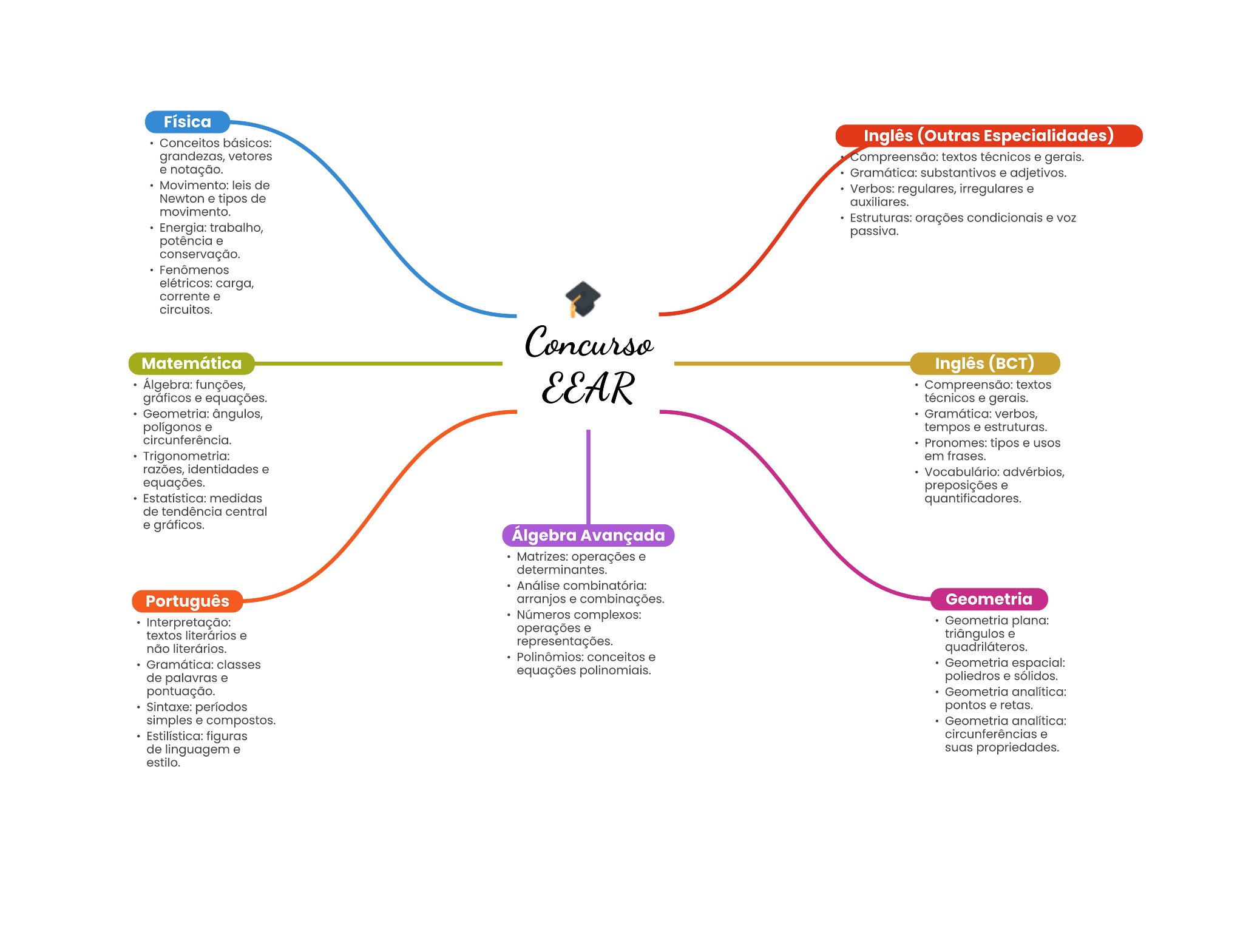 Física Conceitos Inglês (Outras Especialidades) vetores textos técnicos . gerale. notação. substantivos adjetivos. Movimento: de Verbos: regulares, Newton . tipos de movimento. Estruturas: orações voz passiva. potância conservação. Fenômenos elétricos: carga, corrente . Matemática Inglês (BcT) Álgebra: funções, textos equações. técnicos Gramático: poligonos tempos estruturas. circunferência. Pronomes: tipos em frasse. razões, identidades Vocabulário: equações. preposições quantificadores. de tendência central Álgebra Avançada operações determinantes. Português e combinações. Geometria . não representações. Polinômios: classes de palavras equações Sintaxe: pontos simples 6 compostos. circunferências de linguagem propriedades.