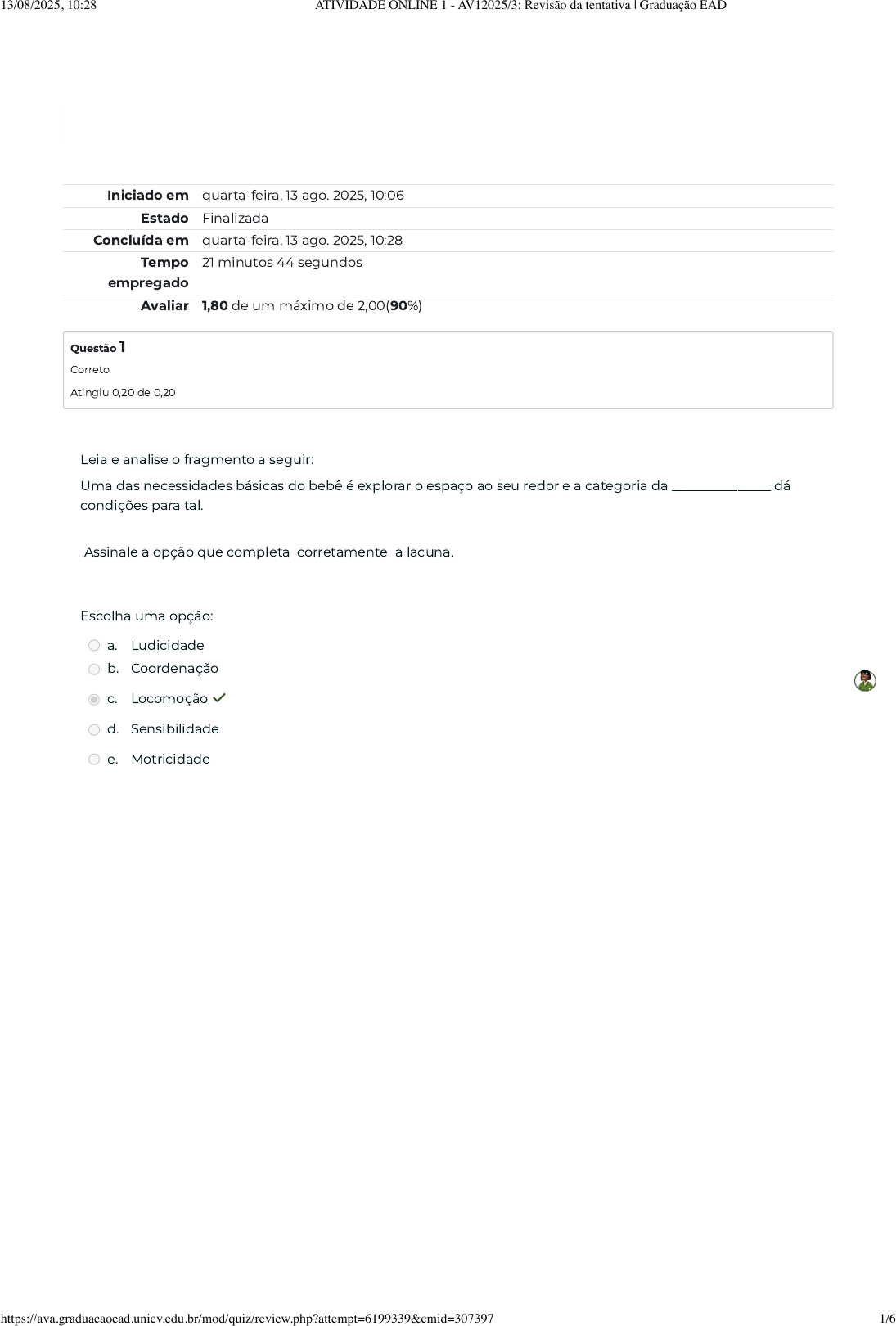 Iniciado em quarta-feira, 13 ago. 2025, 10:06 Estado Finalizada Concluída em quarta-feira, 13 ago. 2025, 10:28 Tempo empregado 21 minutos 44 segundos Avaliar 1,80 de um máximo de 2,00(90%) Questão 1 Correto Atingiu 0,20 de 0,20 Leia e analise o fragmento a seguir: Uma das necessidades básicas do bebê é explorar o espaço ao seu redor e a categoria da _______________ dá condições para tal. Assinale a opção que completa corretamente a lacuna. Escolha uma opção: a. Ludicidade b. Coordenação c. Locomoção ✓ d. Sensibilidade e. Motricidade 13/08/2025, 10:28 ATIVIDADE ONLINE 1 - AV12025/3: Revisão da tentativa | Graduação EAD https://ava.graduacaoead.unicv.edu.br/mod/quiz/review.php?attempt=6199339&cmid=307397 1/6 Questão 2 Correto Atingiu 0,20 de 0,20 Questão 3 Correto Atingiu 0,20 de 0,20 Parte das habilidades de autoajuda está na consciência do próprio corpo, onde e em qual posição no ambiente e isso se desenvolve através do processamento sensorial, no que chamamos de Integração Sensorial. Como podemos definir a Integração Sensorial? Assinale a alternativa correta. Escolha uma opção: a. Capacidade de processar a informação que chega pelo canal sensorial óptico e produzir uma resposta motora mediana b. Capacidade de receber e processar a informação que chega por alguns canais sensoriais e produzir uma resposta motora inadequada c. Capacidade de apenas receber a informação que chega pelos diferentes canais sensoriais e produzir uma resposta motora reflexa d. Capacidade de receber, organizar e processar a informação que chega pelos diferentes canais sensoriais e produzir uma resposta motora adequada ✓ e. Capacidade de obter a informação que chega por alguns canais sensoriais e produzir uma resposta motora adequada Existem diversos fatores que afetam o desenvolvimento da criança e podem inclusive interferir futuramente no aprendizado de diversas habilidades e que acontecem durante a gestação, conhecida como etapa pré- natal. Qual o período que corresponde ao pré-natal? Escolha uma opção: a. Aos 9 meses ou 41 semanas de gestação b. Aos 9 meses ou 40 semanas de gestação ✓ c. Aos 9 meses ou 42 semanas de gestação d. Aos 8 meses ou 40 semanas de gestação e. Aos 8 meses e meio ou 41 semanas de gestação 13/08/2025, 10:28 ATIVIDADE ONLINE 1 - AV12025/3: Revisão da tentativa | Graduação EAD https://ava.graduacaoead.unicv.edu.br/mod/quiz/review.php?attempt=6199339&cmid=307397 2/6 Questão 4 Correto Atingiu 0,20 de 0,20 Questão 5 Correto Atingiu 0,20 de 0,20 A teoria psicanalítica proposta por Freud apresenta estágios e pode ser vista como um dos primeiros modelos do desenvolvimento humano, centrada na personalidade, trata de “estágios psicossexuais do desenvolvimento”. Quais são os estágios da teoria de Freud? Assinale a alternativa correta. Escolha uma opção: a. Oral, nasal, fálico, mental e genital b. Mental, anal, fálico, motor e genital c. Psíquico, anal, motor, latente e genital d. Oral, anal, fálico, latente e genital ✓ e. Oral, anal, fálico, latente e físico Uma das teorias mais exploradas pela Educação, idealizada por Piaget, a Teoria do Desenvolvimento Cognitivo, está entre as mais conhecidas por pesquisadores do desenvolvimento infantil. Quais são os quatro períodos de desenvolvimento cognitivo segundo Piaget? Assinale a alternativa correta. Escolha uma opção: a. Sensório-motor, pré-operatório, operatório concreto e operatório formal ✓ b. Psicomotor, pré-operatório, operatório coletivo e operatório formal c. Sensório-motor, pré-operatório, operatório concreto e operatório informal d. Psicomotor, pré-operatório, operatório funcional e operatório informal e. Sensório-motor, pós-operatório, operatório funcional e operatório formal 13/08/2025, 10:28 ATIVIDADE ONLINE 1 - AV12025/3: Revisão da tentativa | Graduação EAD https://ava.graduacaoead.unicv.edu.br/mod/quiz/review.php?attempt=6199339&cmid=307397 3/6 Questão 6 Correto Atingiu 0,20 de 0,20 Questão 7 Incorreto Atingiu 0,00 de 0,20 Existem diversos fatores que afetam o desenvolvimento da criança e podem inclusive interferir futuramente no aprendizado de diversas habilidades e que acontecem durante a gestação. Sobre isso, analise os itens abaixo. I. Má nutrição II. Uso de drogas III. Tabaco IV. Medicamentos não recomendados Quais fatores elencados podem afetar o desenvolvimento durante a gestação? Assinale a alternativa correta. Escolha uma opção: a. Somente em II, III e IV b. Somente em I, II e III c. Somente em I e III d. Somente em II e IV e. Somente I, II, III e IV ✓ Existem diversos fatores que afetam o desenvolvimento da criança e podem inclusive interferir futuramente no aprendizado de diversas habilidades e que acontecem durante a gestação. Se tais aspectos irão realmente interferir no desenvolvimento vai depender de algumas variáveis. Quais são essas variáveis? Sobre isso, é correto o que se afirma em? Escolha uma opção: a. A condição do feto, o grau de abuso nutricional ou químico, a quantidade ou dosagem, o momento da concepção × b. A condição emocional da mãe, o grau de abuso nutricional ou químico, a quantidade ou dosagem, o período da gravidez c. A condição do feto, o grau de abuso nutricional ou químico, a quantidade ou dosagem, o período da gravidez. d. A condição do feto, o grau de abuso nutricional ou químico, a idade da mãe, o período da gravidez e. A condição do recém nascido, o grau de abuso nutricional ou químico, a quantidade ou dosagem, o momento da fala. 13/08/2025, 10:28 ATIVIDADE ONLINE 1 - AV12025/3: Revisão da tentativa | Graduação EAD https://ava.graduacaoead.unicv.edu.br/mod/quiz/review.php?attempt=6199339&cmid=307397 4/6 Questão 8 Correto Atingiu 0,20 de 0,20 Questão 9 Correto Atingiu 0,20 de 0,20 Leia e analise o fragmento a seguir: O processo de desenvolvimento, e, de modo mais específico, o processo de desenvolvimento motor, deve nos 