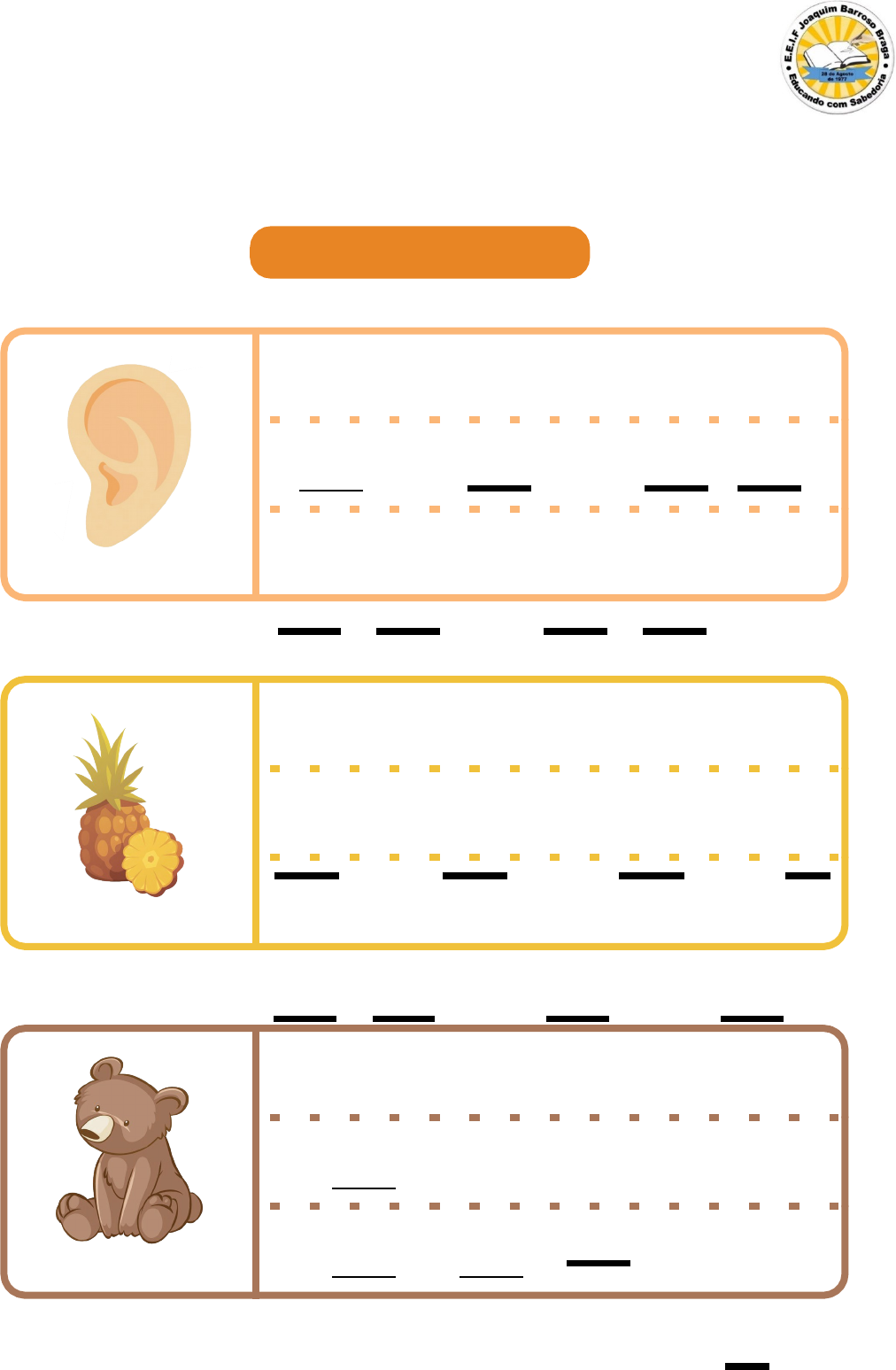 E.E.I.F JOAQUIM BARROSO BRAGA ALUNO(A):__________________________________________________ IDADE:_____ ESCREVA AS PALAVRAS O R E L H A R L ORELHA E A A B A C A X I B C X ABACAXI A A I U R S O R O URSO S __________________________________________________ Assinatura do Profissional image7.png image1.jpeg image2.png image3.png image4.png image5.png image6.png