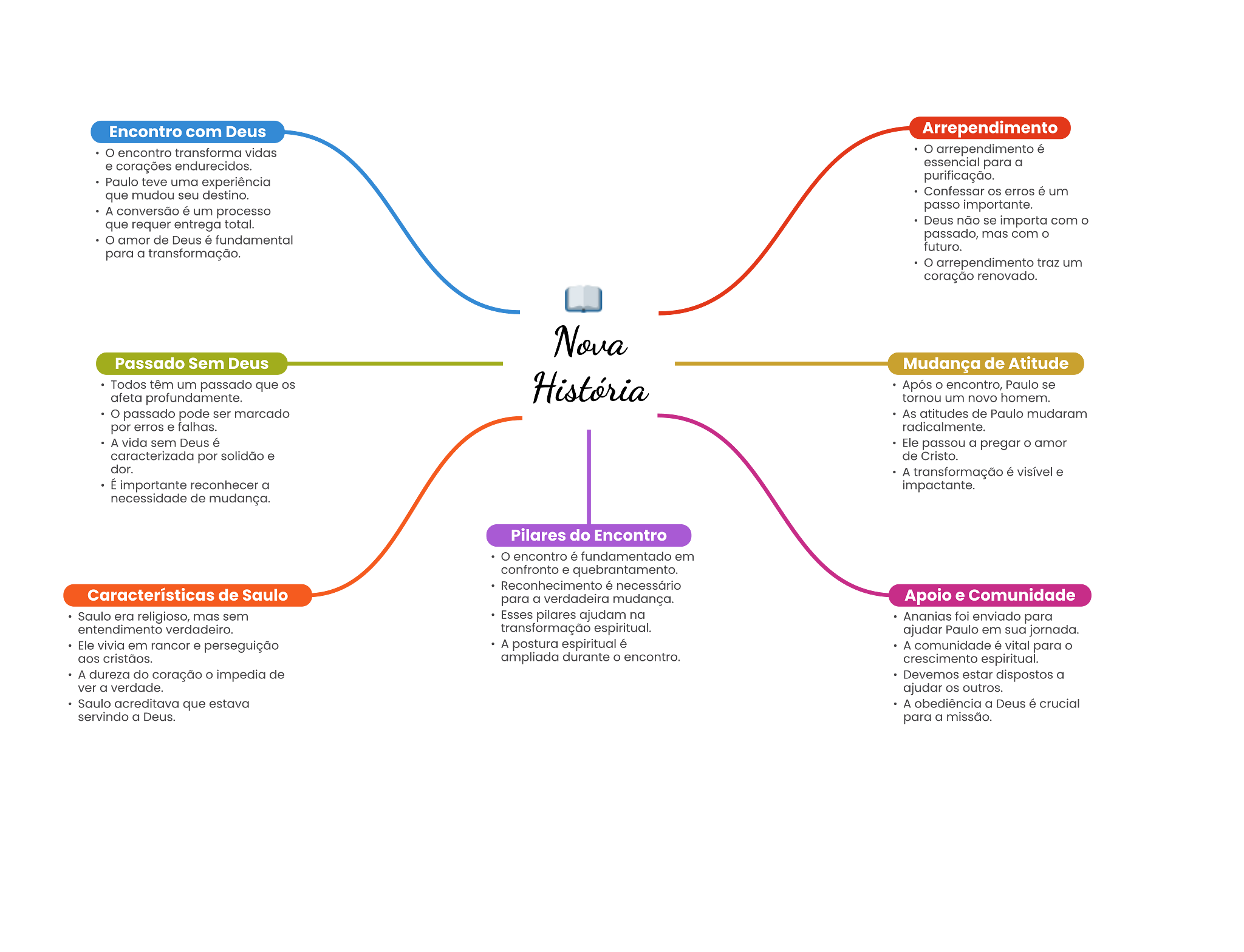 Encontro com Deus Arrependimento encontro transforma vidas arrependimento corações endurecidos. para a Paulo uma experiência purificação. que mudou seu destino. Confessor um A é um processo passo importante. que requer entrega total. Deus não se Importa com amor de Deus é fundamental mas com futuro. para a traz um coração renovado. Passado Sem Deus Mudança de Atitude Todos têm um passado que encontro, Paulo as afeta profundamente. um novo homem. o passado pode ser marcado As atitudes de Paulo mudaram por erros A vida sem passou a pregar amor por de Cristo. dor. A transformação é visivel E importante reconhecer a impactante. de mudança. Pilares do Encontro encontro é em confronto Reconhecimento Características de Saulo para a verdadeira mudança. Apoio e Comunidade era religioso, mas sem Esses ajudam na Ananias foi para entendimento transformação espiritual. ajudar Paulo em jomada. vivia em rancor perseguição A postura é A comunidade é vital para durante encontro. espiritual. A dureza do coração de dispostos a ver a verdade. ajudar outros. que estava A a Deus crucial servindo a Deus. para a missão.