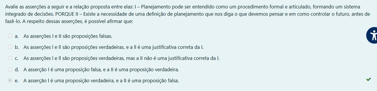 Avalie as asserções a seguir e a relação proposta entre elas: I - Planejamento pode ser entendido como um procedimento formal e articulado, formando um sistema integrado de decisões. PORQUE - Existe a necessidade de uma definição de planejamento que nos diga que devemos pensar e em como controlar futuro, antes de fazê-lo. A respeito dessas asserções, é possível afirmar que: a. As asserções I e II são proposições falsas. b. As asserções I e II são proposições verdadeiras, e a é uma justificativa correta da I. C. As asserções I e II são proposições verdadeiras, mas a II não é uma justificativa correta da I. d. A asserção I é uma proposição falsa, e a II é uma proposição verdadeira. e. A asserção I é uma proposição verdadeira, e a II é uma proposição falsa.