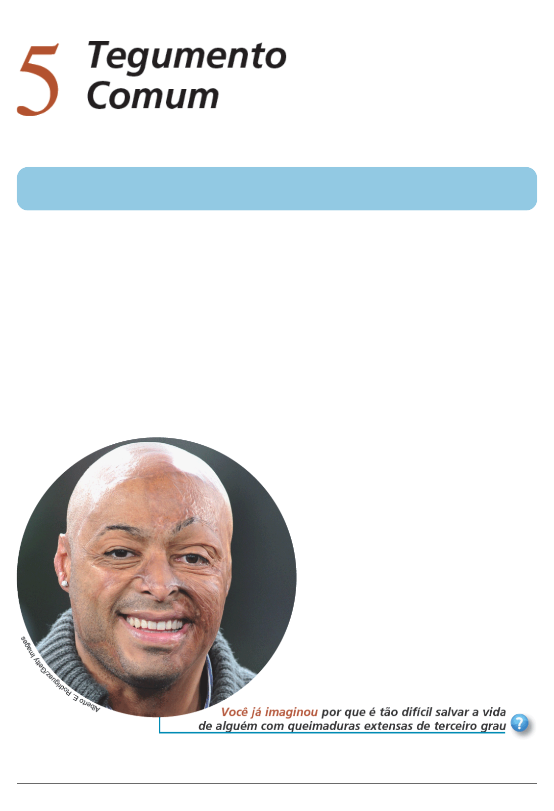 5.1 Tegumento comum e homeostasia O tegumento comum contribui para a homeostasia protegendo o corpo e ajudando a regular a temperatura corporal. Também possibilita a percepção de estímulos agradáveis, dolorosos e outros do ambiente externo. Lembrese do Capítulo 1 que um sistema consiste em um grupo de órgãos trabalhando em conjunto para a realização de atividades específicas. O tegumento comum é composto por pele, pelos, glândulas sebáceas e sudoríferas, unhas e receptores sensitivos. O tegumento comum ajuda a manter uma temperatura corporal constante, protege o corpo e fornece informações sensitivas a respeito do ambiente ao redor. De todos os órgãos do corpo, nenhum é mais facilmente inspecionado ou está mais exposto a infecções, doenças e lesões do que a pele. Embora sua localização a deixe vulnerável a danos causados por traumatismo, luz solar, microrganismos e poluentes no ambiente, as características protetoras da pele a defendem desses danos. Por causa de sua visibilidade, a pele reflete nossas emoções (franzir as sobrancelhas, rubor) e alguns aspectos da fisiologia normal (como o suor). Mudanças na cor da pele também podem indicar desequilíbrios homeostáticos no corpo. Por exemplo, a cor azulada na pele associada à hipoxia (deficiência de oxigênio no nível tecidual) é um sinal de insuficiência cardíaca, bem como de outros distúrbios. Erupções ou rupturas cutâneas anormais, como catapora, aftas ou sarampo podem revelar infecções sistêmicas ou doenças de órgãos internos, enquanto outras condições, como verrugas, manchas senis (melanose solar) ou espinhas, podem envolver apenas a pele. A pele é tão importante para a autoimagem que muitas pessoas gastam muito tempo e dinheiro para recuperar uma aparência mais normal ou jovem. A dermatologia é a especialidade médica que lida com a estrutura, a função e os distúrbios do tegumento comum. Estrutura da pele https://jigsaw.vitalsource.com/books/9788527728867/epub/OEBPS/Text/chapter01.html • • • 1. 2. 3. 4. 5. 6. OBJETIVOS Descrever as camadas da epiderme e as células que as compõem Comparar a composição das regiões papilar e reticular da derme Explicar a base para as diferentes cores de pele. A pele, também conhecida como cútis, cobre a superfície externa do corpo e é o maior órgão do corpo em peso. Nos adultos, a pele cobre uma área de cerca de 2 m2 e pesa entre 4,5 a 5 kg, cerca de 7% do peso corporal total. Sua espessura varia de 0,5 mm nas pálpebras até 4,0 mm nos calcanhares. Na maior parte do corpo ela tem entre 1 e 2 mm de espessura. A pele é formada por duas partes principais (Figura 5.1). A parte superficial e mais fina, que é composta por tecido epitelial, é a epiderme. A parte mais profunda e espessa de tecido conjuntivo é a derme. Enquanto a epiderme é avascular, a derme é vascularizada. Por esse motivo, se você cortar a epiderme não haverá sangramento, porém, se o corte atingir a derme, haverá sangramento. Abaixo da derme, mas sem fazer parte da pele, encontrase a tela subcutânea. Também chamada de hipoderme, essa camada consiste nos tecidos areolar e adiposo. Fibras que se estendem a partir da derme ancoram a pele na tela subcutânea, que, por sua vez, se liga à fáscia subjacente, o tecido conjuntivo ao redor de músculos e ossos. Na tela subcutânea é armazenada gordura e existem grandes vasos sanguíneos que nutrem a pele. Essa região (e, algumas vezes, a derme) também contém terminações nervosas chamadas de corpúsculos lamelares ou corpúsculos de Pacini, que são sensíveis à pressão (Figura 5.1). FUNÇÕES DO TEGUMENTO COMUM Regula a temperatura corporal. Armazena sangue. Protege o corpo do ambiente externo. Detecta sensações cutâneas. Excreta e absorve substâncias. Sintetiza a vitamina D. Figura 5.1 Componentes do tegumento comum. A pele consiste em uma epiderme fina e superficial e em uma derme profunda e espessa. Abaixo da pele encontrase a tela subcutânea, que liga a derme à fáscia subjacente. O tegumento comum inclui pele, pelos, glândulas sebáceas e sudoríferas e receptores sensitivos. Quais tipos de tecidos compõem a epiderme e a derme? Epiderme A epiderme é composta por epitélio pavimentoso estratificado queratinizado. Ela contém quatro tipos principais de células: queratinócitos, melanócitos, macrófagos intraepidérmicos e células táteis epiteliais (Figura 5.2). Cerca de 90% das células epidérmicas são queratinócitos, que são organizados em quatro ou cinco camadas e que produzem a proteína queratina (Figura 5.2A). Lembrese do Capítulo 4 que a queratina é uma proteína fibrosa rígida que ajuda a proteger a pele e os tecidos subjacentes de abrasões, calor, microrganismos e substâncias químicas. Os queratinócitos também produzem grânulos lamelares, que liberam uma substância que repele a água, diminuindo a entrada e a perda de água e inibindo a entrada de material estranho. Cerca de 8% das células epidérmicas são melanócitos, que se desenvolvem a partir do ectoderma do embrião em desenvolvimento e que produzem o pigmento melanina (Figura 5.2B). Suas projeções longas e delgadas se estendem entre os queratinócitos e transferem grânulos de melanina para eles. A melanina é um pigmento amarelo avermelhado ou castanhoescuro que contribui para a cor da pele e absorve os raios ultravioleta (UV) perigosa. Uma vez dentro dos queratinócitos, os grânulos de melanina se agrupam, formando um véu protetor sobre o núcleo, no lado voltado para a superfície da pele. Desse modo, eles protegem o DNA nuclear do dano causado pelos raios UV. Embora seus grânulos de melanina protejam efetivamente os queratinócitos, os melanócitos em si são particularmente suscetíveis aos danos causados pelos raios UV. Figura 5.2 Células na epiderme. Além dos queratinócitos, a epiderme contém melanócitos, que produzem o pigmento melanina; macrófagos intraepidérmicos (Langerhans), que part