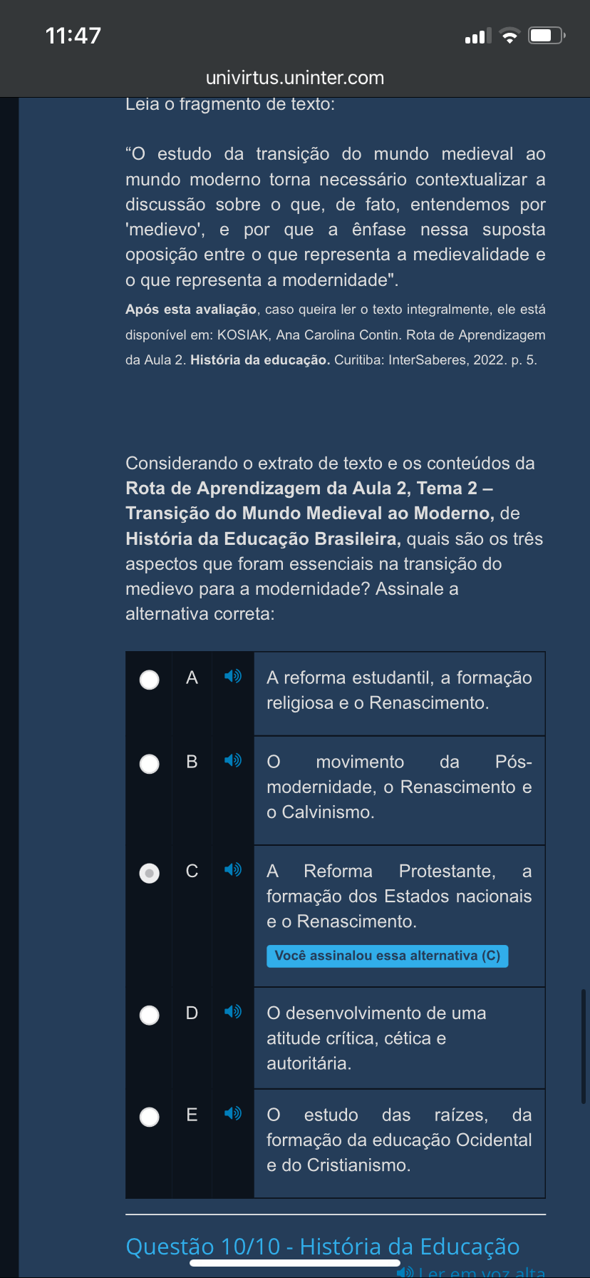 11:47 univirtus.uninter.com Leia fragmento de texto: "O estudo da transição do mundo medieval ao mundo moderno torna necessário contextualizar a discussão sobre que, de fato, entendemos por 'medievo', e por que a ênfase nessa suposta oposição entre que representa a medievalidade e que representa a modernidade". Após esta avaliação, caso queira ler texto integralmente, ele está disponível em: KOSIAK, Ana Carolina Contin. Rota de Aprendizagem da Aula 2. História da educação. Curitiba: InterSaberes, 2022. Considerando extrato de texto e os conteúdos da Rota de Aprendizagem da Aula 2, Tema 2 Transição do Mundo Medieval ao Moderno, de História da Educação Brasileira, quais são três aspectos que foram essenciais na transição do medievo para a modernidade? Assinale a alternativa correta: A A reforma estudantil, a formação religiosa e Renascimento. movimento da Pós- modernidade, Renascimento e Calvinismo. A Reforma Protestante, a formação dos Estados nacionais e Renascimento. Você assinalou essa alternativa (C) D desenvolvimento de uma atitude crítica, cética e autoritária. E estudo das raízes, da formação da educação Ocidental e do Cristianismo. Questão 10/10 História da Educação