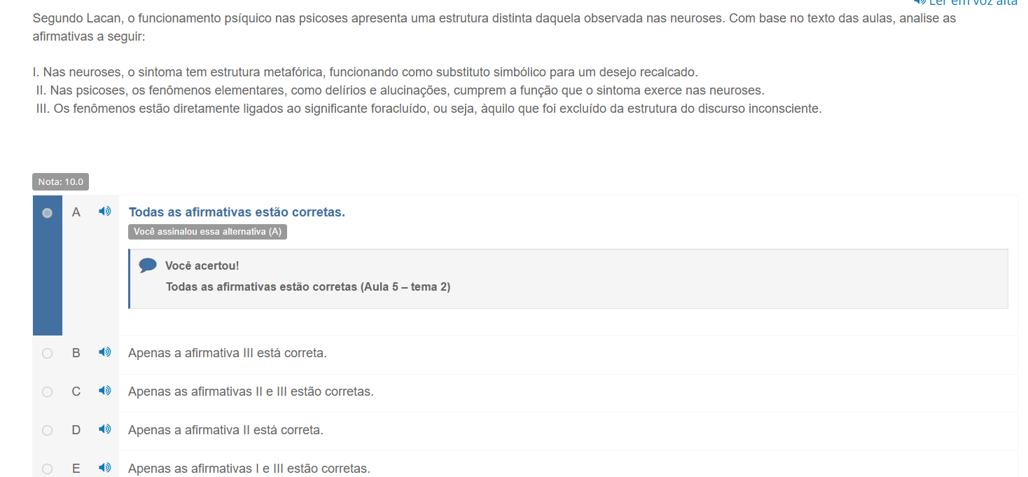 Segundo Lacan, funcionamento psíquico nas psicoses apresenta uma estrutura distinta daquela observada nas neuroses. Com base no texto das aulas, analise as afirmativas a seguir: I. Nas neuroses, sintoma tem estrutura metafórica, funcionando como substituto simbólico para um desejo recalcado. II. Nas psicoses, fenômenos elementares, como delírios e alucinações, cumprem a função que O sintoma exerce nas neuroses. III. Os fenômenos estão diretamente ligados ao significante foracluído, ou seja, àquilo que foi excluído da estrutura do discurso inconsciente. Nota: 10.0 A Todas as afirmativas estão corretas. Você assinalou essa alternativa (A) Você acertou! Todas as afirmativas estão corretas (Aula 5 - tema 2) B Apenas a afirmativa III está correta. C Apenas as afirmativas II e III estão corretas. D Apenas a afirmativa II está correta. E Apenas as afirmativas I e III estão corretas.