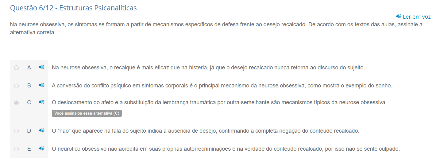 Questão 6/12 Estruturas Psicanalíticas Ler em Na neurose obsessiva, sintomas se formam a partir de mecanismos específicos de defesa frente ao desejo recalcado. De acordo com textos das aulas, assinale a alternativa correta: A Na neurose obsessiva, O recalque é mais eficaz que na histeria, já que O desejo recalcado nunca retorna ao discurso do sujeito. B A conversão do conflito psíquico em sintomas corporais é O principal mecanismo da neurose obsessiva, como mostra O exemplo do sonho. C O deslocamento do afeto e a substituição da lembrança traumática por outra semelhante são mecanismos típicos da neurose obsessiva. Você assinalou essa alternativa (C) D O "não" que aparece na fala do sujeito indica a ausência de desejo, confirmando a completa negação do conteúdo recalcado. E neurótico obsessivo não acredita em suas próprias autorrecriminações e na verdade do conteúdo recalcado, por isso não se sente culpado.
