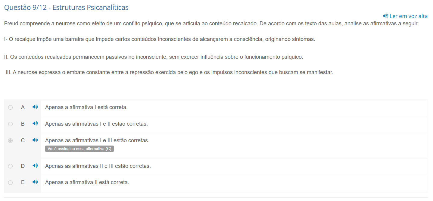 Questão 9/12 Estruturas Psicanalíticas Ler em alta Freud compreende a neurose como efeito de um conflito psíquico, que se articula ao conteúdo recalcado. De acordo com OS texto das aulas, analise as afirmativas a seguir: I- O recalque impõe uma barreira que impede certos conteúdos inconscientes de alcançarem a consciência, originando sintomas. II. Os conteúdos recalcados permanecem passivos no inconsciente, sem exercer influência sobre O funcionamento psíquico. III. A neurose expressa embate constante entre a repressão exercida pelo ego e OS impulsos inconscientes que buscam se manifestar. A Apenas a afirmativa I está correta. B Apenas as afirmativas I e estão corretas. C Apenas as afirmativas I e III estão corretas. Você assinalou essa alternativa (C) D Apenas as afirmativas e III estão corretas. E Apenas a afirmativa II está correta.