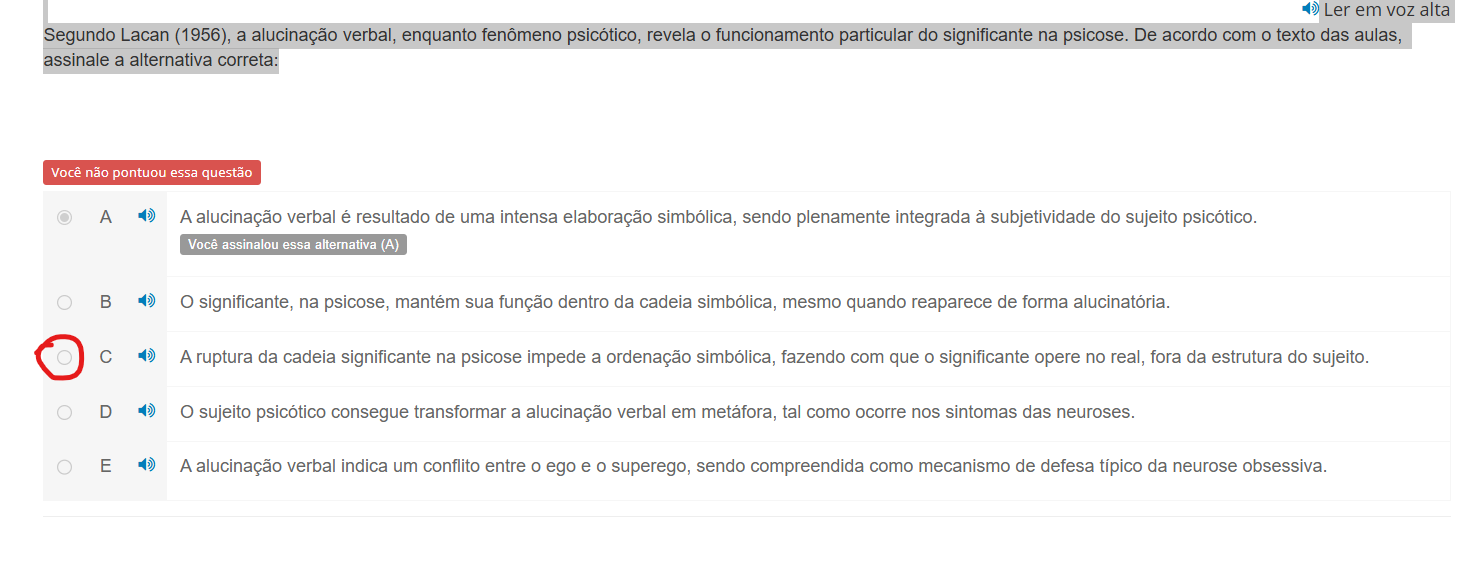 Ler em VOZ alta Segundo Lacan (1956), a alucinação verbal, enquanto fenômeno psicótico, revela funcionamento particular do significante na psicose. De acordo com texto das aulas, assinale a alternativa correta: Você não pontuou essa questão A A alucinação verbal é resultado de uma intensa elaboração simbólica, sendo plenamente integrada à subjetividade do sujeito psicótico. Você assinalou essa alternativa (A) B significante, na psicose, mantém sua função dentro da cadeia simbólica, mesmo quando reaparece de forma alucinatória. C A ruptura da cadeia significante na psicose impede a ordenação simbólica, fazendo com que significante opere no real, fora da estrutura do sujeito. D sujeito psicótico consegue transformar a alucinação verbal em metáfora, tal como ocorre nos sintomas das neuroses. E A alucinação verbal indica um conflito entre O ego e superego, sendo compreendida como mecanismo de defesa típico da neurose obsessiva.