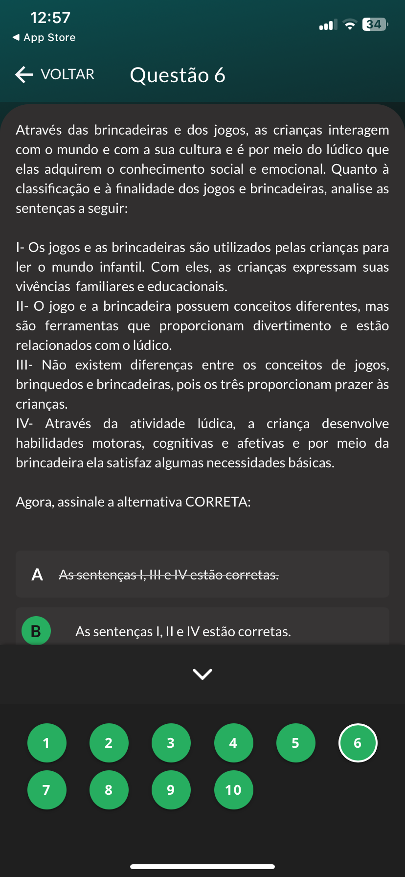 12:57 34 App Store VOLTAR Questão 6 Através das brincadeiras e dos jogos, as crianças interagem com o mundo e com a sua cultura e é por meio do lúdico que elas adquirem o conhecimento social e emocional. Quanto à classificação e à finalidade dos jogos e brincadeiras, analise as sentenças a seguir: I- Os jogos e as brincadeiras são utilizados pelas crianças para ler o mundo infantil. Com eles, as crianças expressam suas vivências familiares e educacionais. II- O jogo e a brincadeira possuem conceitos diferentes, mas são ferramentas que proporcionam divertimento e estão relacionados com o lúdico. III- Não existem diferenças entre os conceitos de jogos, brinquedos e brincadeiras, pois os três proporcionam prazer às crianças. IV- Através da atividade lúdica, a criança desenvolve habilidades motoras, cognitivas e afetivas e por meio da brincadeira ela satisfaz algumas necessidades básicas. Agora, assinale a alternativa CORRETA: A As sentenças e IV estão corretas. B As sentenças I, e IV estão corretas. 1 2 3 4 5 6 7 8 9 10