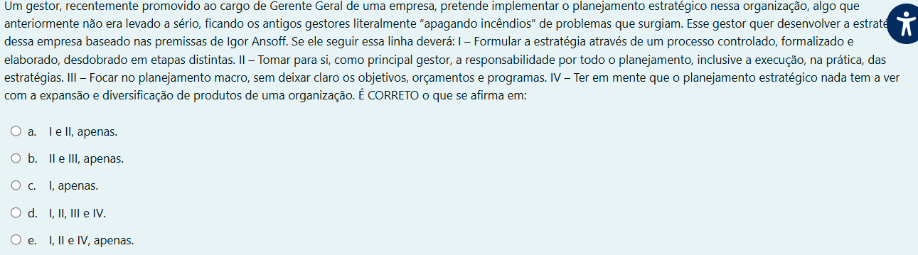 Um gestor, recentemente promovido ao cargo de Gerente Geral de uma empresa, pretende implementar planejamento estratégico nessa organização, algo que anteriormente não era levado a sério, ficando antigos gestores literalmente "apagando incêndios" de problemas que surgiam. Esse gestor quer desenvolver a estraté dessa empresa baseado nas premissas de Igor Ansoff. Se ele seguir essa linha deverá: I - Formular a estratégia através de um processo controlado, formalizado e elaborado, desdobrado em etapas distintas. II Tomar para si, como principal gestor, a responsabilidade por todo planejamento, inclusive a execução, na prática, das estratégias. III Focar no planejamento macro, sem deixar claro objetivos, orçamentos e programas. IV Ter em mente que O planejamento estratégico nada tem a ver com a expansão e diversificação de produtos de uma organização. É CORRETO O que se afirma em: a. e II, apenas. b. II e III, apenas. C. I, apenas. d. I, II, III e IV. e. I, II e IV, apenas.
