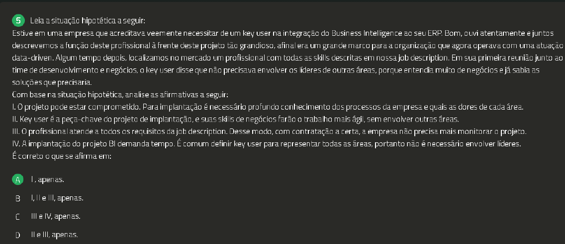 5 Leia a situação hipotética a seguir: Estive em uma empresa que acreditava veemente necessitar de um key user na integração do Business Intelligence ao seu ERP. Bom, ouvi atentamente e juntos descrevemos a função deste profissional à frente deste projeto tão grandioso, afinal era um grande marco para a organização que agora operava com uma atuação data-driven. Algum tempo depois, localizamos no mercado um profissional com todas as skills descritas em nossa job description. Em sua primeira reunião junto ao time de desenvolvimento e negócios, key user disse que não precisava envolver líderes de outras áreas, porque entendia muito de negócios e já sabia as soluções que precisaria. Com base na situação hipotética, analise as afirmativas a seguir: projeto pode estar comprometido. Para implantação é necessário profundo conhecimento dos processos da empresa e quais as dores de cada área. II. Key user é a peça-chave do projeto de implantação, e suas skills de negócios farão 0 trabalho mais ágil, sem envolver outras áreas. III. profissional atende a todos os requisitos da job description. Desse modo, com contratação a certa, a empresa não precisa mais monitorar projeto. IV. A implantação do projeto BI demanda tempo. É comum definir key user para representar todas as áreas, portanto não é necessário envolver líderes. É correto que se afirma em: A apenas. I, e III, apenas. III e IV, apenas. D e III, apenas.