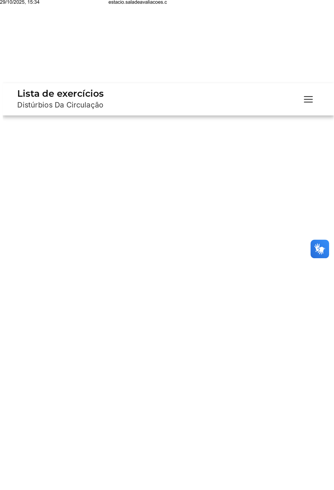 Lista de exercícios Distúrbios Da Circulação 29/10/2025, 15:34 estacio.saladeavaliacoes.com.br/exercicio/69025ddfdc9b73625066dc73/gabarito/ https://estacio.saladeavaliacoes.com.br/exercicio/69025ddfdc9b73625066dc73/gabarito/ 1/12 Você acertou 8 de 10 questões Verifique o seu desempenho e continue treinando! Você pode refazer o exercício quantas vezes quiser. Verificar Desempenho A B C D E 1 Marcar para revisão Efusões e edemas geralmente estão presentes nos distúrbios que afetam as funções hepática, renal ou cardiovascular e podem ser inflamatórios ou não. São causas fisiopatológicas desses distúrbios: Aumento da pressão hidrostática e retenção de sódio e água Aumento da pressão osmótica plasmática e da pressão hidrostática Obstrução dos canais linfáticos e aumento da pressão osmótica plasmática Diminuição da pressão hidrostática e retenção de sódio e água Aumento da síntese de albumina e hiperperfusão renal Resposta correta Parabéns, você selecionou a alternativa correta. Confira o gabarito comentado! Gabarito Comentado O aumento da pressão hidrostática e a retenção de sódio e água são 29/10/2025, 15:34 estacio.saladeavaliacoes.com.br/exercicio/69025ddfdc9b73625066dc73/gabarito/ https://estacio.saladeavaliacoes.com.br/exercicio/69025ddfdc9b73625066dc73/gabarito/ 2/12 A B C D E O aumento da pressão hidrostática e a retenção de sódio e água são causas fisiopatológicas de distúrbios que afetam as funções hepática, renal ou cardiovascular e que podem resultar em efusões e edemas. A pressão hidrostática é a força que o sangue exerce contra as paredes dos vasos sanguíneos. Quando essa pressão aumenta, pode levar ao acúmulo de líquido nos tecidos, causando edema. Da mesma forma, a retenção de sódio e água no corpo pode aumentar o volume de fluido nos vasos sanguíneos, aumentando a pressão hidrostática e contribuindo para a formação de edema. 2 Marcar para revisão Êmbolo é uma massa solta nos vasos sanguíneos, com capacidade de migrar para outros locais da árvore vascular e causar disfunções teciduais. Sobre esse assunto, analise as afirmativas a seguir: I. Êmbolos normalmente possuem natureza gasosa, já que massas sólidas resultam em trombose e massas líquidas, como gotículas de gordura, resultam em aterosclerose. II. Dependendo do local onde o êmbolo tenha se originado, ele pode se alojar em qualquer local da vasculatura. III. A forma mais comum de doença tromboembólica é a embolia pulmonar. IV. As embolias sistêmicas derivam principalmente de trombos cardíacos, murais ou valvares. V. As consequências da embolia variam de acordo com o local obstruído, tamanho e posição do êmbolo. É correto o que se afirma em: I, II, III e IV I, III, IV e V II, III, IV e V III, IV e V II IV e V 29/10/2025, 15:34 estacio.saladeavaliacoes.com.br/exercicio/69025ddfdc9b73625066dc73/gabarito/ https://estacio.saladeavaliacoes.com.br/exercicio/69025ddfdc9b73625066dc73/gabarito/ 3/12 E A B C D E II, IV e V Resposta correta Parabéns, você selecionou a alternativa correta. Confira o gabarito comentado! Gabarito Comentado A resposta correta é: II, III, IV e V O local de origem do êmbolo pode determinar sua rota de migração e, consequentemente, onde ele se alojará na vasculatura. A embolia pulmonar é uma das formas mais comuns de doença tromboembólica e pode resultar em graves complicações, como insuficiência respiratória aguda e morte. As embolias sistêmicas podem ter origem em trombos cardíacos, murais ou valvares, entre outras fontes. As consequências da embolia dependem de diversos fatores, incluindo o local onde o êmbolo se aloja, o tamanho do êmbolo e a posição em que ele se encontra na vasculatura. 3 Marcar para revisão As hemorragias resultam de anormalidades em algum componente do processo hemostático e, quando maciças, podem resultar em: Aterosclerose Ascite Trombose venosa profunda Aneurisma da aorta abdominal Choque anafilático 29/10/2025, 15:34 estacio.saladeavaliacoes.com.br/exercicio/69025ddfdc9b73625066dc73/gabarito/ https://estacio.saladeavaliacoes.com.br/exercicio/69025ddfdc9b73625066dc73/gabarito/ 4/12 A B C D E Resposta incorreta Opa! A alternativa correta é a letra D. Confira o gabarito comentado! Gabarito Comentado O aneurisma da aorta abdominal é uma dilatação anormal da maior artéria do corpo, a aorta. Quando ocorre uma hemorragia maciça, pode haver um aumento de pressão dentro do vaso sanguíneo, levando à formação de um aneurisma. Portanto, uma hemorragia maciça pode resultar em um aneurisma da aorta abdominal. 4 Marcar para revisão A hemostasia é um processo altamente regulado que ocorre em locais de lesão vascular, envolvendo plaquetas, endotélio e fatores de coagulação. Sobre os principais componentes da hemostasia, considera-se que: O tampão hemostático é constituído fundamentalmente por plaquetas e pela malha de fibrina formada após a conversão do fibrinogênio. A exposição do fator de von Willebrand, expresso somente por células endoteliais, inicia a cascata de coagulação. O principal fator de coagulação é a trombina, cuja função exclusiva é converter o fibrinogênio circulante em fibrina insolúvel. Um dos fatores contrarregulatórios mais importantes, expresso pelo endotélio saudável, é o ativador de plasminogênio tecidual (t-PA). Uma vez que há lesão, a função das células endoteliais limita-se à exposição de fatores para adesão plaquetária. Resposta correta Parabéns, você selecionou a alternativa correta. Confira o gabarito comentado! 29/10/2025, 15:34 estacio.saladeavaliacoes.com.br/exercicio/69025ddfdc9b73625066dc73/gabarito/ https://estacio.saladeavaliacoes.com.br/exercicio/69025ddfdc9b73625066dc73/gabarito/ 5/12 A B C D E Gabarito Comentado O ativador de plasminogênio tecidual (t-PA) é um dos fatores contrarregulatórios mais importantes, expresso pelo endotélio saudável. Este fator é crucial para