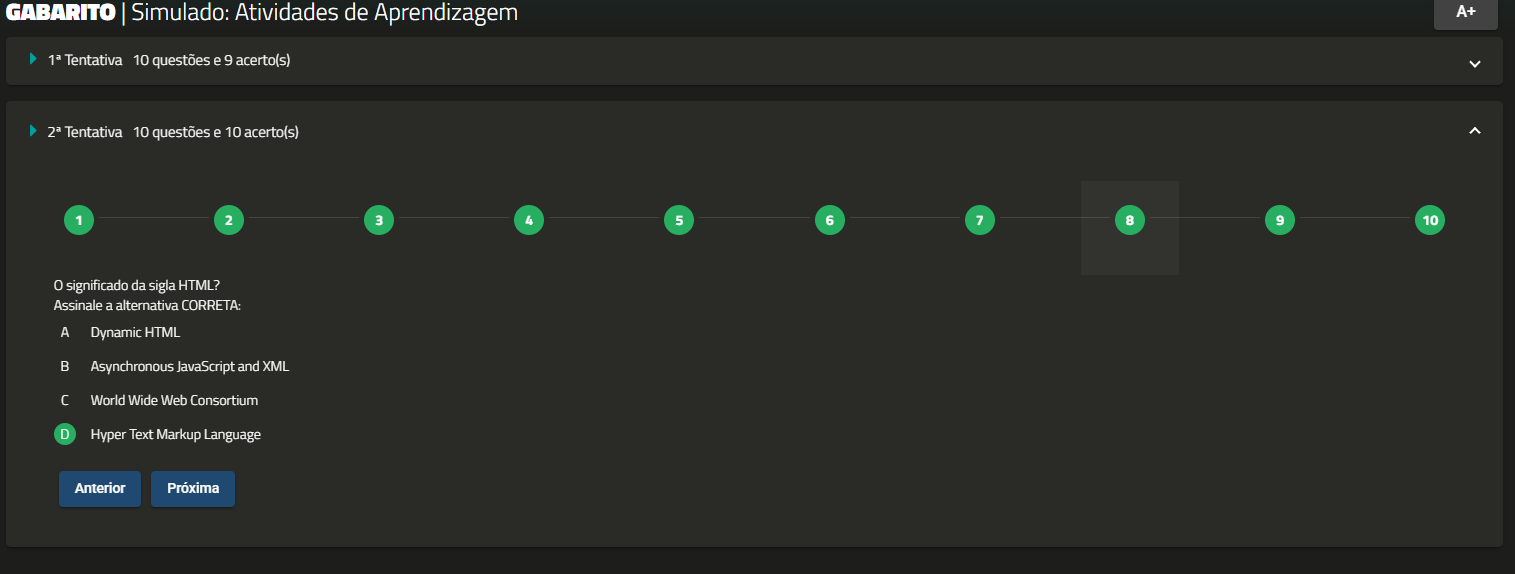 GABARITO Simulado: Atividades de Aprendizagem A+ Tentativa 10 questões e 9 acerto(s) Tentativa 10 questões e 10 acerto(s) 1 2 3 4 5 6 7 8 9 10 0 significado da sigla HTML? Assinale a alternativa CORRETA: A Dynamic HTML B Asynchronous JavaScript and XML C World Wide Web Consortium D Hyper Text Markup Language Anterior Próxima