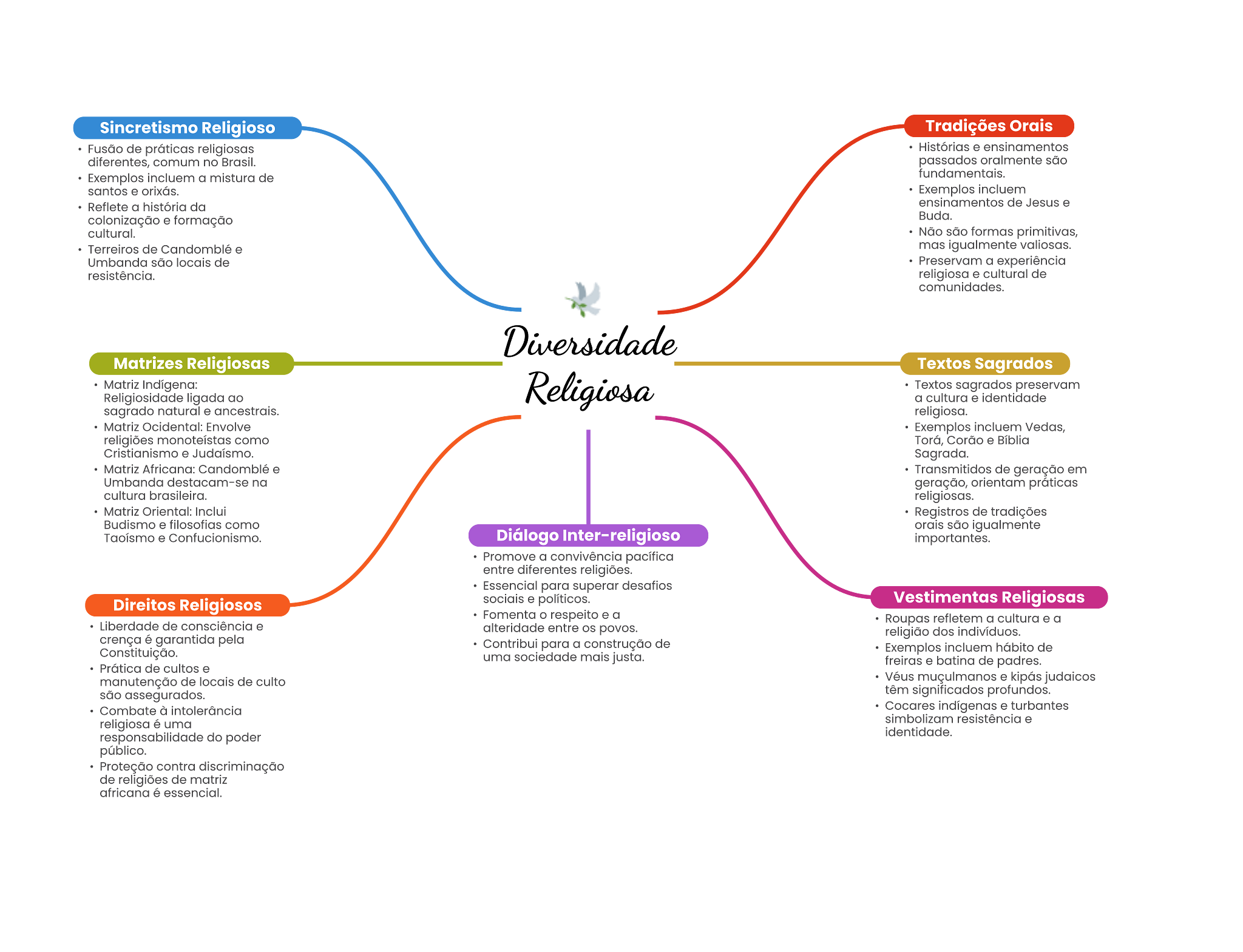 Sincretismo Religioso Tradições Orais Fusão de religiosas comum no passados são Exemplos a mistura de fundamentale. . Exemplos incluem Reflete a história da ensinamentos de . colonização . Buda. cultural. Não são formas primitivas, Terreiros de e mas Umbanda são de Preservam a experiência religiosa . cultural de comunidades. Matrizes Religiosas Textos Sagrados Matriz Textos sagrados preservam Religiosidade ligada ao a cultura identidade sagrado natural religiosa. Matriz Envolve Vedas, religiões como . Biblia Sagrada. Matriz @ Transmitidos de geração em Umbanda na geração, orientam cultura religiosas. Matriz Registros de tradições como são Diálogo Inter-religioso Promove a convivência entre diferentes religiões. Essencial para superar Direitos Religiosos politicos. Vestimentas Religiosas Fornenta respeito e a Liberdade de consciência . Roupas refletern a cultura a alteridade entre povos. crença é garantida pela dos Contribul para a construção de Constituição. Exemplos hábito de uma sociedade de cuitos e freiras batina de padres. manutenção de locale de . são têm significados profundos. Combate à turbantes religiosa uma resistência responsabilidade do poder Proteção contra discriminação de religiões de matriz africana essencial.