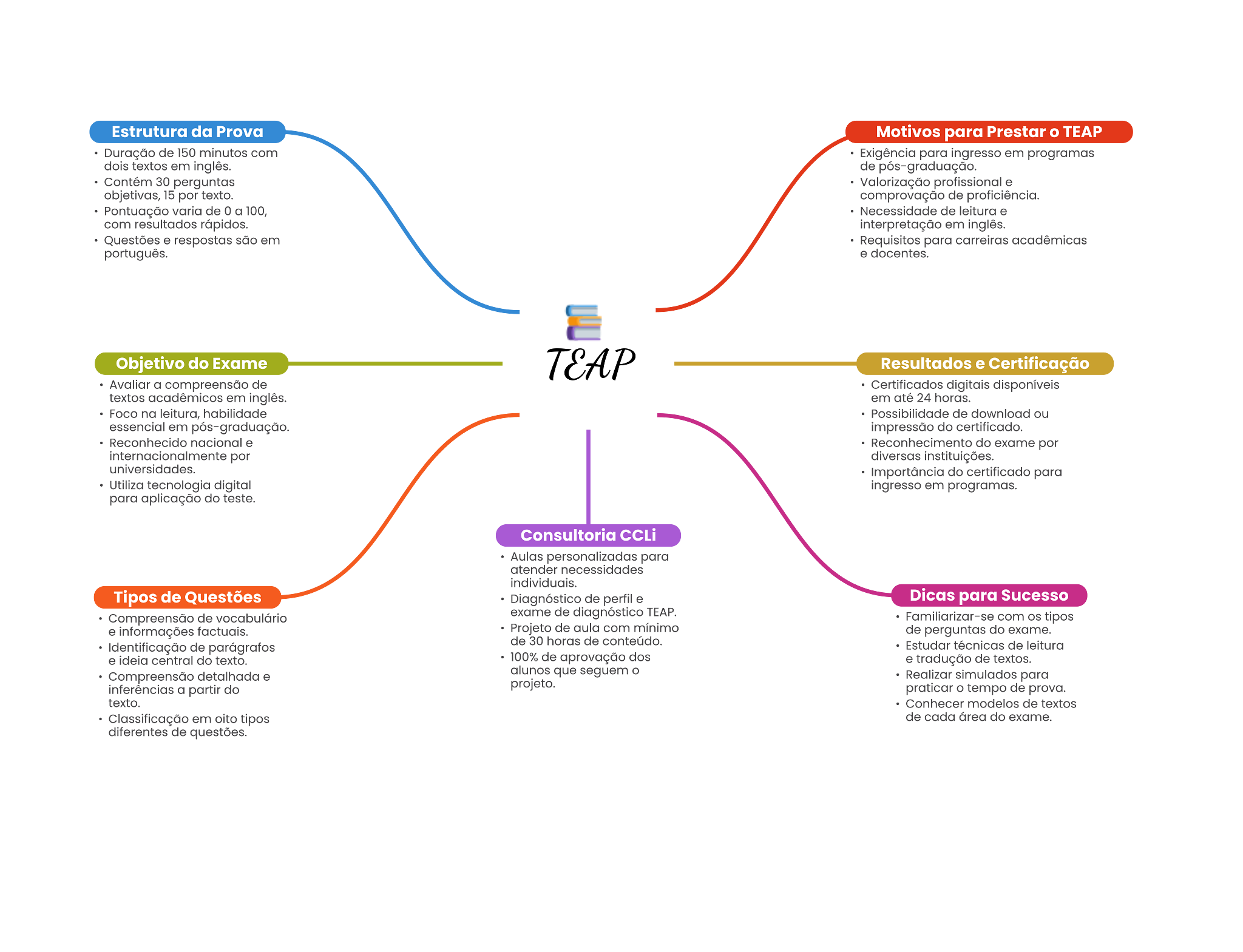 Estrutura da Prova Motivos para Prestar TEAP Duração de 150 minutos com para ingresso em dois textos em de Contém 30 perguntas Valortzação profissional por texto. comprovação de proficiência. Pontuação varia de 0 a 100, de leitura com resultados rápidos. em Questões respostas são em Requisitos para carreiras acadêmicas português. docentes. Objetivo do Exame Resultados e Certificação Avaliar a de Certificados digitals textos acadêmicos em em até 24 Foco na leitura, habilidade Possibilidade de download ou essencial em do certificado. Reconhecido nacional Reconhecimento do por por instituições. universidades. do certificado para Utiliza tecnologia digital em programas. para aplicação do Consultoria CCLi personalizadas para atender necessidades Tipos de Questões Diagnóstico de perfil . Dicas para Sucesso de vocabulário de diagnóstico TEAP. com tipos e Projeto de aula com mínimo de do de de 30 horas de Estudar de leitura central do 100% de aprovação dos 0 tradução de taxtos. detalhada alunos que seguem Realizar para inferências a partir do projato. praticar tempo de prova. Conhecer modelos de Ciassificação em tipos de cada do diferentes de questões.
