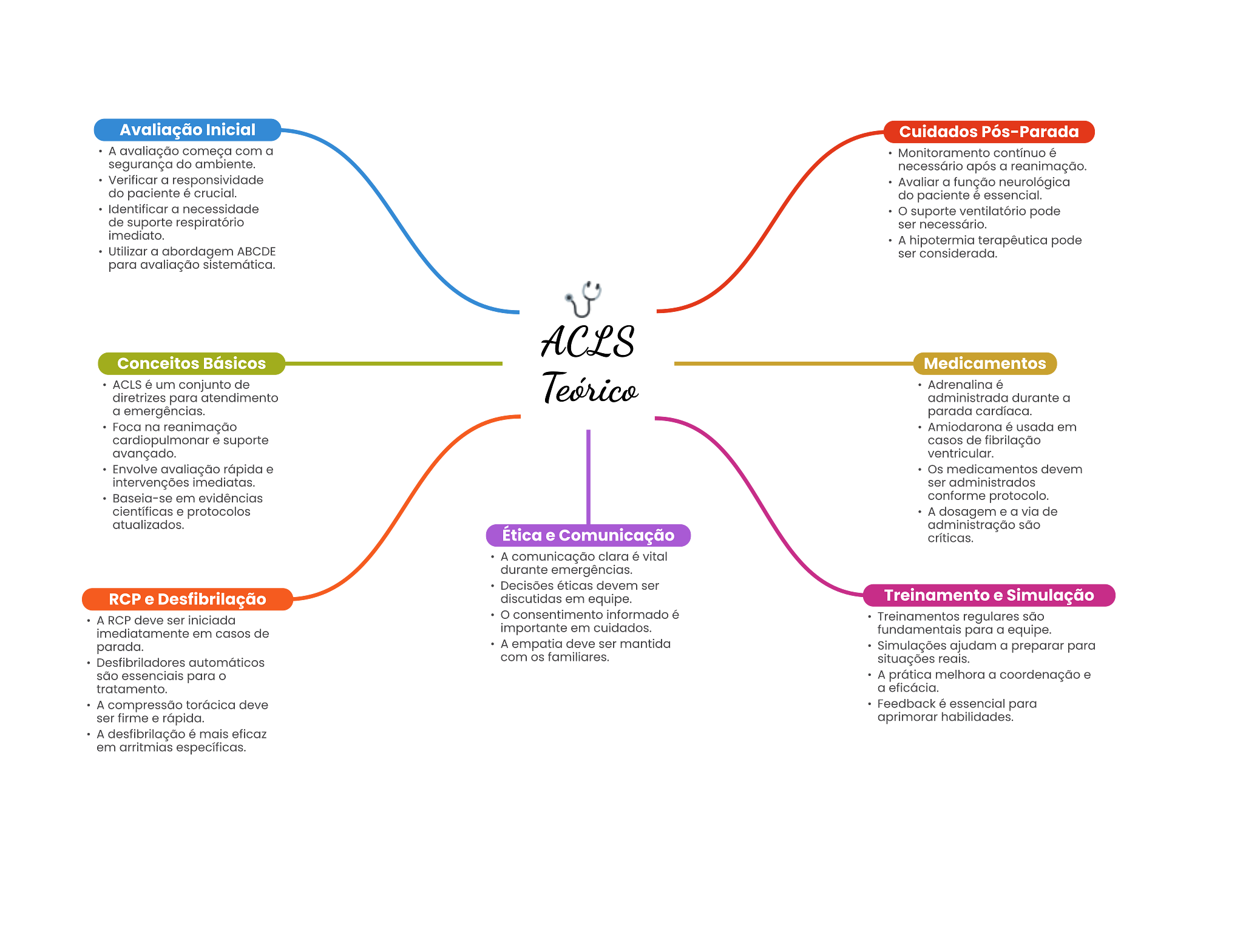 Avaliação Inicial Cuidados Pós-Parada A avaliação começa com a contínuo é segurança do após a Verificar a responsividade a função neurológica do paciente do paciente & a suporte ventilatório pode de suporte respiratório ser necessário. A hipotermia terapêutica pode Utilizar a abordagem ABCDE ser considerada. para Conceitos Básicos Medicamentos ACLS um conjunto de é para atendimento administrada durante a a emergências. parada cardiaca. Foca na reanimação Amlodarona usada em casos de avançado. ventricular. Envolve rápida Os medicamentos ser administrados em evidências conforme protocolo. e protocolos A dosagem e a via de administração são Ética e Comunicação A comunicação clara vital durante éticas devem RCP e Desfibrilação discutidas em equipe. Treinamento e Simulação A RCP deve consentimento é Treinamentos regulares imediatamente em de importante em fundamentale para a squipe. parada. A empatia deve ser mantida ajudam a preparar para automáticos com familiares. para A prática melhora a coordenação tratamento. a A compressão torácica deve . Feedback essencial para ser firme . aprimorar habilidades. A mais eficaz em