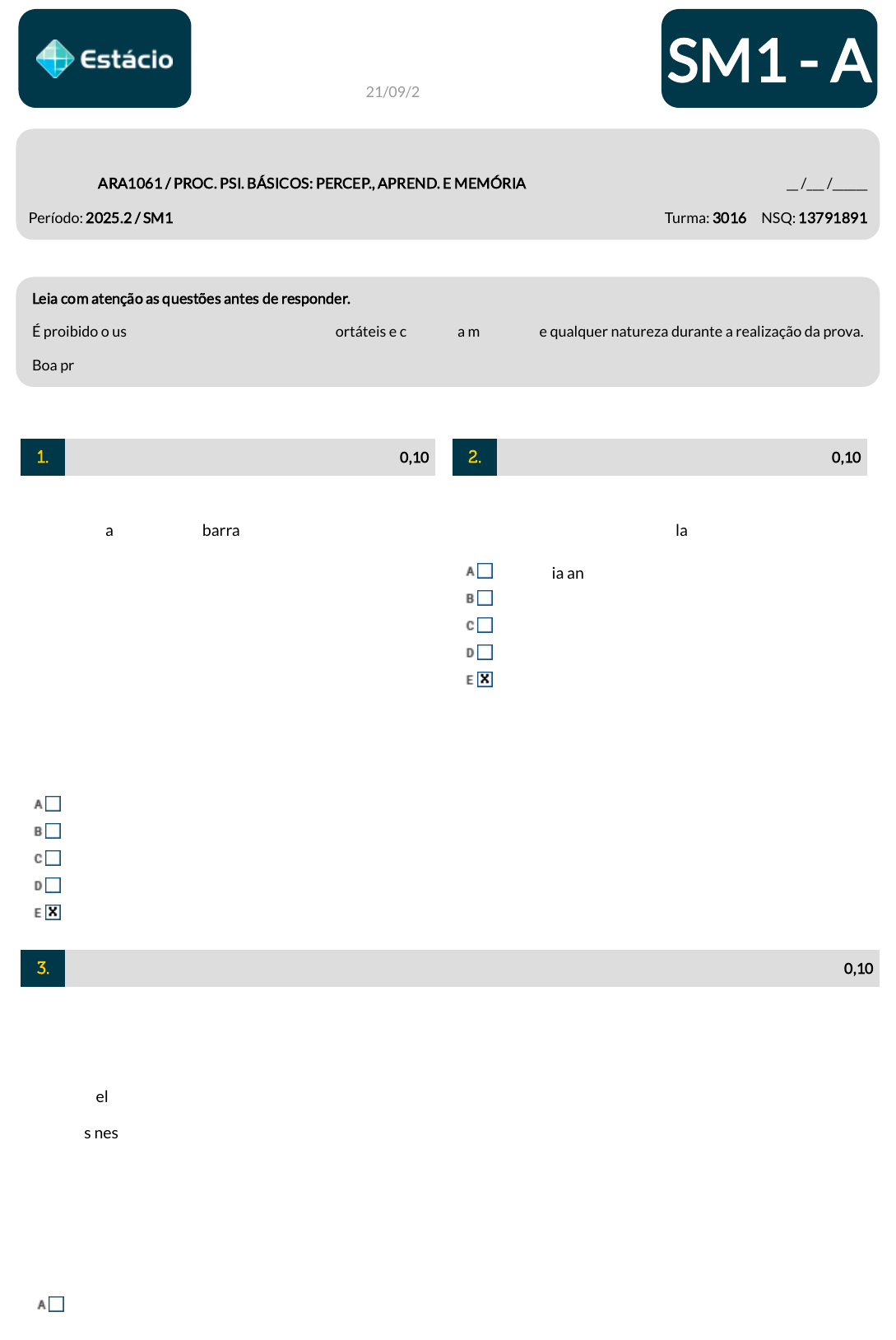 7064445206 SM1 - A 21/09/2025 21:21 Nome: Matrícula: ____________________ Disciplina: ARA1061 / PROC. PSI. BÁSICOS: PERCEP., APREND. E MEMÓRIA Data: ___ /___ /______ Período: 2025.2 / SM1 Turma: 3016 NSQ: 13791891 Leia com atenção as questões antes de responder. É proibido o uso de equipamentos eletrônicos portáteis e consulta a materiais de qualquer natureza durante a realização da prova. Boa prova. 1. _______ de 0,10 Phineas Gage foi reconhecido por sobreviver a um acidente quando trabalhava na construção de ferrovias em Vermont, EUA. Nesse acidente uma barra de aço entrou pela bochecha esquerda, destruiu o olho, atravessou a parte frontal do cérebro, e saiu pelo topo do crânio, do outro lado. Apesar da lesão, Gage conseguia conversar com seus colegas de trabalho e explicar ao médico que o socorreu o que havia acontecido. Depois desse acidente, o relato é que Gage mudou muito os seus comportamentos e sua personalidade. Gage já não conseguia seguir regras sociais e tinha comportamentos inadequados. Sabendo que a lesão de Gage ocorreu no lobo frontal, assinale a alternativa que representa a função cognitiva alterada. Habilidade motora. Processamento auditivo. Sistema límbico. Memória semântica. Funções executivas. 2. _______ de 0,10 Quando o paciente não se lembra de eventos que ocorreram antes do trauma, mas se lembra de coisas que aconteceram depois, estamos falando de: Amnésia anterógrada Hipermnésia Amnésia global Hipomnésia Amnésia retrógrada 3. _______ de 0,10 Correlacione os itens da coluna abaixo às informações correspondentes: (1) Memória procedural (2) Priming (3) Hipocampo (4) Cerebelo ( ) Lesões nesta estrutura resultam em amnésia anterógrada. ( ) É um tipo de memória implícita que nos permite fazer certas tarefas sem pensar sobre elas, como andar de bicicleta. ( ) Memória evocada através de dicas. ( ) Nele, temos a memória dos nossos hábitos motores. Assinale a sequência correta, de cima para baixo: 2, 1, 3, 4 4, 1, 2, 3 1, 3, 2, 4 1, 2, 3, 4 3, 1, 2, 4 4. _______ de 0,10 Zelazo, Qu e Müller (2005) propuseram uma classificação das Funções Executivas em processos executivos "frios" (cold) e "quentes" (hot). Os componentes "frios" desta classificação correspondem a: capacidade de arquivamento e recuperação consciente de informações relacionadas a experiências vividas ou informações adquiridas pelo indivíduo. a aspectos emocionais como crenças e desejos, como a regulação do afeto, da motivação e do próprio comportamento social. aspectos mais lógicos, como o raciocínio lógico e abstrato, o planejamento, a resolução de problemas e a memória de trabalho. a tomada de decisão, a experiência de recompensa e punição, a teoria da mente, as interpretações pessoais e o julgamento moral. o sistema de resgate de informações vivenciadas pelo sujeito que permitem ao indivíduo remeter-se a experiências anteriores. 5. _______ de 0,10 O cérebro coordena uma complexa rede de comunicação proveniente do corpo e do meio externo, englobando processos como a atenção e a consciência. Leia com muita atenção as frases abaixo que estão relacionadas com as bases neurológicas da atenção e da consciência: 1. O córtex cerebral está envolvido nas percepções conscientes, pensamento abstrato, raciocínio, planejamento, funções executivas, tomada de decisão. 2. A ativação da consciência vem de centros vegetativos, mas o seu conteúdo vem do córtex cerebral. 3. As estruturas mais afastadas do córtex cerebral processam informações do meio ambiente, permitindo a execução de respostas voluntárias ou conscientes. 4. As estruturas mais próximas do córtex cerebral estão relacionadas com as respostas automáticas para estímulos internos. 5. A formação reticular estimula a atividade cortical, sem essa ativação, não existe consciência. É CORRETO apenas o que se afirma em: 3 e 4. 1; 2 e 3. 2; 3; 4 e 5. 1; 2 e 5. 1 e 3. 6. _______ de 0,10 Nas animações Procurando Nemo (2003)¹ e Procurando Dory (2016)² da Pixar Studios, a icônica personagem Dory chama a atenção devido a sua memória, que se apresenta bastante limitada nos referidos filmes. Segundo o neurocientista Paulo Mattos (2016)³, a hipótese cognitiva é que Dory provavelmente teve uma hipoxia neonatal (falta de oxigenação no cérebro quando saiu do ovo) que lesionou o hipocampo, ocasionando um quadro de amnésia anterógrada. ¹Procurando Nemo [DVD]. Pixar Animation Studios, 2003. (100 min.), son., cor, legendado. ²Procurando Dory [DVD]. Pixar Animation Studios, 2016. (97 min.), son., cor, legendado. ³VAIANO, Bruno. Entenda o que há de errado com a memória de Dory: A GALILEU chamou um neurocientista para diagnosticar a peixinha azul. Revista Galileu. 2016. Disponível em: https://revistagalileu.globo.com/Ciencia/noticia/2016/07/entenda-o-que-ha-de-errado-com-memoria-de-dory.html A partir do exposto é possível afirmar que a personagem Dory teve somente a capacidade de aprendizagem acadêmica afetada. perdeu a capacidade de aprender hábitos motores. não teve sua capacidade de aprendizagem afetada. perdeu a capacidade de aprender novas informações sobre episódios, lugares, nomes de pessoas e afins. é capaz de aprender novas informações sobre episódios, nomes e coisas afins. 7. _______ de 0,10 Também conhecida como memória explícita, corresponde às memórias que estão prontamente acessíveis à nossa consciência e que podem ser evocadas através de palavras. Esta definição refere-se à memória ____________ : Não declarativa Declarativa Episódica Semântica De Trabalho 8. _______ de 0,10 O que é o sistema atencional? Os componentes pessoais são os seguintes: O Professor e o Aluno. E os componentes não pessoais são os seguintes: problema, objecto, objectivo, conteúdo, método, meios, formas organizativas e avaliação. Segundo as modernas teorias cognitivas, que estudam fenômenos básicos da inteligênci