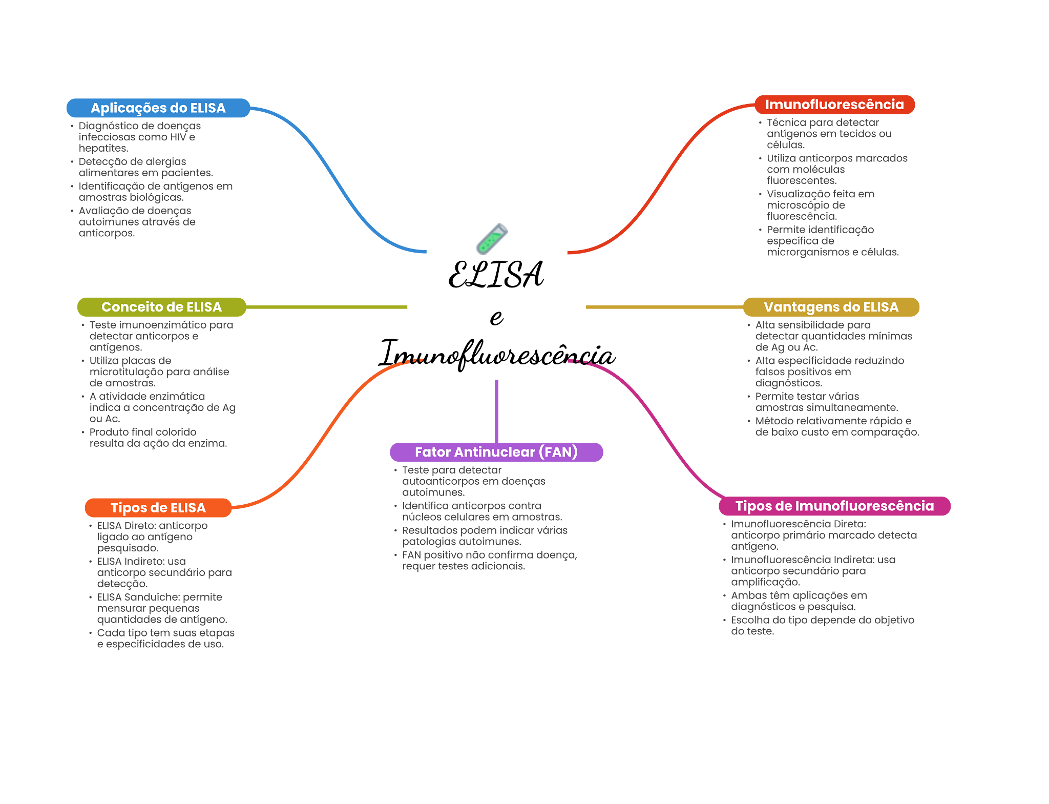 Aplicações do ELISA Imunofluorescência Diagnóstico de doenças Técnica para . em tecidos ou Datecção de Utiliza anticorpos marcados em pacientes. com de em fluorescentes. amostras biológicas. Visualização felta em de microscópio de autoimunes atravée de Permite específica de . Conceito de ELISA Vantagens do ELISA Teste para Alta para detector anticorpos detector quantidades mínimos de Ag ou Ác. Utiliza de Alta especificidade reduzindo microtitulação para positivos em de diagnósticos. A atividade enzimática a concentração de Ag ou Ac. Método relativamente rápido Produto final colorido de custo em comparação. resulta da ação da enzima. Fator Antinuclear (FAN) Teste para detector em autoimunes. Tipos de ELISA contra Tipos de Imunofluorescência em amostras. ELISA Direto: anticorpo Direta: ligado Resultados podem patologias autoimunes. anticorpo primário marcado detecta pesquisado. ELISA usa FAN positivo não confirma secundário para requer testes anticorpo secundário para detecção. ELISA permite Ambas têm aplicações em mensurar pequenas diagnósticos quantidades de antigeno. Escolha do tipo depende do objetivo Cada tipo etapas do teste. de uso.