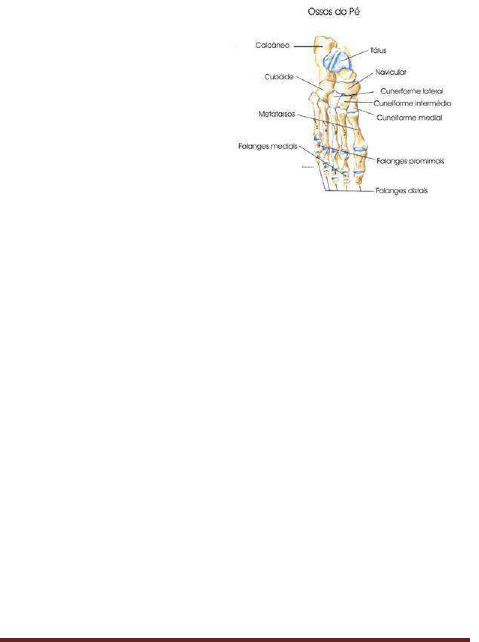 Tornozelo e Pé Página 1 TORNOZELO E PÉ 1. FUNCIONALIDADE DO PÉ O pé possui funções importantes como suportar o peso e servir como alavanca para impulsionar o corpo. A construção do pé com vários ossos e articulações, permite a adaptação do pé aos tipos de superfícies, além de aumentar sua ação propulsora. 2. ESQUELETO DO PÉ O pé humano é composto de 26 ossos assim distribuídos: sete ossos do tarso (tálus, calcâneo, cuboide e os três cuneiformes); cincos ossos do metatarso; 14 falanges (três para cada um dos dedos, exceto para o hálux, que tem apenas duas). Quase todos os ossos se unem por articulações sinoviais, conferindo mobilidade necessária para se adaptar a forças longitudinais aplicadas sobre o pé e se moldar aos diferentes tipos de superfícies durante a marcha. 2.1- Os ossos do tarso (do grego – tarso = superfície plana) - São ossos pares e curtos, totalizando sete ossos em cada pé. 2.1.1- O tálus (do latim – talus = tornozelo, dado de jogar), articula-se, proximalmente, com a face inferior da tíbia e, as porções articulares dos maléolos (lateral e medial – faces articulares), constituindo a articulação talocrural (tornozelo). O tálus repousa sobre o calcâneo. É dividido em três principais porções: tróclea (face articular para o tornozelo), colo (região estreita) e a cabeça (porção que se articula com o navicular). Ele não tem nenhuma inserção muscular, no entanto, todos os músculos extrínsecos passam por ele para inserir-se nos ossos do pé. 2.1.2- O calcâneo (do latim – calx = calcanhar) é o maior osso do tarso. Recebe toda a carga proveniente do corpo. Articula-se com os ossos: tálus, navicular e cuboide. Recebe a inserção do músculo tríceps sural (tendão do calcâneo, denominado antigamente como tendão de “Aquiles”). 2.1.3- Osso cuboide (do grego – kúbus = cubo, óides = forma de) articula-se com o calcâneo, navicular e com a base do 4º e 5º metatarsais. 2.1.4- Osso navicular (do latim – navícula = diminutivo de navio) articula-se com a cabeça do tálus, cuboide e os três cuneiformes. É também chamado de escafoide. 2.1.5- Ossos cuneiformes (do latim – cuneus = cunha, formis = forma de), são nomeados no sentido transversal, sendo, cuneiforme medial, intermédio e lateral. Os cuneiformes se articulam com o osso navicular e com a base do 1º, 2º e 3º metatarsais. 2.2- Ossos metatarsais (do grego – meta = depois) são em número de cinco ossos, numerados de medial para lateral (desta forma, o 1º está no hálux). São ossos longos e podemos identificar três regiões: base, corpo e cabeça. As bases dos ossos metatarsais se articulam com os ossos tarsais. As cabeças dos ossos metatarsais se articulam com a base das falanges proximais, constituindo a articulação metatarsofalangiana. Comumente, na cabeça dos 1º metatarsos estão localizados dois ossos supranumerários, os ossos sesamoides lateral e medial. Em alguns casos a tuberosidade do Vº metatarsal pode desenvolver-se separada, imersa no tendão do músculo fibular longo, formando um osso sesamoide, denominado de osso de Vesalius. 2.3- As falanges (do grego – phalanx = tropa de soldados). A phalanx era uma formação de infantaria grega em fileiras. Aristóteles utilizou o termo para os ossos dos dedos, devido sua disposição em fileiras. São em número de 14 falanges em cada pé, formando o esqueleto dos dedos, divididas em proximais, médias e distais, com exceção no hálux (formado pelas falanges proximal e distal). As Tornozelo e Pé Página 2 falanges possuem uma base (articulada com o osso metatarsal correspondente), um corpo e uma tróclea (articula-se com a base da próxima falange correspondente). As articulações entre as falanges são denominadas de articulações interfalangianas (proximal e distal, exceto no hálux). 3. DIVISÃO CLÍNICA DO ESQUELETO DO PÉ Clinicamente o pé é dividido em três porções: 3.1- O retropé ou região posterior: formado pelos ossos tálus e calcâneo, é o ápice do pé e parte da articulação do tornozelo. Ele basicamente sustenta o corpo por sua articulação com a tíbia, no encaixe do tornozelo. O calcâneo é a porção posterior do pé em contato direto com o solo. Na sustentação do peso, o retropé sustenta 2/3 do peso do corpo. 3.2- O mediopé ou região média: formado pelos ossos navicular, cuboide e cuneiformes medial, intermédio e lateral. 3.3- O antepé ou região anterior: constituído pelos metatarsos e falanges. A articulação entre o mediopé e antepé, articulação tarsometatarsal, também é conhecida como articulação de Lisfranc. O antepé sustenta cerca de 1/3 do peso. 4. ARCOS DO PÉ Para se adaptar às irregularidades do solo, suportar o peso do corpo e a força de reação do solo, o pé é constituído por três arcos plantares que funcionam como amortecedores e que distribuem as cargas recebidas pelos pés em três regiões: calcâneo (60% da carga), mediopé (8%) e antepé, principalmente cabeça do quinto e primeiro metatarsos (32%). Considerada em conjunto, a arquitetura da planta do pé pode ser definida como uma abóbada sustentada por três arcos. Os arcos plantares tem como função receber o peso do corpo, amortecer os choques de deambulação, participar da adaptação do pé no solo e constituem alavancas de impulso na marcha. A maior parte da sustentação dos arcos é fornecida pelos ligamentos plantares, pela aponeurose plantar (ou fáscia plantar) e pelos músculos plantares curtos (quadrado plantar e flexor curto dos dedos), tibiais anterior e posterior. 4.1- Arcos transversos Arco transverso tarsal - O segmento funcional médio consiste de cinco ossos tarsais: o navicular, o cuboide e os três ossos cuneiformes. Sua configuração e seus firmes ligamentos interósseos formam um arco rijo. Esses ossos no arco constituem articulações “lado a lado” sustentadas por ligamentos e pelos tendões dos músculos fibular lon