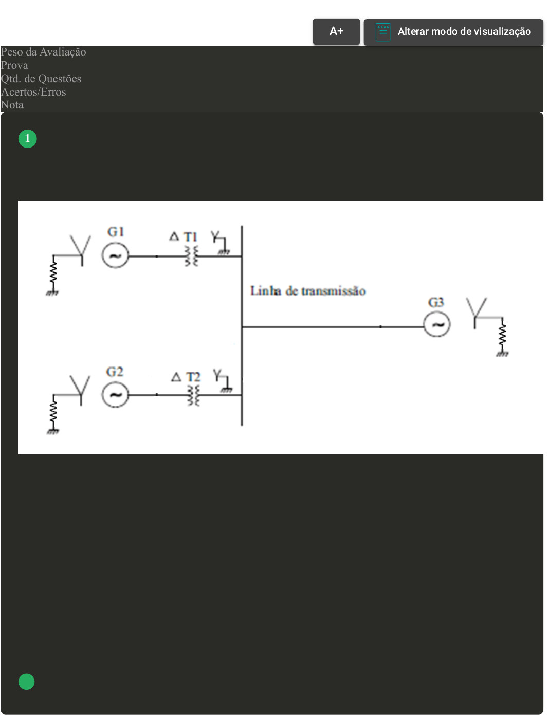 Prova Impressa GABARITO | Avaliação II - Individual (Cod.:1525935) Peso da Avaliação 2,00 Prova 107472095 Qtd. de Questões 10 Acertos/Erros 10/0 Nota 10,00 Ao estudarmos Sistemas Elétricos de Potência, nos deparamos com os diagramas unifilares. Esses diagramas, representados através de símbolos padronizados, facilitam a representação e diminuem a quantidade de elementos do sistema. A seguir é demonstrado um diagrama unifilar para um sistema elétrico simples. Com relação ao diagrama unifilar apresentado, classifique V para as sentenças verdadeiras e F para as falsas: ( ) O diagrama unifilar possui três geradores aterrados através de resistência e dois transformadores na configuração delta-estrela. ( ) O diagrama unifilar possui três geradores aterrados através de reator e dois transformadores na configuração delta-estrela. ( ) O diagrama unifilar possui três geradores aterrados através de resistência e dois transformadores na configuração estrela-estrela aterrado. Assinale a alternativa que apresenta a sequência CORRETA: A F - V - F. B V - F - V. C F - F - V. D V - F - F. VOLTAR A+ Alterar modo de visualização 1 Quando falamos sobre o rendimento de uma máquina elétrica, geralmente estamos nos referindo ao seu desempenho em plena carga, ou seja, quando ela está trabalhando com corrente e potência nominais, sob a tensão e a rotação correta. É importante ressaltar que o rendimento declarado deve ser o rendimento real dessa máquina nessas condições ideais, a menos que sejam mencionadas quaisquer observações específicas. Considere um motor com uma potência útil de 14.000 W e a potência absorvida de 15.000 W. Com relação ao exposto, analise as sentenças a seguir: I- Com base na consideração de que a potência absorvida é a soma da potência útil e das perdas, constatamos que o motor em questão apresenta uma potência não aproveitada de 1000 W, correspondente às perdas. II- O rendimento pode ser encontrado multiplicando a potência útil pela potência absorvida, visto que as medidas estão diretamente ligadas. III- Quando um motor atinge um estado estável de operação, chamado de regime permanente, podemos afirmar que a potência absorvida é igual à soma da potência útil e das perdas. IV- O rendimento do motor apresentado no problema será maior que 1.Assinale a alternativa CORRETA: A As sentenças I e IV estão corretas. B Somente a sentença III está correta. C As sentenças II e III estão corretas. D As sentenças I e III estão corretas. [Laboratório Virtual – Indução mútua entre duas bobinas] Como verificado no experimento, ao colocarmos o mouse sobre cada bobina, irá aparecer o número de espiras de cada uma delas. Considere que o transformador do experimento é um transformador ideal e possui o mesmo número de espiras demonstrado no laboratório. Dessa forma, é possível estabelecer uma relação de proporção adequada entre as espiras dos enrolamentos. Assinale a alternativa CORRETA que apresenta a relação de transformação para esse caso: A A relação de transformação é igual a 3. B A relação de transformação é igual a 6. C A relação de transformação é igual a 2. D A relação de transformação é igual a 1. “A energia reativa, ao sobrecarregar uma instalação elétrica, inviabiliza sua plena utilização, condicionando a instalação de novas cargas a investimentos que seriam evitados se o fator de potência apresentasse valores mais altos. O “espaço” ocupado pela energia reativa poderia ser então utilizado para o atendimento de novas cargas. Os investimentos em ampliação das instalações estão relacionados principalmente aos transformadores e condutores necessários. O transformador a ser instalado deve atender à potência total dos equipamentos utilizados, mas devido à presença de potência reativa, a sua capacidade deve ser calculada com base na potência aparente das instalações. 2 3 4 Com base no texto e na imagem apresentada, analise as sentenças a seguir: I- Ao verificar a carga do circuito apresentado, é possível concluir que se trata de uma carga indutiva, com o ângulo de impedância negativo. II- O circuito apresentado possui uma carga capacitiva, visto que o ângulo da impedância é negativo. III- Considerando uma corrente (I) de 10 A aplicada no circuito apresentado, a potência aparente fornecida à carga é de 2,2 kVA IV - Com o fator de potência fp = 0,707 e a corrente I = 10A, a potência ativa fornecida à carga é igual a 2,2 kVA. Assinale a alternativa CORRETA: Fonte: Conceitos básicos de Fator de Potência | Engelétrica. Disponível em: http://engeletrica.com.br/fatordepotencia-manual-fatordepotencia.html. Acesso em: 27 jun. 2023. A As sentenças II e III estão corretas. B Somente a sentença III está correta. C As sentenças I e IV estão corretas. D As sentenças I e III estão corretas. Uma abordagem comum em sistemas elétricos de potência é utilizar valores de base para normalizar as grandezas elétricas e facilitar as comparações. Considere um equipamento, o qual possui impedância de 0,2 p.u., sua potência nominal é de 10 MVA e a tensão nominal é de 500 kV. Os valores de base no setor onde esse equipamento se encontra é: 20 MVA e 250 kV. Relacionado ao novo valor de sua impedância, assinale a alternativa CORRETA: A 1,6 p.u. B 0,8 p.u. C 0,10 p.u. D 2,0 p.u. Podemos constatar que existem duas vantagens nesse sistema "P.U.", sendo a primeira que as constantes das máquinas e transformadores caem numa faixa numérica razoavelmente estreita quando são expressas num sistema por unidade relacionado às suas características nominais. Nesse caso, a correção dos seus valores vai ser sujeita a uma rápida verificação aproximada. Com base no sistema por unidade (P.U.), classifique V para as sentenças verdadeiras e F para as falsas: ( ) Em um sistema P.U., todas as grandezas são expressas com relação a valores-base específicos,