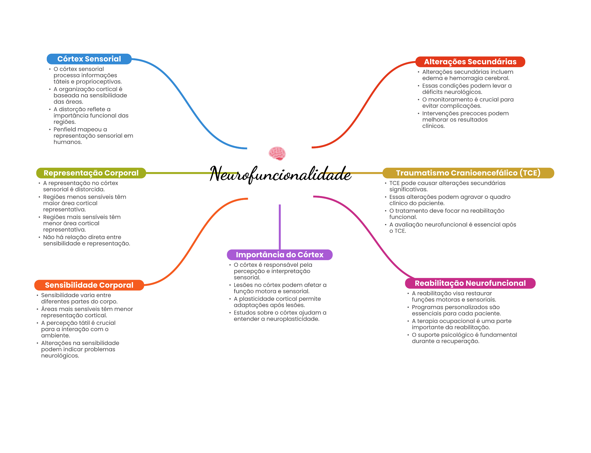 Córtex Sensorial Alterações Secundárias sensorial Alterações proprioceptivas. edema hemorragia cerebral. A cortical Essas condições podem a bassada na sensibilidade déficits neurológicos. monitoramento para A distorção reflete a evitor complicações. Importância funcional dos podem melhorar resultados clinicos. Penfield mapeou a representação sensorial em humanos. Representação Corporal Traumatismo Cranioencefálico (TCE) A representação no córtex TCE pode causar alterações sensorial é distorcida. Regiões menos têm alterações podem quadro área cortical clinico do paciente. representativa. o tratamento deve focar na reabilitação Regiões têm funcional. menor área cortical A neurofuncional é essencial após representativa. o TCE Não há relação direta entre sensibilidade e representação. Importância do Córtex responsável pela percepção sensorial. Sensibilidade Corporal Lesões no podem afetar a Reabilitação Neurofuncional entre função motora sensorial. A reabilitação visa restaurar diferentes do corpo. A plasticidade cortical funções motoras Áreas male têm menor adaptações Programas personalizados são representação cortical. sobre o ajudam a para A percepção crucial entender a A terapia ocupacional uma parte para a com da reabilitação. ambiente. suporte fundamental Alterações na sensibilidade durante a recuperação. podem problemas neurológicos.