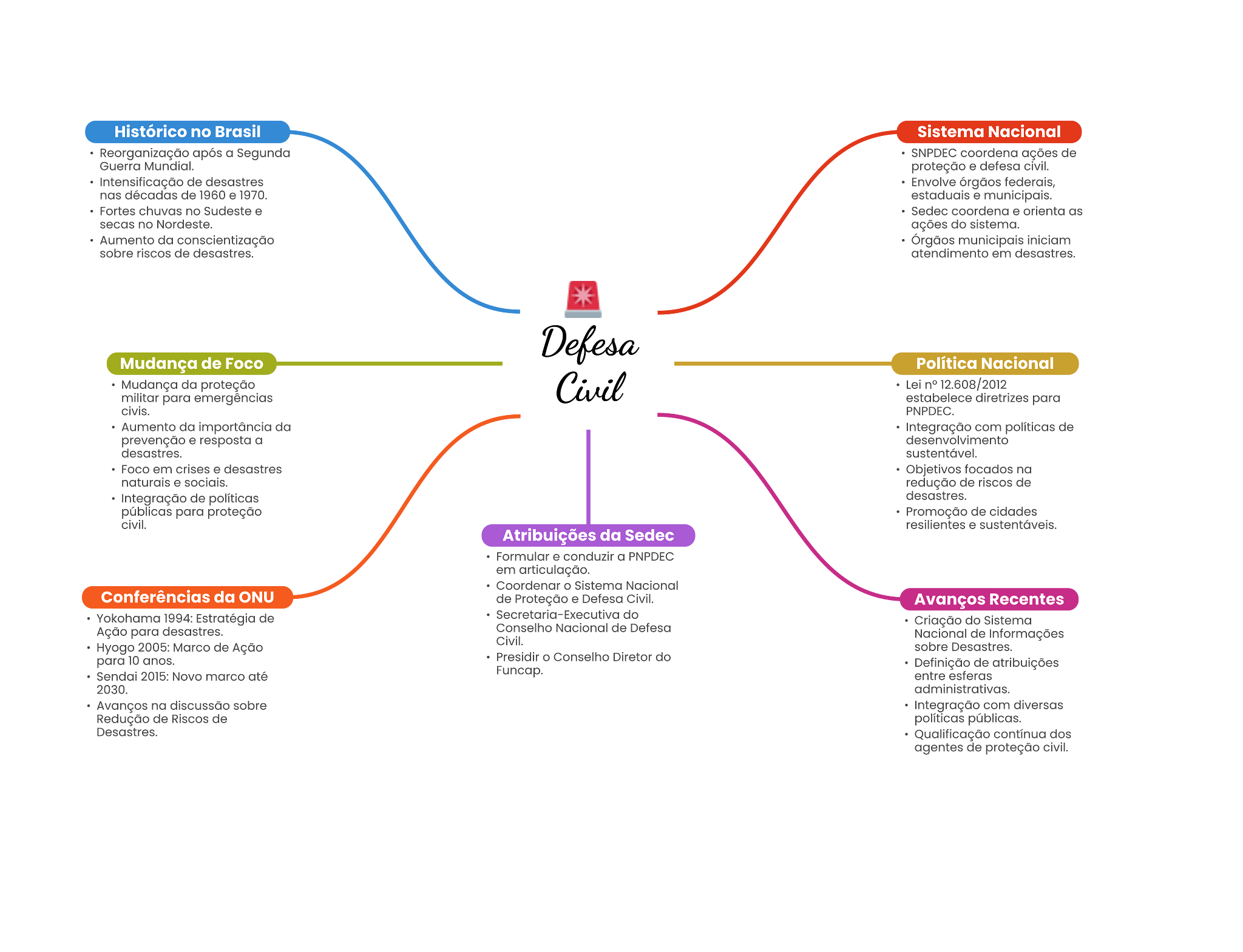 Histórico no Brasil Sistema Nacional Reorganização a Segunda SNPDEC coordena ações de Guerra proteção defesa de Envolve órgãos federais, nas de 1970. Fortes chuvas no Sudeste Sedec orienta as no Nordeste. ações do Aumento da conscientização Órgãos sobre risoos de atendimento em Mudança de Foco Política Nacional Mudança da proteção Lei 12.608/2012 para emergências diretrizes para civis. PNPDEC. Aurnento da da com politicas de prevenção . resposta a Foco em . Objetivos focados na naturals sociale. redução de de de politicas públicas para proteção Promoção de cidades Atribuições da Sedec Formular conduzir a PNPDEC em articulação. Sistema Nacional Conferências da ONU de Proteção Defesa Avanços Recentes Yokohama 1994: Estratégia de do Ação para Conselho Nacional de Defeed Criação do Sistema Nacional de Hyogo 2005: Marco de Ação sobre para Ю anos. Presidir Conselho Diretor do Sendal 2015: Novo marco até Funcap. Definição de atribuições entre 2030. administrativas. Avanços na sobre com Redução de Riscos de politicas públicas. Qualificação continua dos agentes de proteção