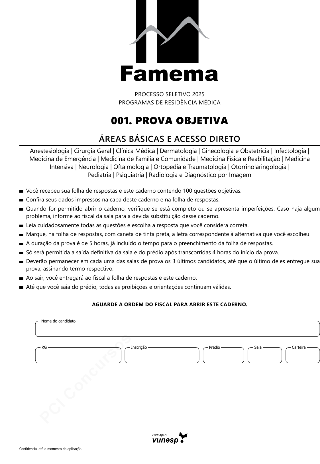 pcimarkpci MjgwNDowMTRjOjAxMDk6OGI0YTo5MDhmOmIxNjU6YzE5MDo2MjE0:V2VkLCAyOSBPY3QgMjAyNSAyMDoyOToxNSAtMDMwMA== www.pciconcursos.com.br Confidencial até o momento da aplicação. Nome do candidato Prédio Sala CarteiraInscriçãoRG processo seletivo 2025 programas de residência médica 001. Prova objetiva ÁREAS BÁSICAS E ACESSO DIRETO anestesiologia | cirurgia geral | clínica médica | dermatologia | ginecologia e obstetrícia | infectologia | medicina de emergência | medicina de Família e comunidade | medicina Física e reabilitação | medicina intensiva | neurologia | oftalmologia | ortopedia e traumatologia | otorrinolaringologia | pediatria | psiquiatria | radiologia e diagnóstico por imagem você recebeu sua folha de respostas e este caderno contendo 100 questões objetivas. Confira seus dados impressos na capa deste caderno e na folha de respostas. Quando for permitido abrir o caderno, verifique se está completo ou se apresenta imperfeições. Caso haja algum problema, informe ao fiscal da sala para a devida substituição desse caderno. leia cuidadosamente todas as questões e escolha a resposta que você considera correta. marque, na folha de respostas, com caneta de tinta preta, a letra correspondente à alternativa que você escolheu. A duração da prova é de 5 horas, já incluído o tempo para o preenchimento da folha de respostas. Só será permitida a saída definitiva da sala e do prédio após transcorridas 4 horas do início da prova. deverão permanecer em cada uma das salas de prova os 3 últimos candidatos, até que o último deles entregue sua prova, assinando termo respectivo. Ao sair, você entregará ao fiscal a folha de respostas e este caderno. Até que você saia do prédio, todas as proibições e orientações continuam válidas. AguArde A ordem do fiscAl pArA Abrir este cAderno. pcimarkpci MjgwNDowMTRjOjAxMDk6OGI0YTo5MDhmOmIxNjU6YzE5MDo2MjE0:V2VkLCAyOSBPY3QgMjAyNSAyMDoyOToxNSAtMDMwMA== www.pciconcursos.com.br 2FMMA2403/001-ÁreasBásicas-AcessoDireto Confidencial até o momento da aplicação. ConheCimentos espeCífiCos ClíniCa MédiCa 01. Paciente de 62 anos, sem histórico de doenças prévias e quadros alérgicos, chega à unidade de saúde com cefaleia, febre e sinais de Kernig e Brudzinski positivos. Empiricamente, neste momento, deve receber (A) ceftrixone 2 g EV de 12/12 horas + dexametasona por 10 – 14 dias. (B) apenas ceftrixone 2 g EV de 12/12 horas por 10 – 14 dias. (C) ciprofloxacino 400 mg EV de 12/12 horas + dexame- tasona por 10 – 14 dias. (D) apenas ciprofloxacino 400 mg EV de 12/12 horas por 10 – 14 dias. 02. Paciente recentemente recebeu confirmação diagnóstica de diabetes melito. Com relação às insulinas, assinale a alternativa correta. (A) Lispro tem ação prolongada e pico de ação com 1 – 2 horas. (B) Regular tem ação intermediária e pico de ação com 2 – 4 horas. (C) Levemir tem ação prolongada e pico de ação 5 – 15 minutos. (D) Glargina tem ação prolongada, sem pico de ação. 03. Durante um cruzeiro de verão no litoral brasileiro, diversos pacientes apresentaram sintomas de intoxicação alimen- tar e precisaram ser atendidos por equipes de saúde. Eles relatam que comeram saladas diversas, além de carne e peixe, e que os sintomas tiveram início duas horas após a alimentação. O agente etiológico mais provavelmente envolvido é: (A) rotavírus. (B) norovirus. (C) estafilococos. (D) salmonela. 04. Paciente de 24 anos chega à unidade de saúde com quadro sugestivo de TEP. É correto afirmar que é fator de risco alto a identificação de (A) gestação. (B) antecedente de trombose venosa profunda. (C) varizes em membros inferiores. (D) uso de anticoncepcional oral. 05. Paciente de 56 anos, com histórico de uso abusivo de álcool nos últimos 35 anos, chega à unidade de saúde desatento, com fala lentificada, raciocínio lento e flapping. Considerando a classificação de West-Haven, ele está inserido no estágio (A) I. (B) II. (C) III. (D) IV. 06. Paciente de 26 anos, sem fatores de risco ou alergias, vem à unidade de saúde, pois, ao fazer exames admis- sionais, encontrou pequeno aumento nas transaminases. Ele não refere viagens recentes para fora de São Paulo, assim como qualquer doença prévia. Não há alterações no exame físico. Mais provavelmente trata-se de (A) exercício físico intenso. (B) hepatite autoimune. (C) doença celíaca. (D) doença de Wilson. 07. Paciente de 64 anos, hipertenso controlado há vários anos, fez uso recente de anti-inflamatório para um quadro de dor lombar e está apresentando há 7 dias declínio na taxa de filtração glomerular. É considerado critério KDIGO: (A) elevação absoluta na creatinina ≥ 0,3 mg/dL dentro de 48 horas. (B) redução do débito urináriode estresse pós-traumático. (D) Esquizofrenia ou outros transtornos psicóticos. pcimarkpci MjgwNDowMTRjOjAxMDk6OGI0YTo5MDhmOmIxNjU6YzE5MDo2MjE0:V2VkLCAyOSBPY3QgMjAyNSAyMDoyOToxNSAtMDMwMA== www.pciconcursos.com.br 18FMMA2403/001-ÁreasBásicas-AcessoDireto Confidencial até o momento da aplicação. 90. A inclusão social e a luta contra o estigma de doença mental são cruciais para a efetividade da psiquiatria social no Brasil. Garantir que pessoas com transtornos mentais possam viver de forma digna e integrada à sociedade é um objetivo central que demanda esforços contínuos de educação, sensibilização e políticas públicas eficazes. Assinale a alternativa que apresenta corretamente um serviço da comunidade que promove inclusão social de pessoas com transtornos mentais no Brasil. (A) Hospital psiquiátrico, que oferece tratamento inten- sivo e prolongado, mas sem interação com a comu- nidade. (B) Clínica particular, que fornece atendimento psicológi- co e psiquiátrico, mas somente para pacientes com condições financeiras favorecidas. (C) Unidade de pronto atendimento, que se concentra apenas em emergências psiquiátricas, sem acompa- nhamento contínuo. (D)