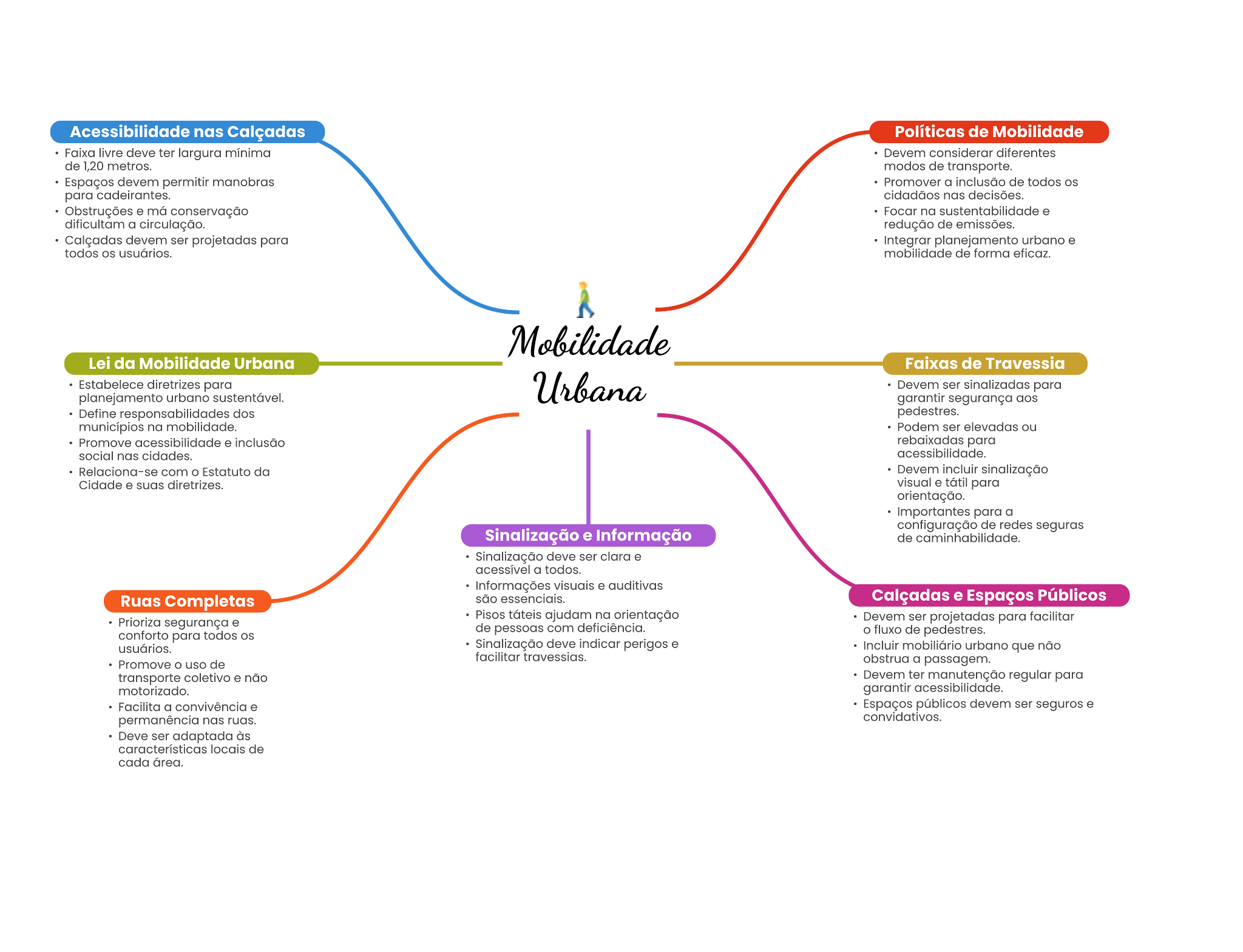 Acessibilidade nas Calçadas Políticas de Mobilidade Fabra livre ter largura Devem considerar diferentes de 1,20 metros. modos de transporta. permitir manobras Promover a de todos para nas decisões. Obstruções má conservação Focar na sustentabilidade a circulação. redução de Calçadas devem ser projetadas para urbano . todos mobilidade de forma Lei da Mobilidade Urbana Faixas de Travessia Estabelece diretrizes para Devem ser para urbano sustentóvel. garantir segurança Define municípios na mobilidade. Podem elevadas ou Promove inclusão para social nas cidades. Relaciona-se com o Estatuto da Devern Cidade para orientação. para a configuração de Sinalização e Informação de Sinalização deve ser clara a todos. visuale . Ruas Completas são Calçadas e Espaços Públicos Prioriza segurança ajudam na orientação Devern ser para facilitar conforto para todos de com deficiência. fluxo de pedestres. Sinalização Indicar perigos Incluir mobiliário urbano que não Promove o uso de obstrua a passagem. transporte coletivo não manutenção regular para motorizado. garantir Facilita a convivência Espaços públicos devem ser permanência convidativos. Deve ser adaptada características de área.