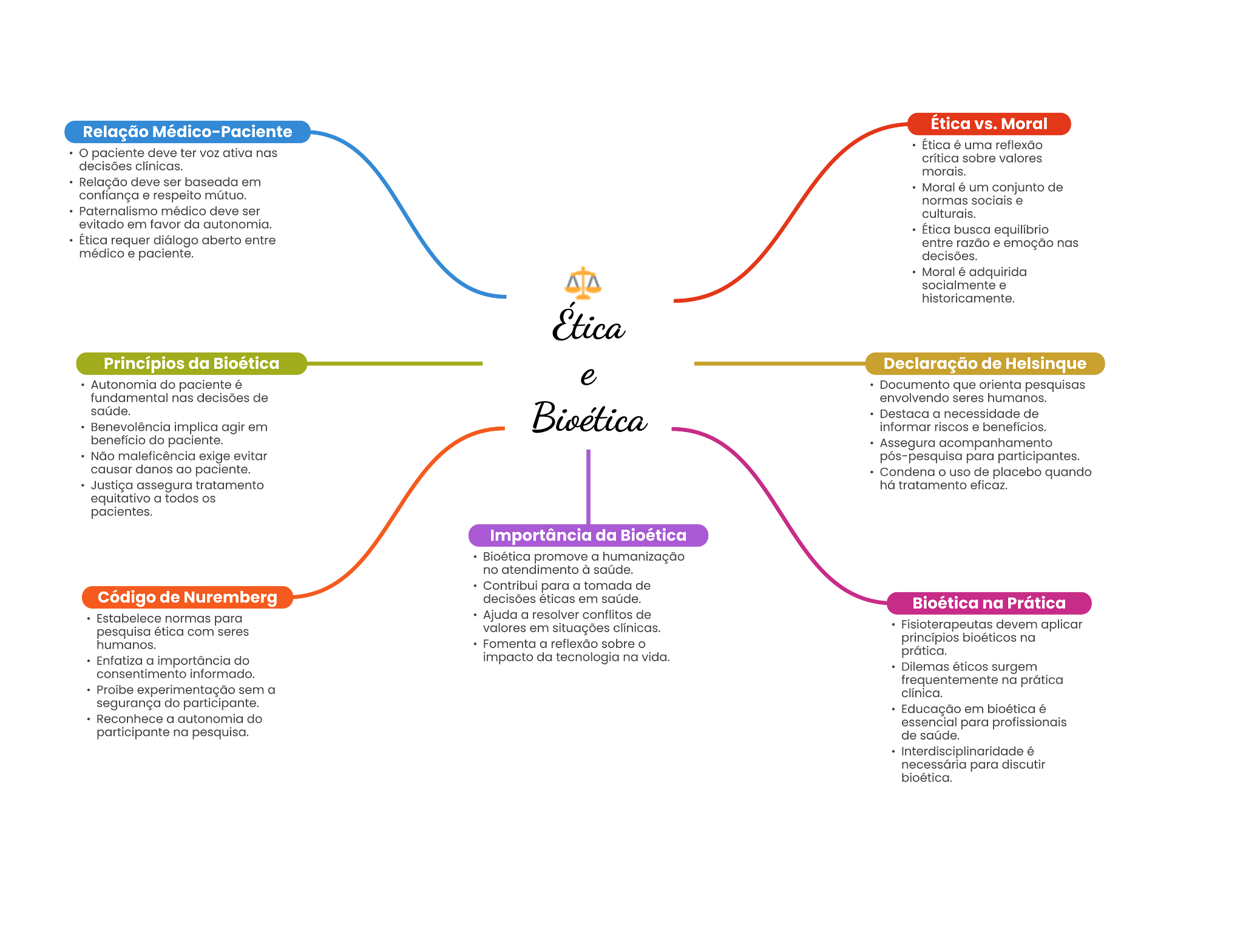 Ética vs. Moral Relação Médico-Paciente Ética é uma reflexão o paciente deve ter voz ativa nos critica sobre valores clinicas. morals. Relação deve baseada em Moral 6 um conjunto de mútuo. normas . médico deve ser evitado em favor da autonomia. Ética busca equilibrio Ética requer diálogo aberto entre entre razão e emoção pacients. Moral é adquirida . Princípios da Bioética Declaração de Helsinque Autonomia do paciente é Documento que orienta fundamental nas decisões de envolvendo seres humanos. Destaca a nacessidade de Benevolência agir em informar riscos beneficios. beneficio do pacients. Assegura acompanhamento Não exige evitar para participantes. causar danos pacients. uso de quando Justiça assegura tratamento há tratamento eficaz. equitativo a todos pacientes. Importância da Bioética promove a humanização no atendimento à soúde. para a tomada de Código de Nuremberg decisões éticas em saúde. Bioética na Prática Estabelece normas para Ajuda a resolver de pesquisa ética com valores em clínicas. devem aplicar humanos. Fornenta a reflexão sobre na impacto da tecnologia na vida. a do consentimento éticos surgem frequentemente na experimentação sem a segurança do participante. Educação em Reconhece a autonomia do essencial para participante na pesquisa. de para discutir