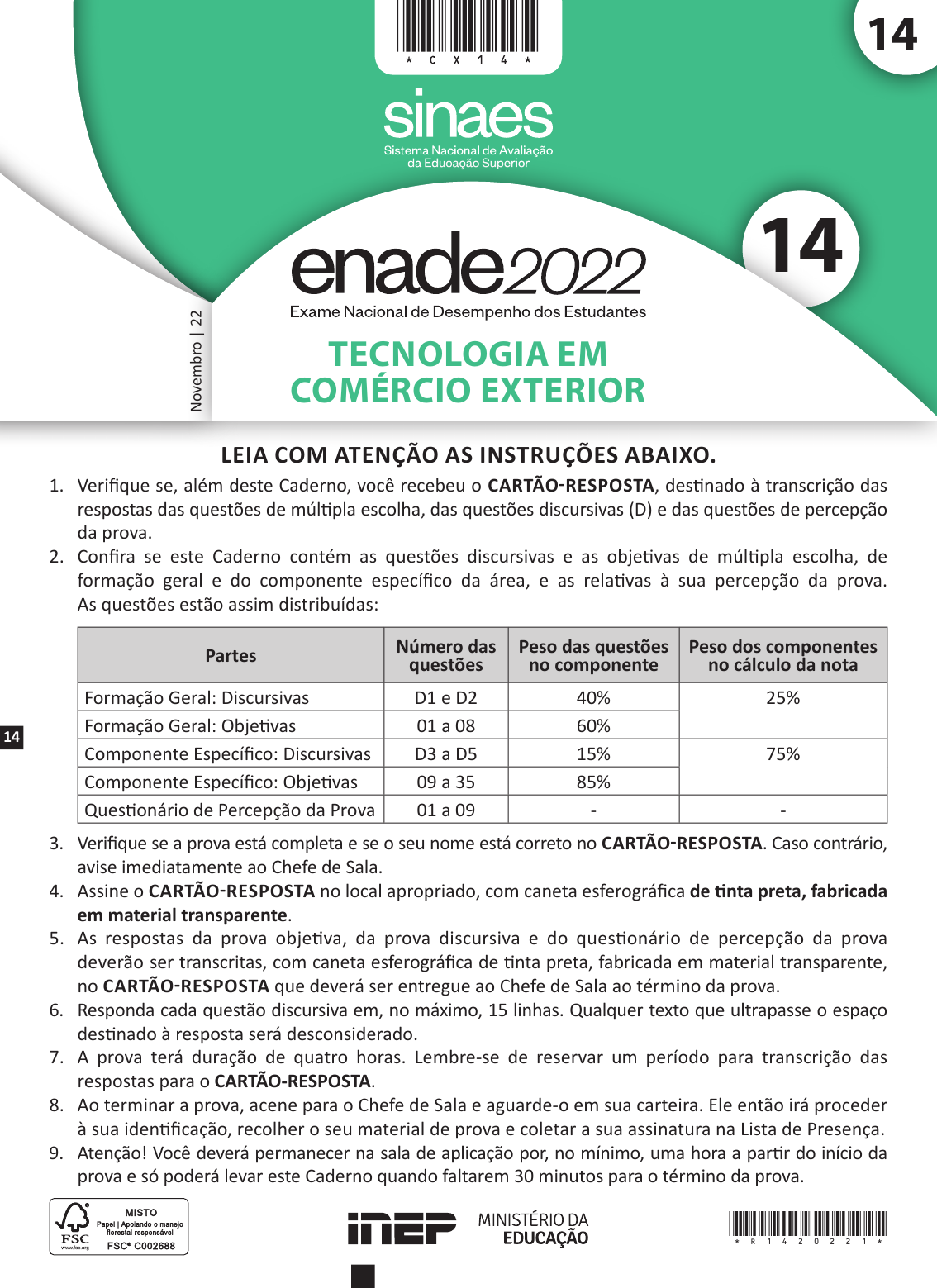14 Tecnologia em comércio exTeriorN ov em br o | 22 14 14 LEIA COM ATENÇÃO AS INSTRUÇÕES ABAIXO. 1. Verifique se, além deste Caderno, você recebeu o CArTÃo-reSPoSTA, destinado à transcrição das respostas das questões de múltipla escolha, das questões discursivas (D) e das questões de percepção da prova. 2. Confira se este Caderno contém as questões discursivas e as objetivas de múltipla escolha, de formação geral e do componente específico da área, e as relativas à sua percepção da prova. As questões estão assim distribuídas: Partes Número das questões Peso das questões no componente Peso dos componentes no cálculo da nota Formação Geral: Discursivas D1 e D2 40% 25% Formação Geral: Objetivas 01 a 08 60% Componente Específico: Discursivas D3 a D5 15% 75% Componente Específico: Objetivas 09 a 35 85% Questionário de Percepção da Prova 01 a 09 - - 3. Verifique se a prova está completa e se o seu nome está correto no CArTÃo-reSPoSTA. Caso contrário, avise imediatamente ao Chefe de Sala. 4. Assine o CArTÃo-reSPoSTA no local apropriado, com caneta esferográfica de tinta preta, fabricada em material transparente. 5. As respostas da prova objetiva, da prova discursiva e do questionário de percepção da prova deverão ser transcritas, com caneta esferográfica de tinta preta, fabricada em material transparente, no CArTÃo-reSPoSTA que deverá ser entregue ao Chefe de Sala ao término da prova. 6. Responda cada questão discursiva em, no máximo, 15 linhas. Qualquer texto que ultrapasse o espaço destinado à resposta será desconsiderado. 7. A prova terá duração de quatro horas. Lembre-se de reservar um período para transcrição das respostas para o CArTÃo-reSPoSTA. 8. Ao terminar a prova, acene para o Chefe de Sala e aguarde-o em sua carteira. Ele então irá proceder à sua identificação, recolher o seu material de prova e coletar a sua assinatura na Lista de Presença. 9. Atenção! Você deverá permanecer na sala de aplicação por, no mínimo, uma hora a partir do início da prova e só poderá levar este Caderno quando faltarem 30 minutos para o término da prova. *R1420221* 2 Comércio Exterior2 MATÉRIA QUESTÃO DISCURSIVA 01 TEXTO 1 A Fiocruz é uma insti tuição de ciência, saúde e educação, vinculada ao Ministério da Saúde, que completou 120 anos. Com várias ações de pesquisa, de desenvolvimento de tecnologias, de produção de vacinas e medicamentos, a Fiocruz se dedica a enfrentar grandes desafi os sanitários. Seu trabalho é fundamental para pensarmos em um país com mais justi ça e equidade. Disponível em: htt ps: //www.anped.org.br/News/sbpc-divulga-manifesto-em-defesa-da-educação-da-ciencia-eda-democracia . Acesso em: 8 ago. 2022 (adaptado). TEXTO 2 Com a pandemia do novo coronavírus, intensifi caram-se as difi culdades e limitações fí sicas, orçamentárias e estruturais para a pesquisa cientí fi ca. Durante o período de isolamento social, com o fechamento das salas de aula e dos laboratórios, as universidades, com seus professores, acadêmicos e funcionários, precisaram se reinventar. O fazer ciência é um processo complexo que envolve pesquisadores, acadêmicos, estrutura fí sica, horas de dedicação, testes, erros e acertos. Muitas vezes, é preciso também recomeçar, buscar novas metodologias, olhar o resultado por outro viés e reaprender a ler o que se descobriu. Por tudo isso, a pesquisa não é algo que se faz da noite para o dia, e produzi-la é ainda mais desafi ador. Disponível em: htt ps://www.upf.br. Acesso em: 6 jun. 2022 (adaptado). TEXTO 3 A tabela a seguir apresenta a variação do orçamento federal nos anos de 2020 e 2021. Pasta orçamento Federal em 2021 (em bilhões de r$) Variação (2020 - 2021) Agricultura 10,42 - 0,2% Cidadania 103,9 + 22,1% Ciência, Tecnologia e Inovações 8,36 - 28,7% Defesa 65,33 - 9,8% Desenvolvimento Regional 10,68 + 23,6% Economia 569,49 - 4,6% Educação 74,56 - 27,1% Infraestrutura 17,29 - 8,1% Justi ça e Segurança Pública 11,46 - 11,7% Meio Ambiente 2 - 25,1% Minas e Energia 8,94 + 44,2% Mulher, Família e Direitos Humanos 0,52 + 44,4% Relações Exteriores 1,97 - 17,2% Saúde 136,23 + 4,8% Turismo 1,73 - 5,5% PLOA – PLN 28/2020, com as alterações do Congresso Nacional e Consultoria de Orçamento do Senado Federal. Agência Senado. ForMAÇÃo GerAL *2* 3MATÉRIA Com base nas informações dos textos e da tabela apresentados e considerando o contexto da pandemia de Covid-19, faça o que se pede nos itens a seguir. a) Discuta por que os investi mentos públicos em educação, ciência, tecnologia e inovação são estratégicos e contribuem para o desenvolvimento cientí fi co de um país. (valor: 5,0 pontos) b) Explique como o fomento público ao desenvolvimento cientí fi co pode atender à justi ça social e à equidade, em contextos como o da pandemia de Covid-19. (valor: 5,0 pontos) RASCUNHO 1 2 3 4 5 6 7 8 9 10 11 12 13 14 15 Área livre *3**R1420222* 3Comércio Exterior2 MATÉRIA QUESTÃO DISCURSIVA 01 TEXTO 1 A Fiocruz é uma insti tuição de ciência, saúde e educação, vinculada ao Ministério da Saúde, que completou 120 anos. Com várias ações de pesquisa, de desenvolvimento de tecnologias, de produção de vacinas e medicamentos, a Fiocruz se dedica a enfrentar grandes desafi os sanitários. Seu trabalho é fundamental para pensarmos em um país com mais justi ça e equidade. Disponível em: htt ps: //www.anped.org.br/News/sbpc-divulga-manifesto-em-defesa-da-educação-da-ciencia-eda-democracia . Acesso em: 8 ago. 2022 (adaptado). TEXTO 2 Com a pandemia do novo coronavírus, intensifi caram-se as difi culdades e limitações fí sicas, orçamentárias e estruturais para a pesquisa cientí fi ca. Durante o período de isolamento social, com o fechamento das salas de aula e dos laboratórios, as universidades, com seus professores, acadêmicos e funcionários, precisaram se reinventar. O fazer ciência é um processo com
