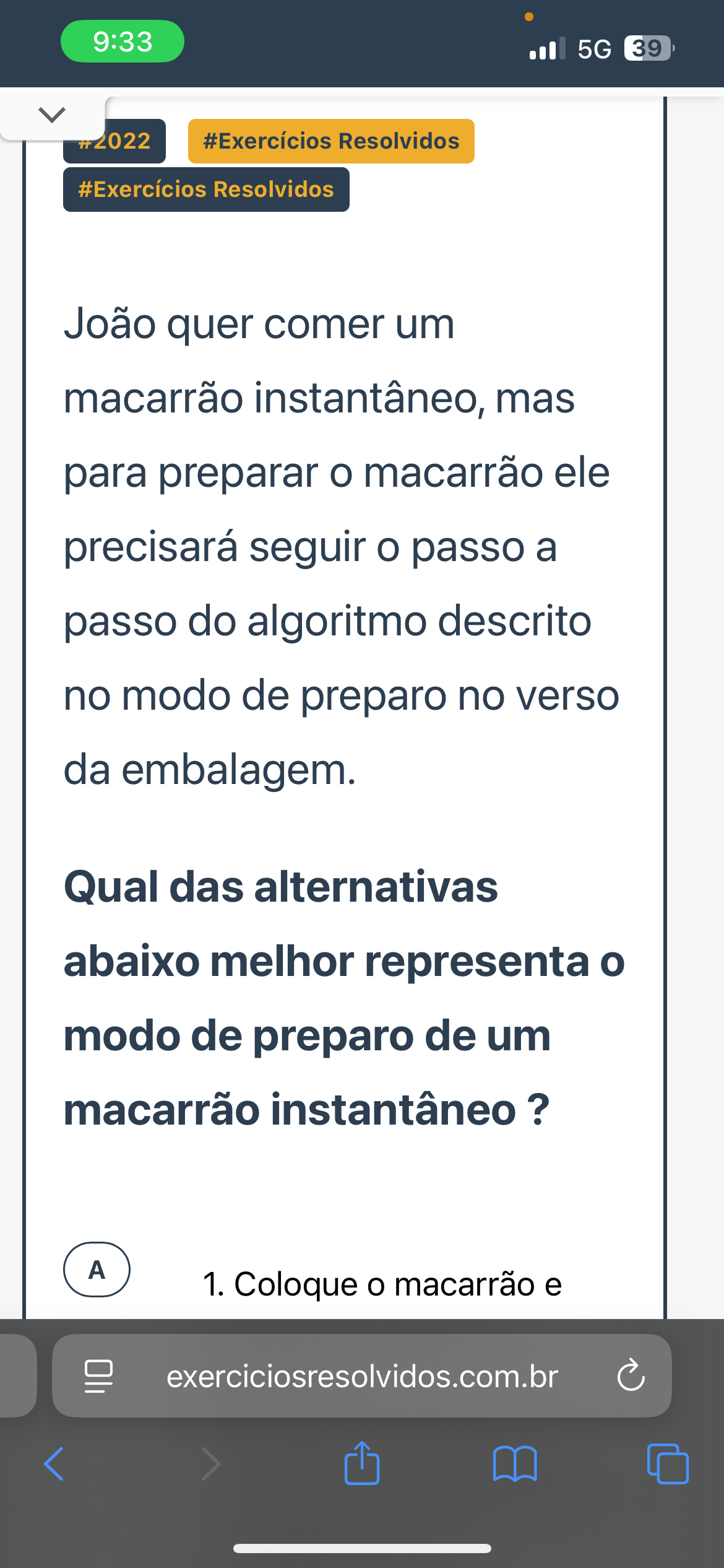 9:33 5G 39 2022 #Exercícios Resolvidos #Exercícios Resolvidos João quer comer um macarrão instantâneo, mas para preparar macarrão ele precisará seguir passo a passo do algoritmo descrito no modo de preparo no verso da embalagem. Qual das alternativas abaixo melhor representa modo de preparo de um macarrão instantâneo ? A 1. Coloque macarrão e exerciciosresolvidos.com.br