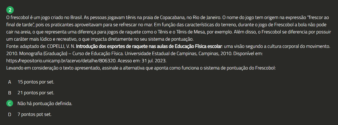 2 0 frescobol é um jogo criado no Brasil. As pessoas jogavam tênis na praia de Copacabana, no Rio de Janeiro. 0 nome do jogo tem origem na expressão "frescor ao final de tarde", pois praticantes aproveitavam para se refrescar no mar. Em função das características do terreno, durante 0 jogo de Frescobol a bola não pode cair na areia, 0 que representa uma diferença para jogos de raquete como 0 Tênis e 0 Tênis de Mesa, por exemplo. Além disso, 0 Frescobol se diferencia por possuir um caráter mais lúdico e recreativo, 0 que impacta diretamente no seu sistema de pontuação. Fonte: adaptado de: COPELLI, V.N. Introdução dos esportes de raquete nas aulas de Educação Física escolar: uma visão segundo a cultura corporal do movimento. 2010. Monografia (Graduação) - Curso de Educação Física. Universidade Estadual de Campinas, Campinas, 2010. Disponível em: https:/repositorio.unicamp.br/acervo/detalhe/806320. Acesso em: 31 jul. 2023. Levando em consideração texto apresentado, assinale a alternativa que aponta como funciona 0 sistema de pontuação do Frescobol: A 15 pontos por set. B 21 pontos por set. Não há pontuação definida. D 7 pontos pot set.